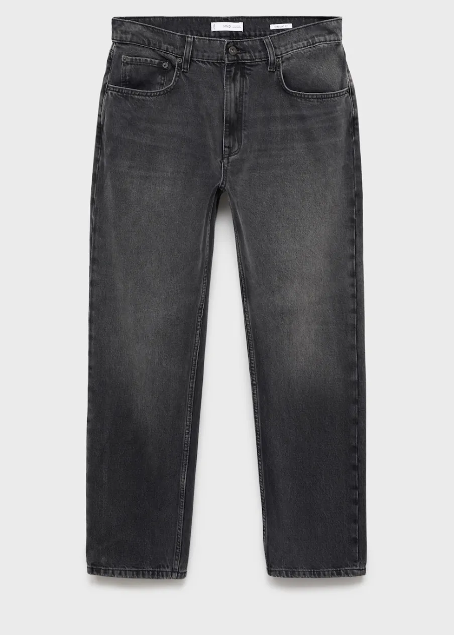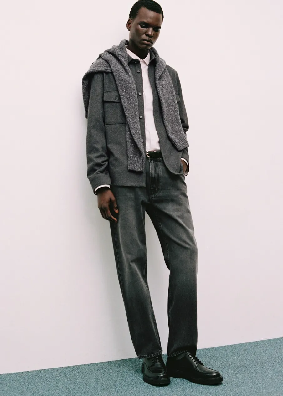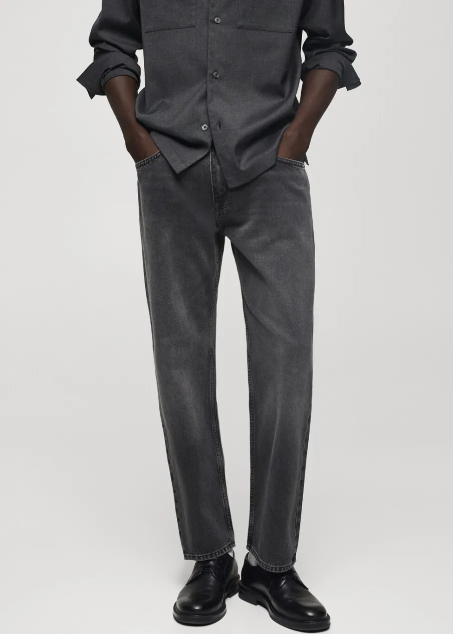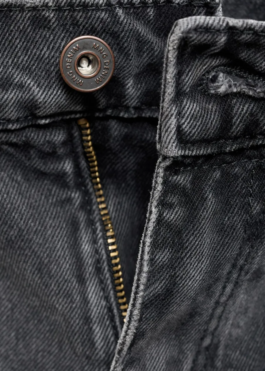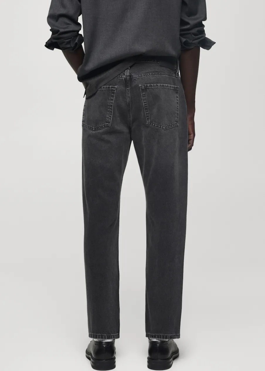 Straight-fit. Kolor ciemnoszary z efektem sprania. Bawełna 100%. Szlufki na pasek. Dwie kieszenie z przodu. Kieszonka na monety na wysokości biodra. Dwie kieszenie nakładane z tyłu. Model ma 190 cm wzrostu i nosi rozmiar 42. Zapięcie na zamek i guzik z przodu.
