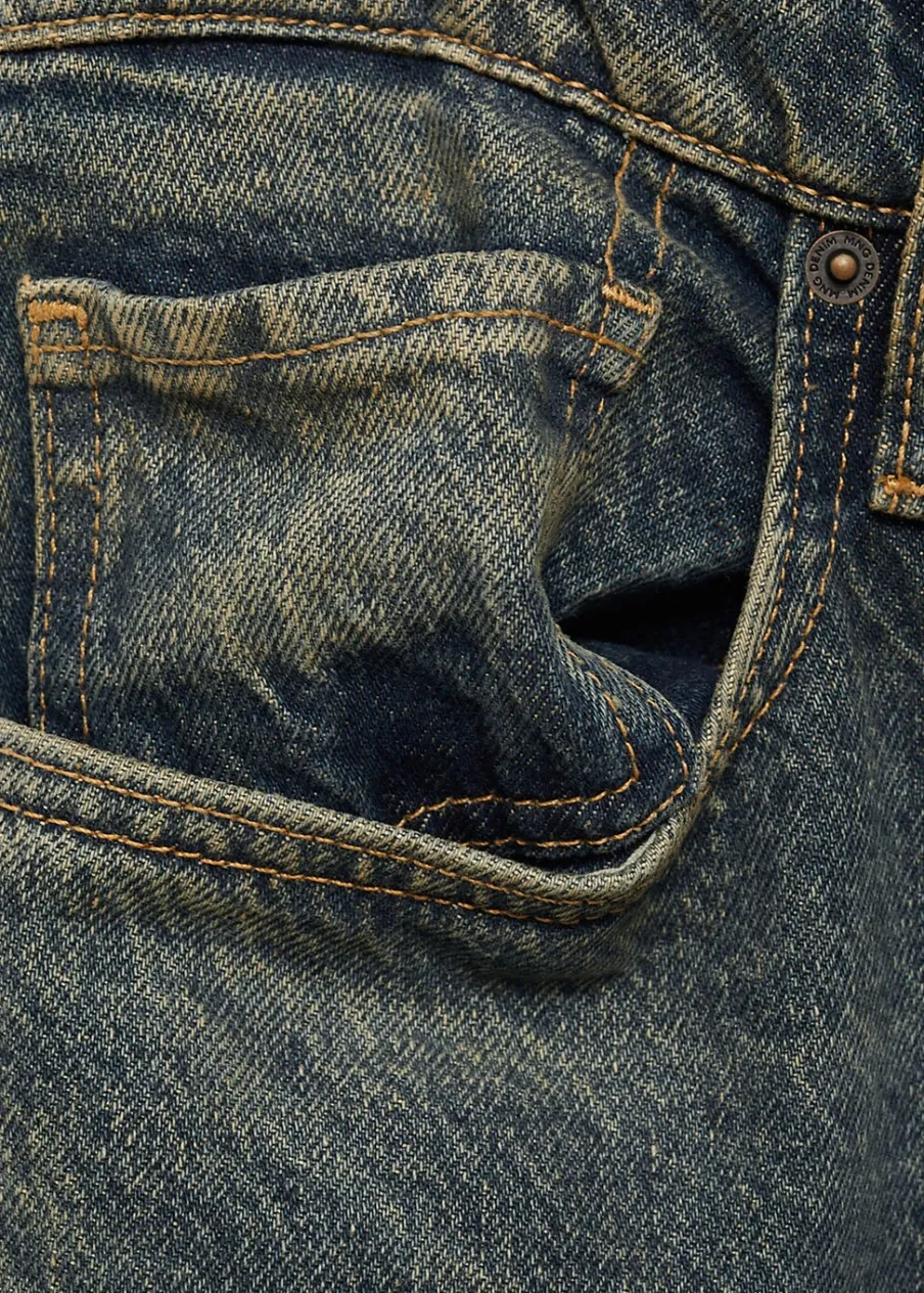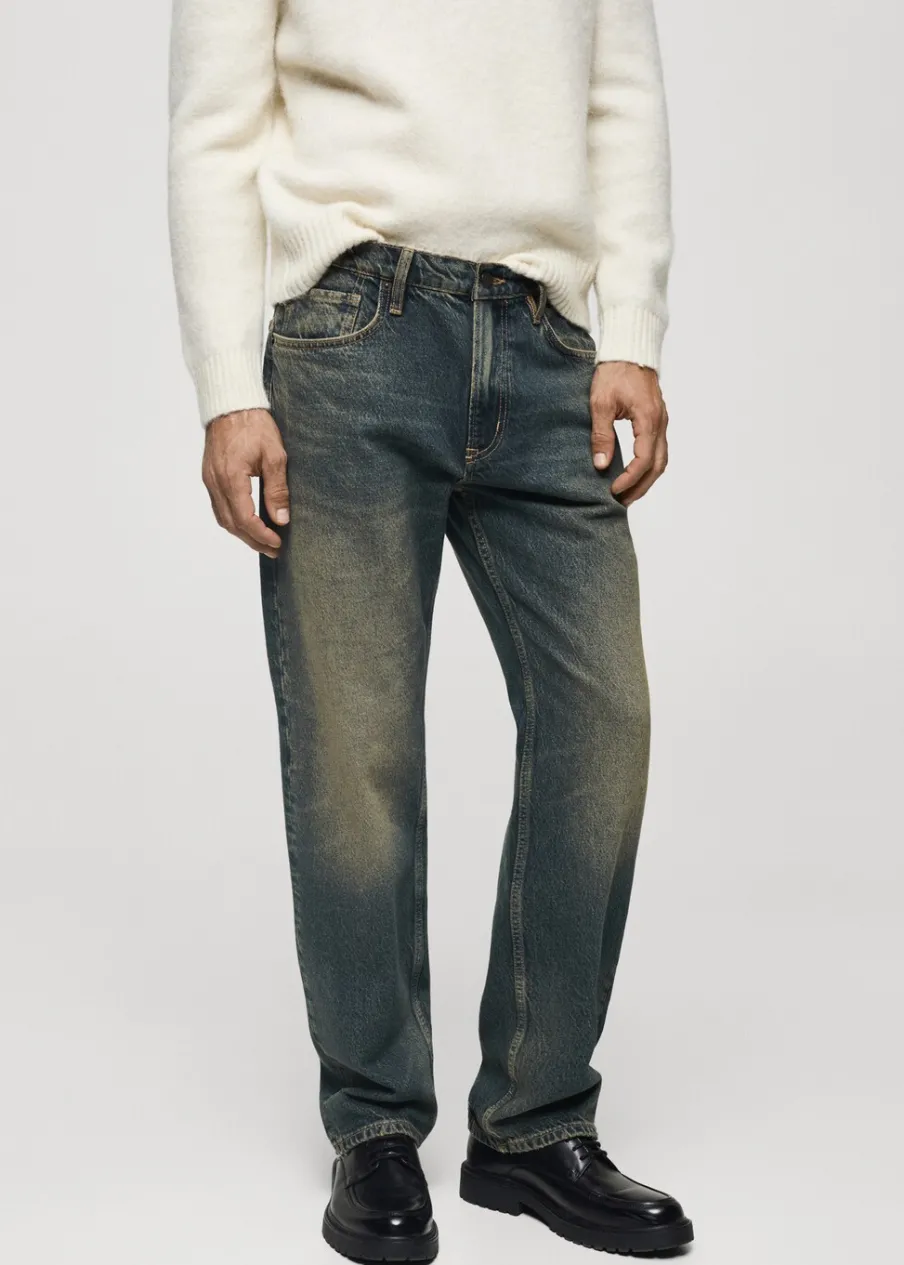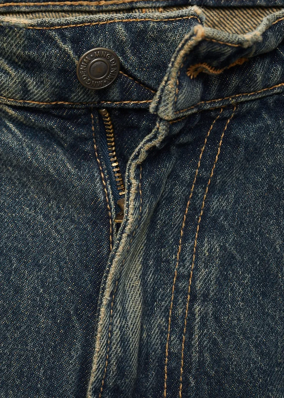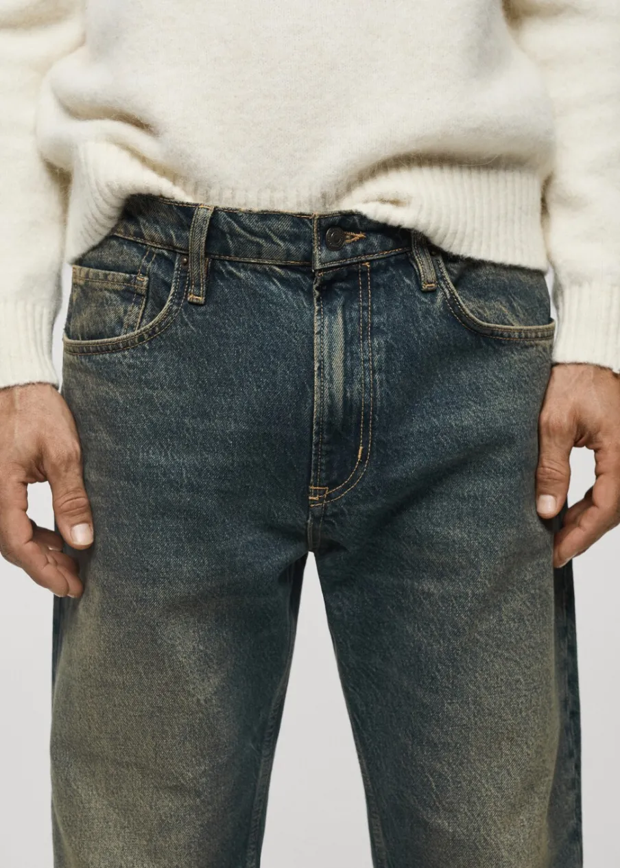 Prosty krój. Bawełniana tkanina. Wytarty efekt. Zapięcie na suwak i guzik. Dwie kieszenie boczne. Dwie kieszenie nakładane z tyłu. Model ma 185 cm wzrostu i nosi rozmiar 42. Kieszeń na bilon.