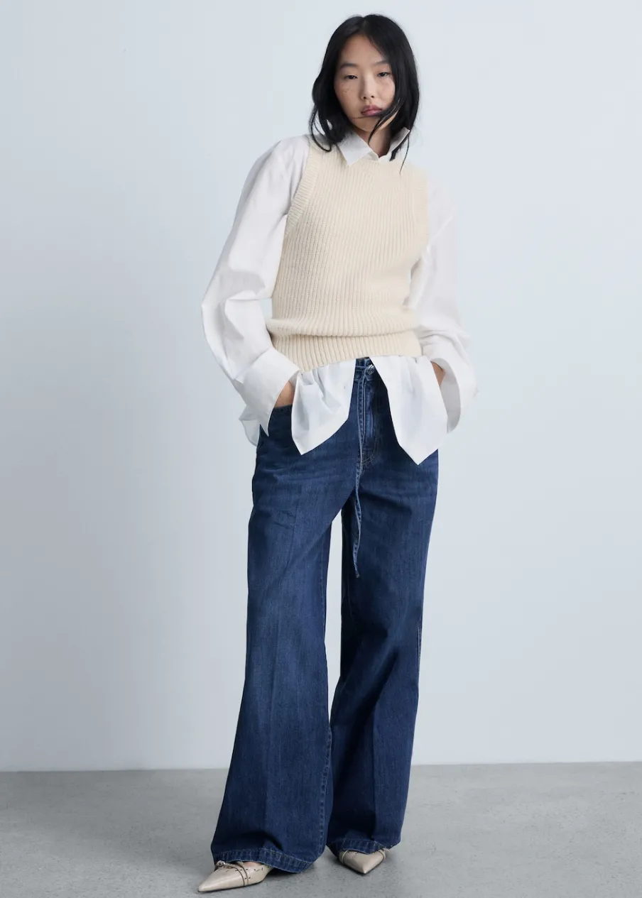 Tkanina bawełniana w dżinsowym stylu. Fason wideleg. Model długi. Średni stan. Szlufki. Regulowany pasek. Pięć kieszeni. Zapięcie na zamek i guzik z przodu. Długość wewnętrzna 78 cm.