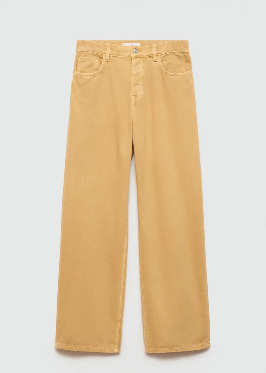 Tkanina bawełniana w dżinsowym stylu. Średni stan. Model długi. Fason wideleg. Pięć kieszeni. Szlufki. Długość wewnętrzna 78 cm. Krój loose. Kryte zapięcie na guziki z przodu.