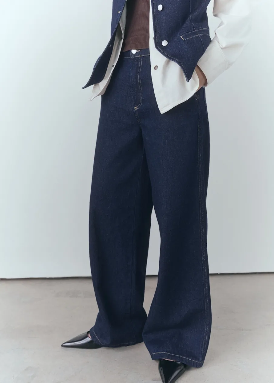 OpisTkanina bawełniana w dżinsowym stylu. Fason wideleg. Rinse wash. Szeroka cholewka. Model długi. Średni stan. Szl…