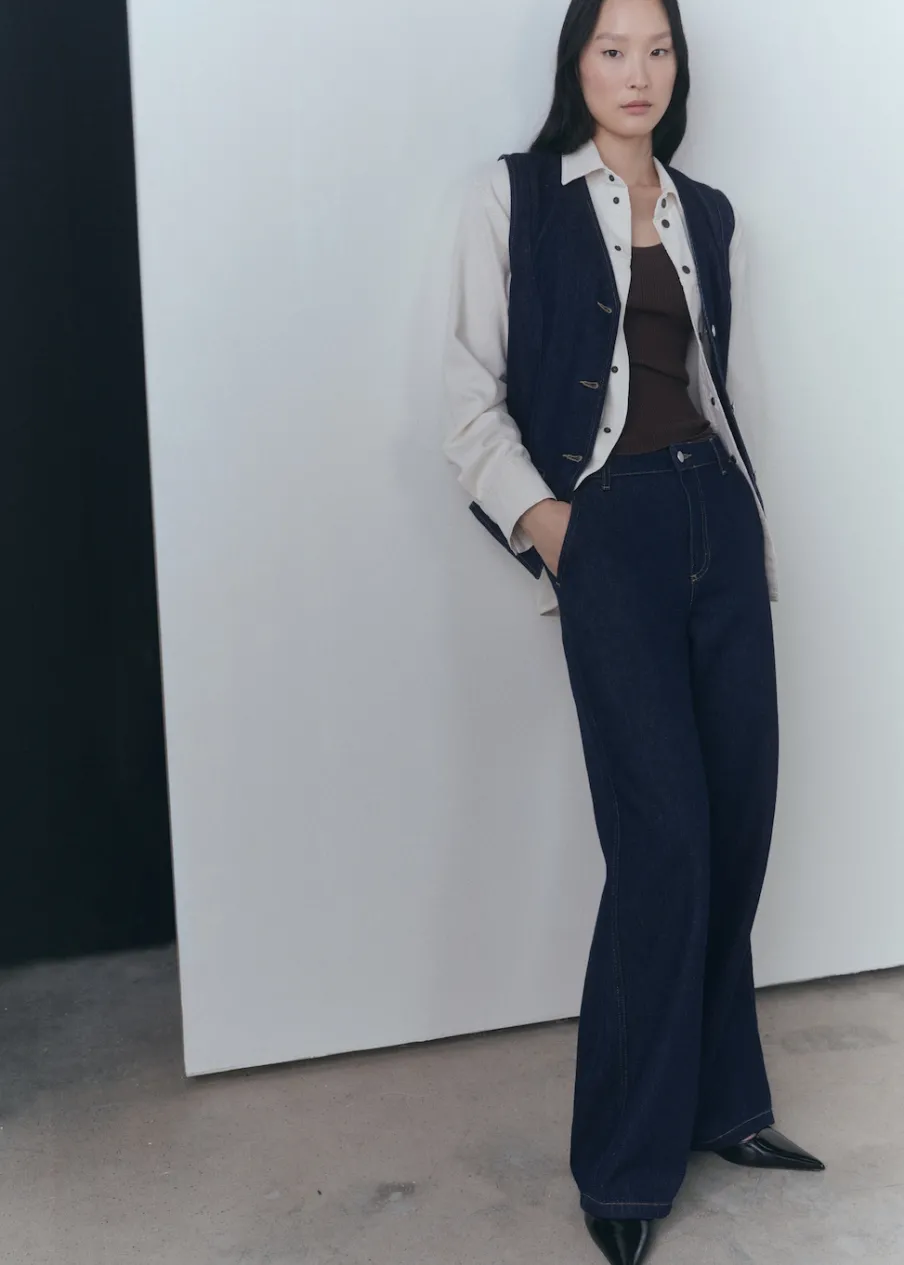 Tkanina bawełniana w dżinsowym stylu. Fason wideleg. Rinse wash. Szeroka cholewka. Model długi. Średni stan. Szlufki. Pięć kieszeni. Zapięcie na zamek i guzik z przodu. Total look. Modelka ma 175 cm wzrostu i nosi rozmiar S/36.