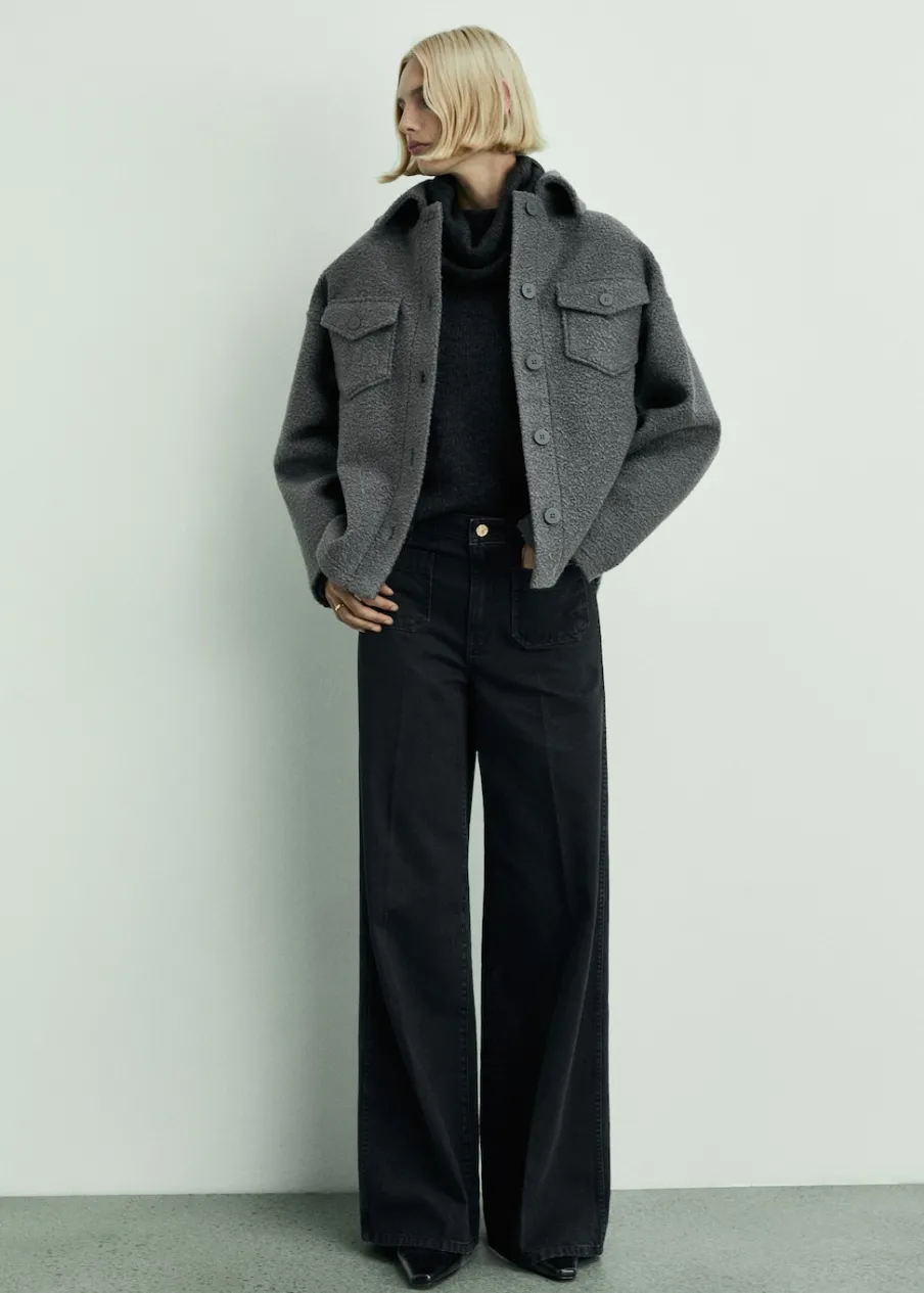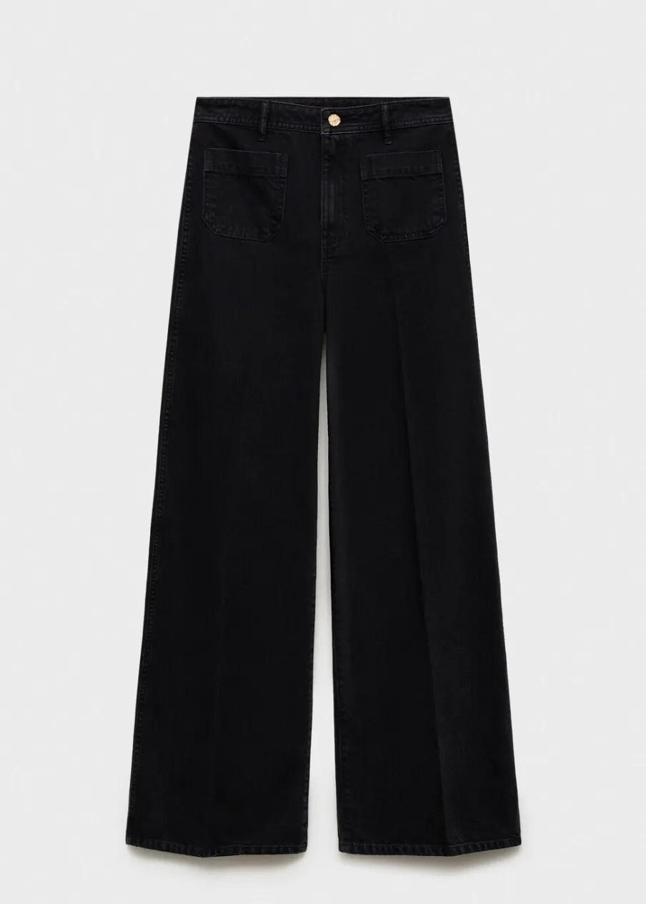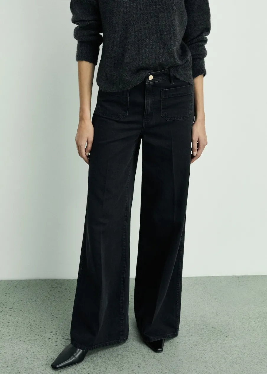 Tkanina bawełniana w dżinsowym stylu. Fason wideleg. Szeroka cholewka. Model długi. Podwyższony stan. Szlufki. Dwie kieszenie nakładane z przodu. Zapięcie na zamek i guzik z przodu. Długość wewnętrzna 85 cm. Modelka ma 179 cm wzrostu i nosi rozmiar S/36.