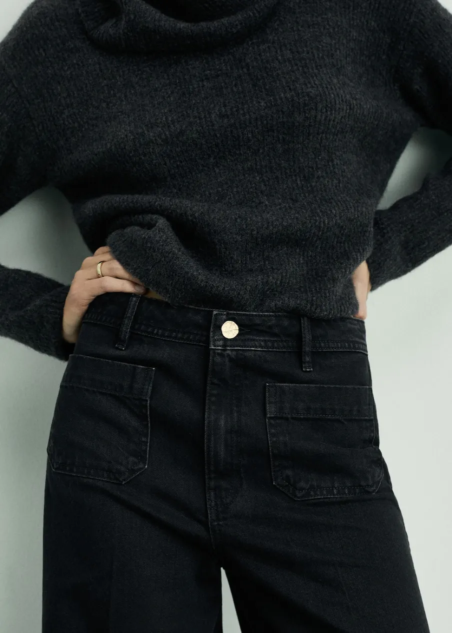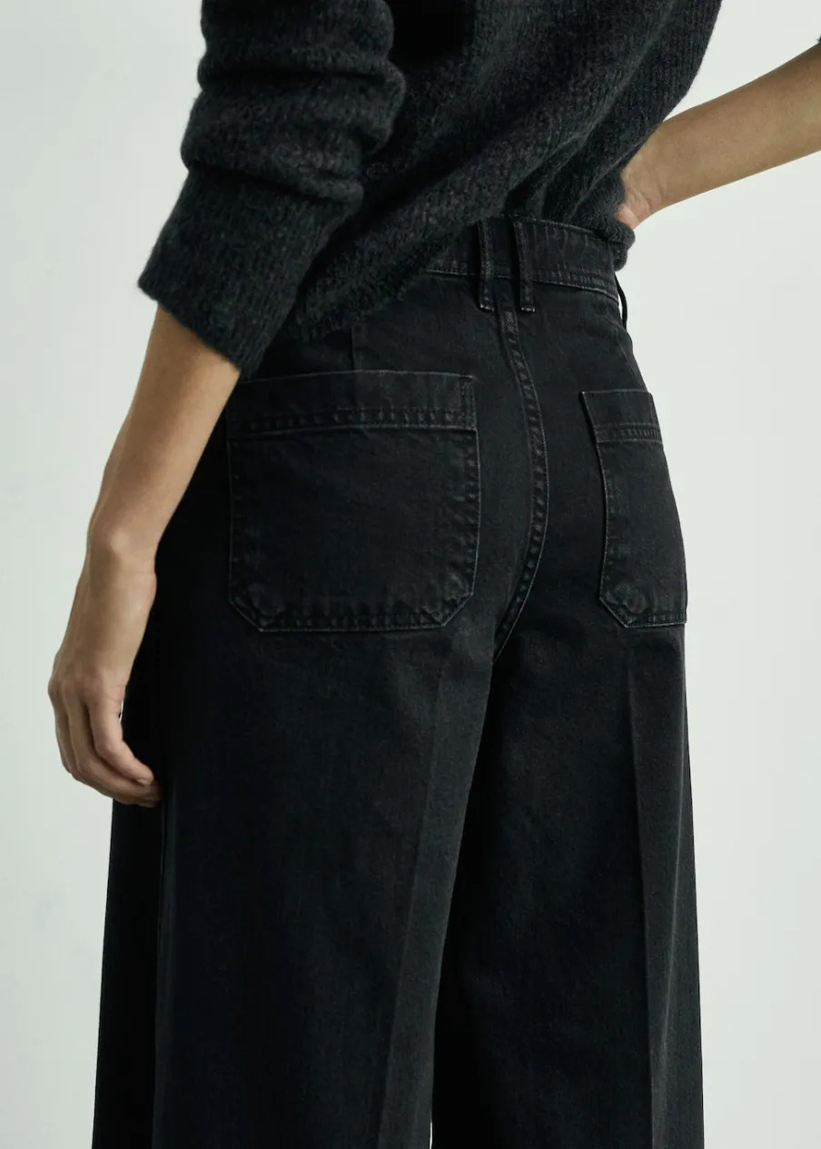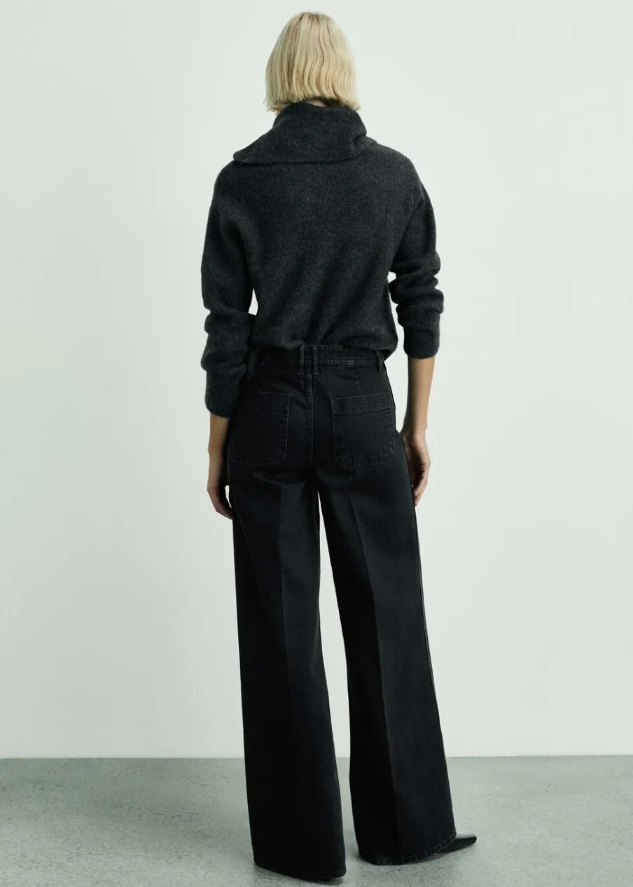 Tkanina bawełniana w dżinsowym stylu. Fason wideleg. Szeroka cholewka. Model długi. Podwyższony stan. Szlufki. Dwie kieszenie nakładane z przodu. Zapięcie na zamek i guzik z przodu. Długość wewnętrzna 85 cm. Modelka ma 179 cm wzrostu i nosi rozmiar S/36.