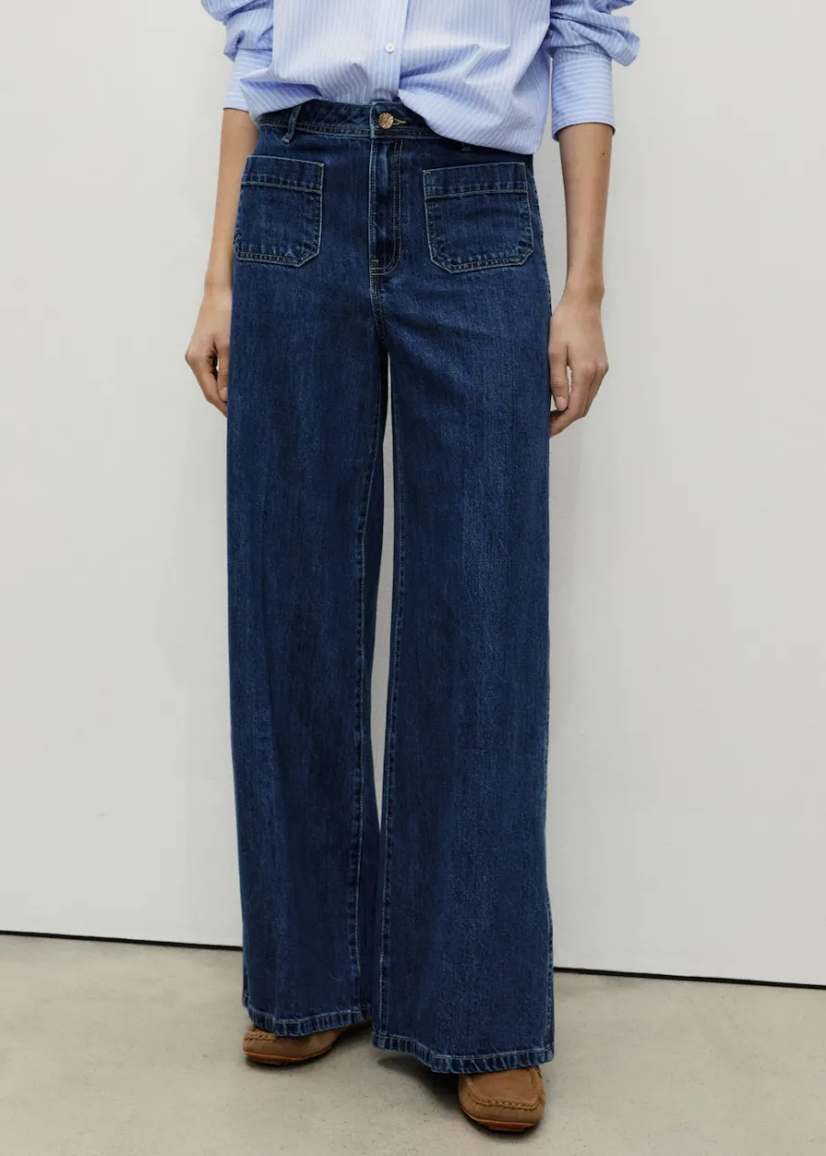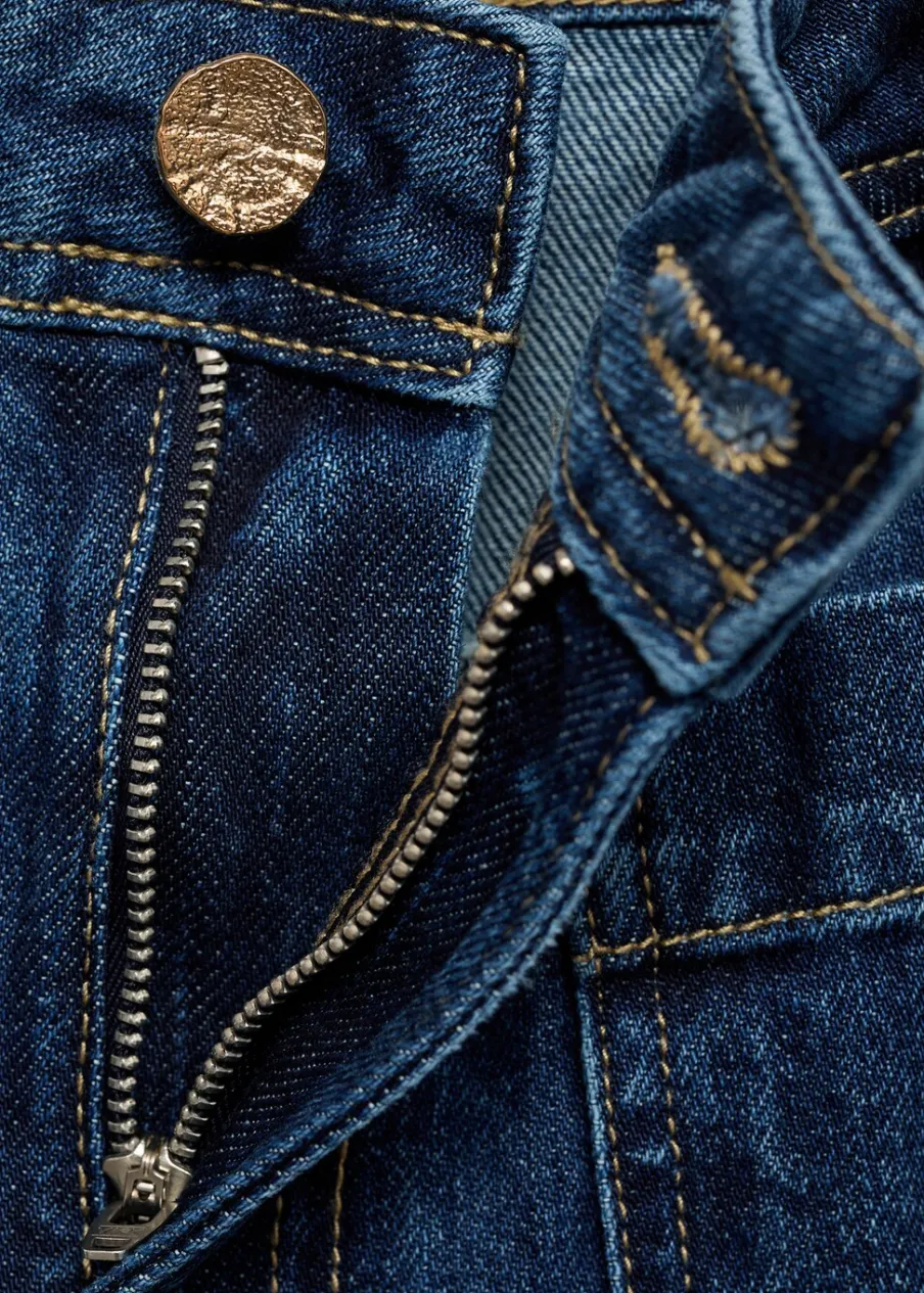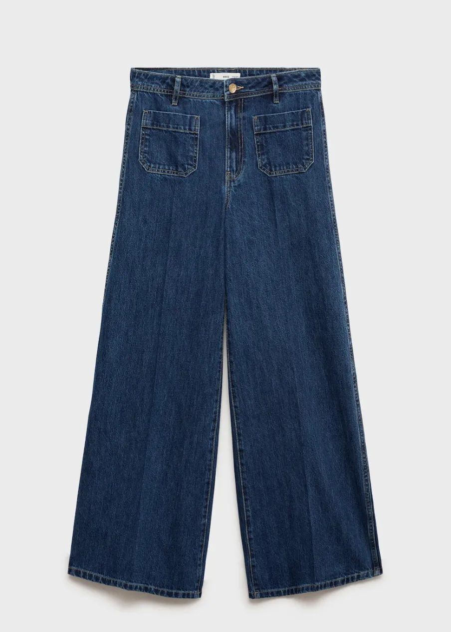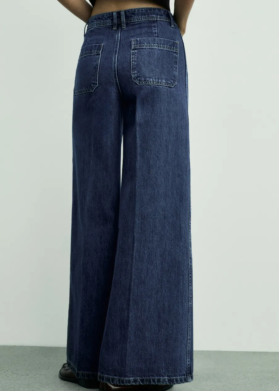 OpisTkanina bawełniana w dżinsowym stylu. Fason wideleg. Model długi. Szeroka cholewka. Podwyższony stan. Szlufki. K…