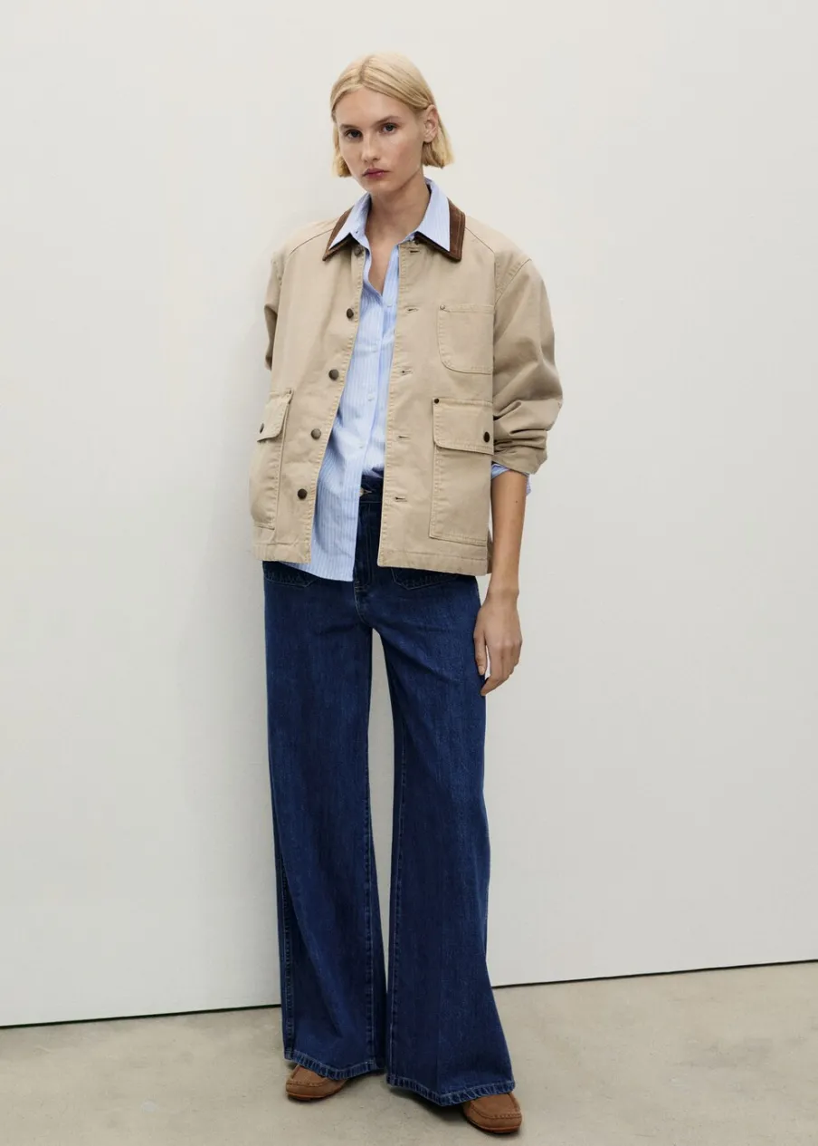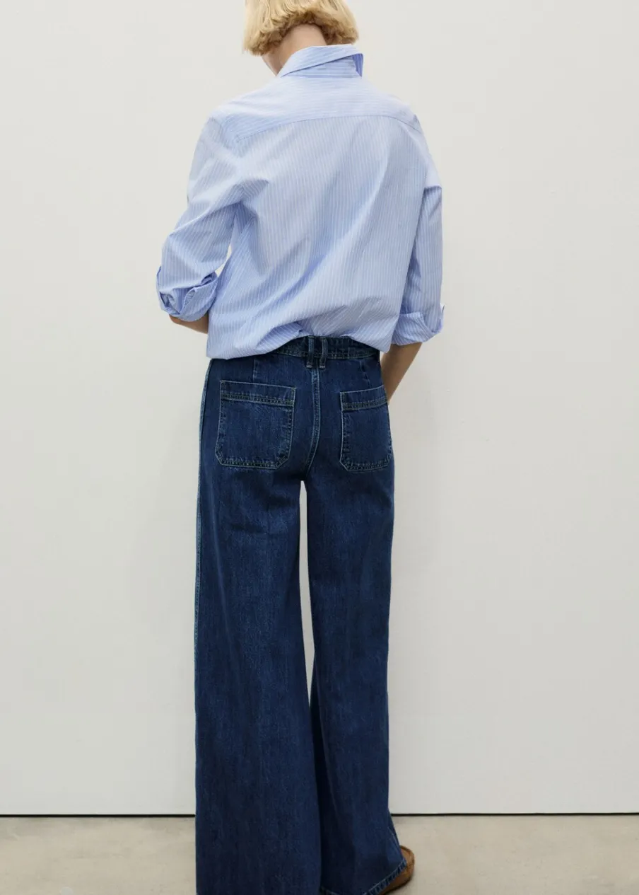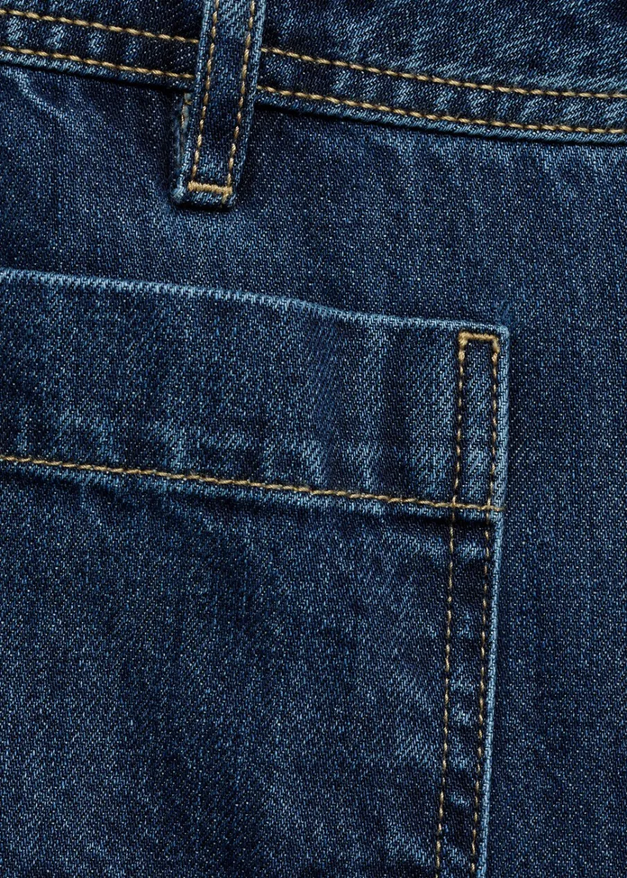 Tkanina bawełniana w dżinsowym stylu. Fason wideleg. Model długi. Szeroka cholewka. Podwyższony stan. Szlufki. Kieszenie nakładane. Zapięcie na suwak i guzik. Długość wewnętrzna 85 cm. Modelka ma 179 cm wzrostu i nosi rozmiar S/36.