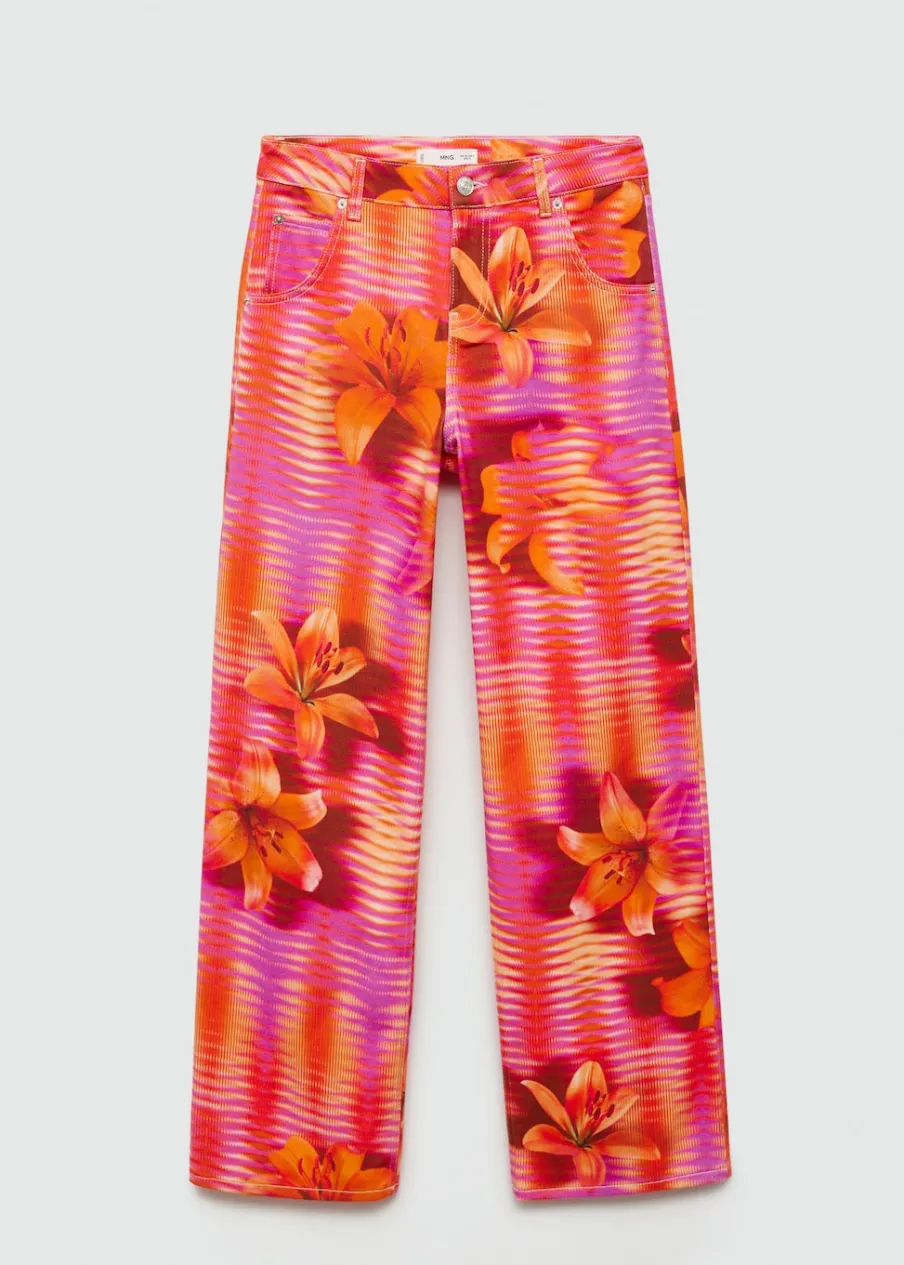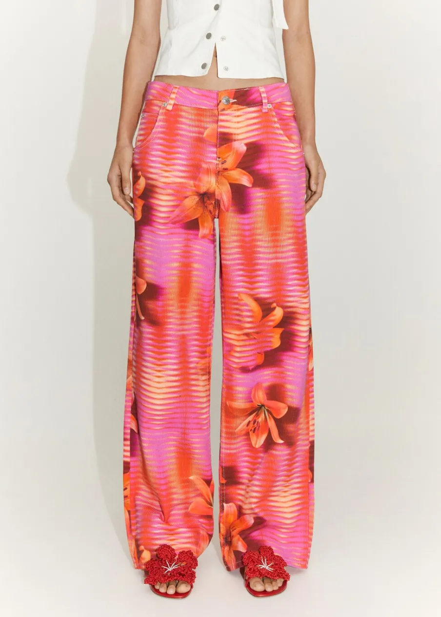 Tkanina bawełniana w dżinsowym stylu. Średni stan. Model długi. Fason wideleg. Wzór w pasy. Wzór w kwiaty. Dwie kieszenie z przodu. Kieszeń na bilon. Dwie kieszenie nakładane z tyłu. Szlufki. Zapięcie na suwak i guzik. Nadruk.