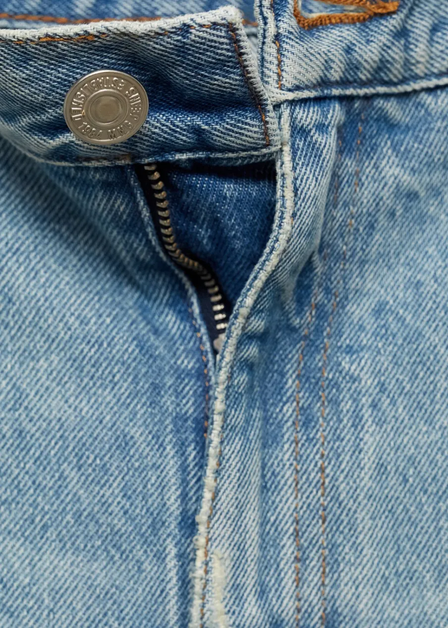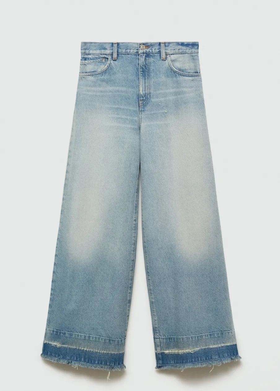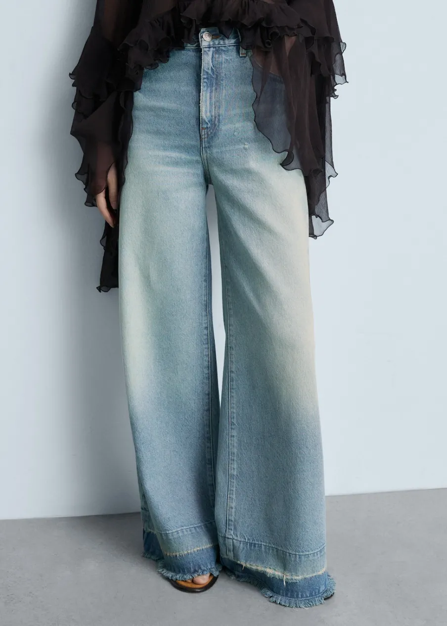 Tkanina bawełniana w dżinsowym stylu. Średni stan. Fason wideleg. Model długi. Pięć kieszeni. Szlufki. Zapięcie na suwak i guzik. Postrzępione nogawki. Doszywany dół.