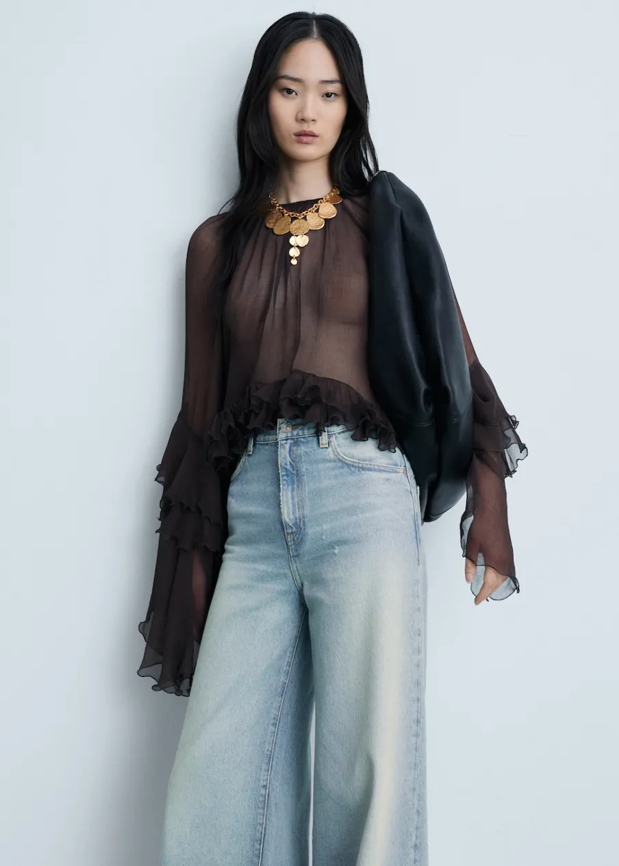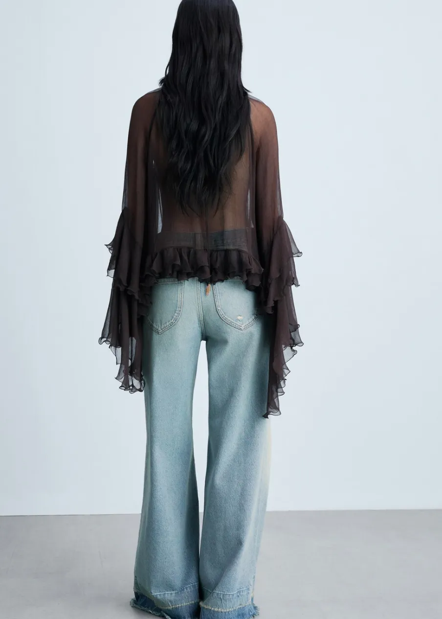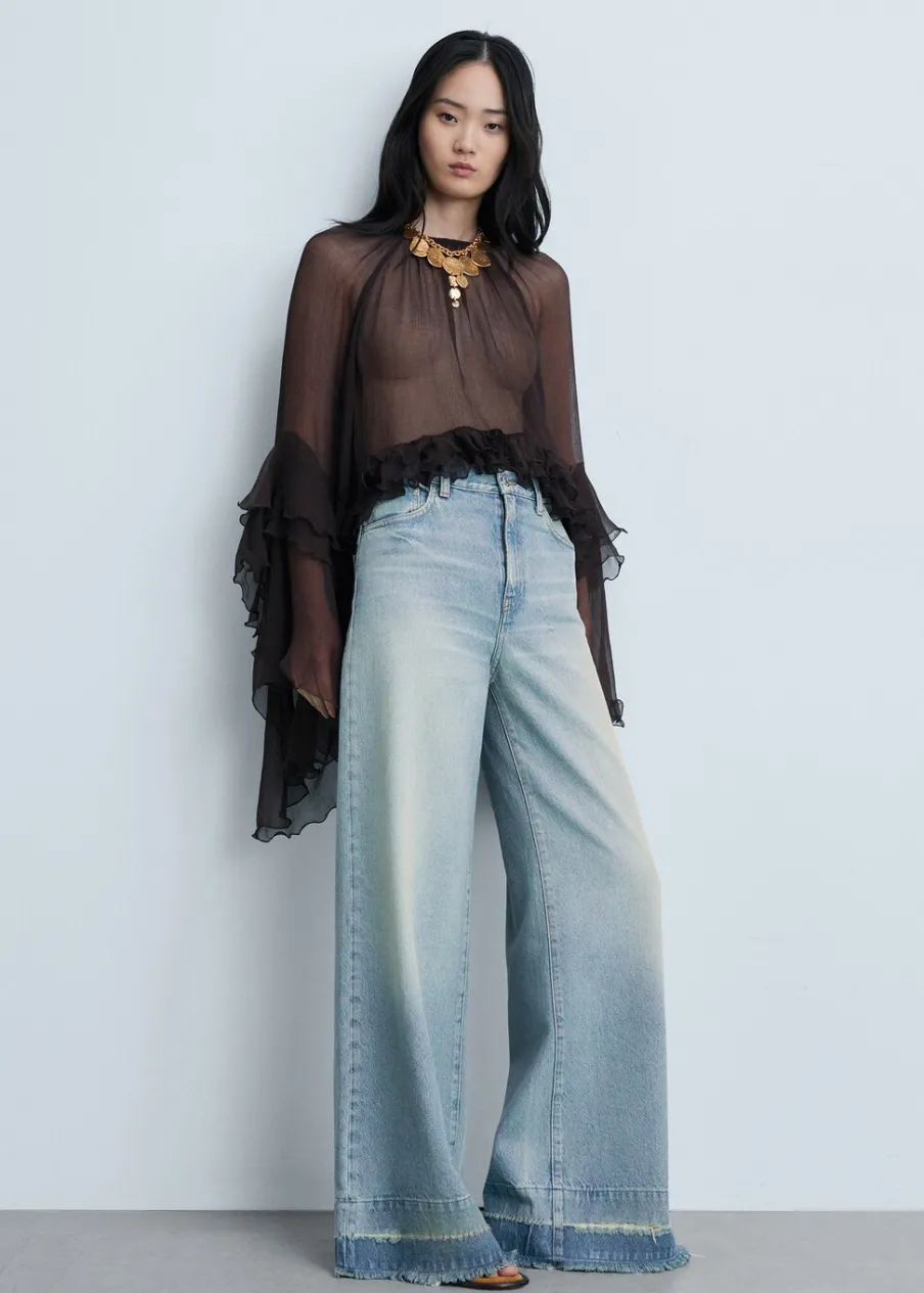 Tkanina bawełniana w dżinsowym stylu. Średni stan. Fason wideleg. Model długi. Pięć kieszeni. Szlufki. Zapięcie na suwak i guzik. Postrzępione nogawki. Doszywany dół.