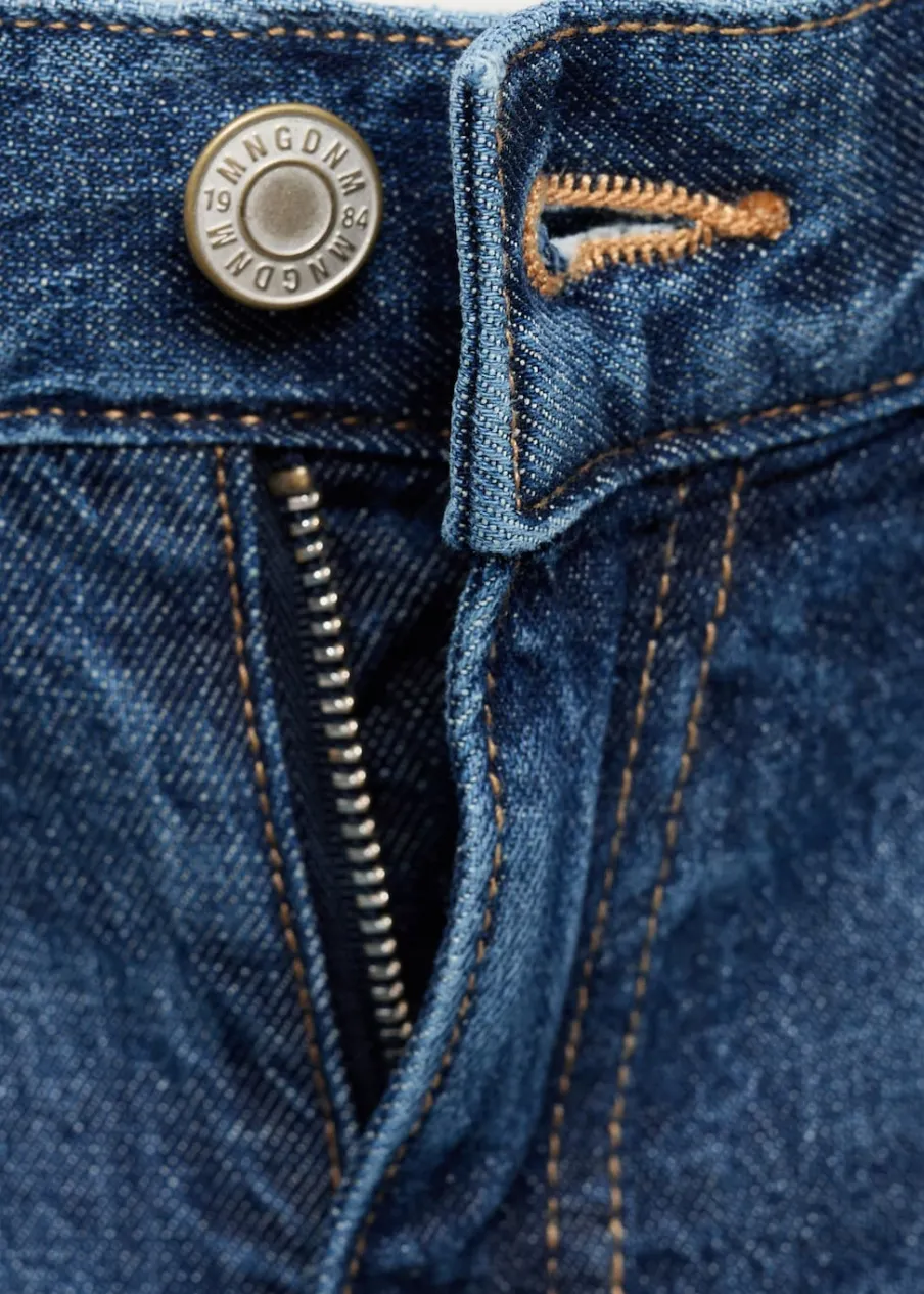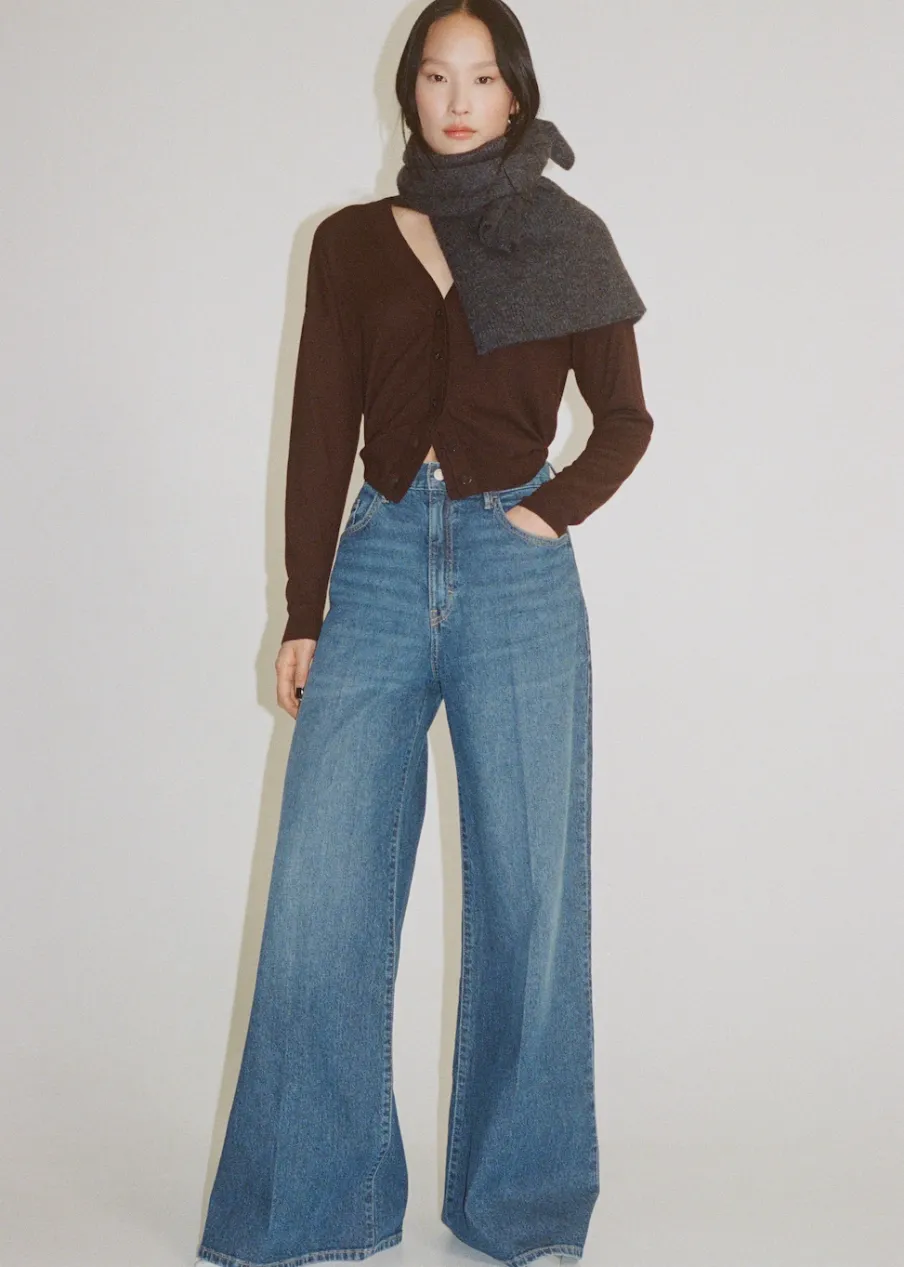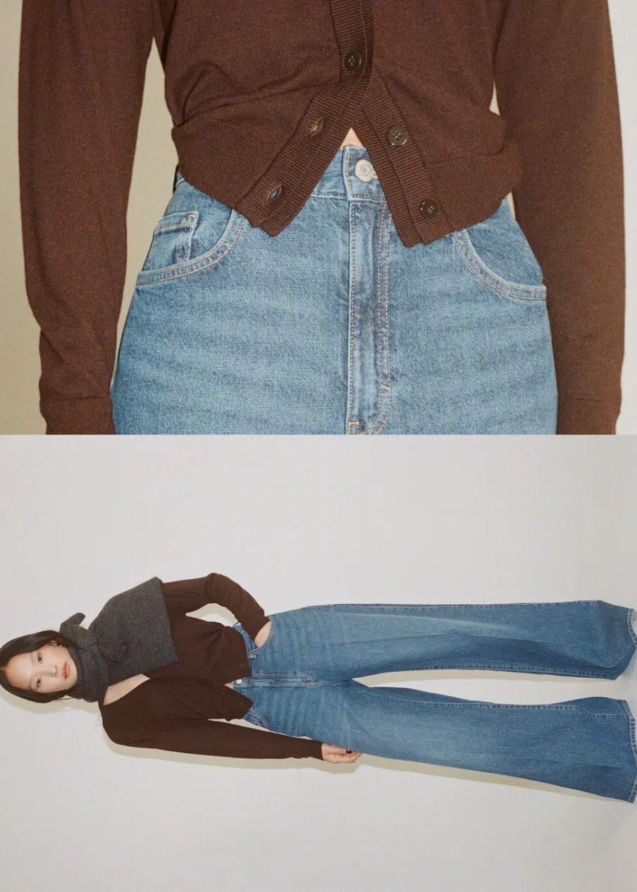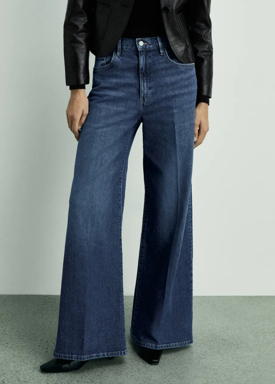 Tkanina bawełniana w dżinsowym stylu. Model długi. Fason wideleg. Podwyższony stan. Szlufki. Pięć kieszeni. Zapięcie na zamek i guzik z przodu. Modelka ma 179 cm wzrostu i nosi rozmiar S/36. Długość wewnętrzna 83 cm.