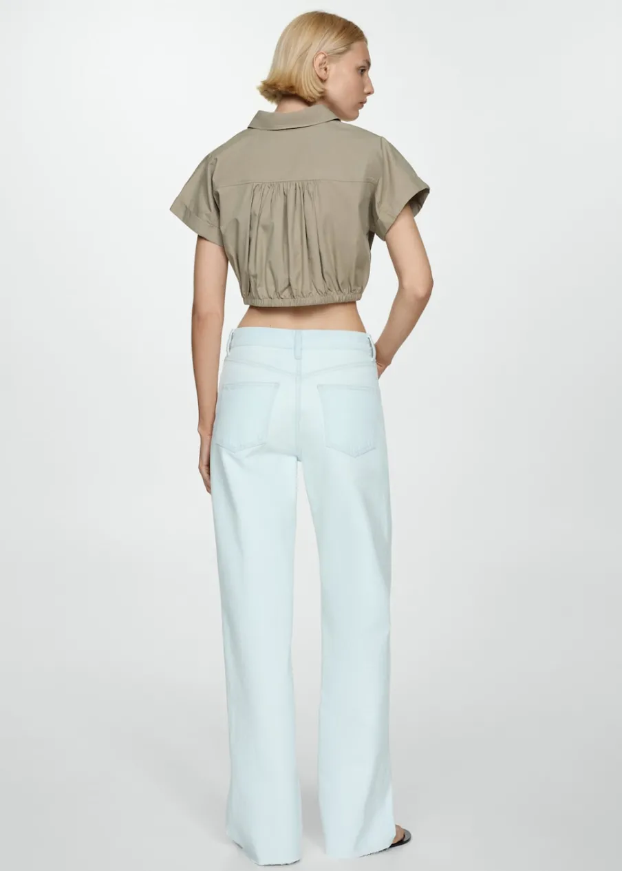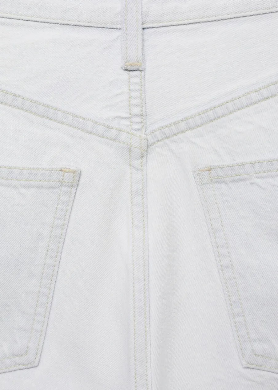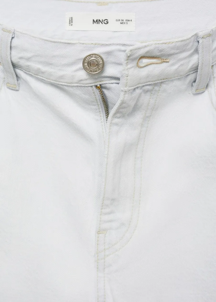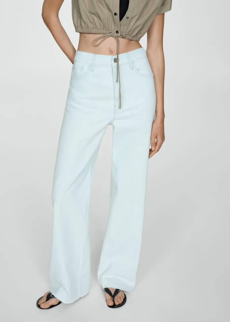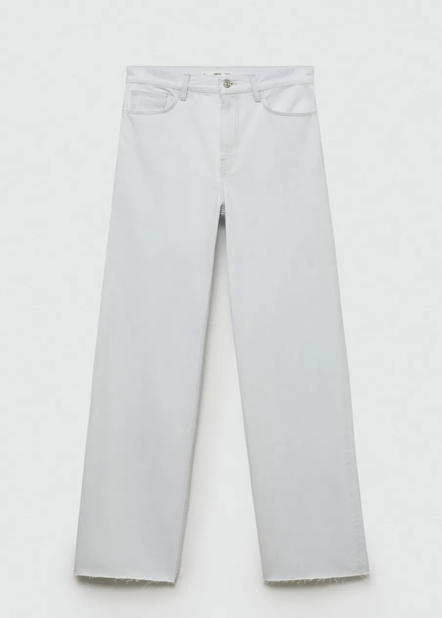 Tkanina bawełniana w dżinsowym stylu. Model długi. Fason wideleg. Podwyższony stan. Szlufki. Dwie kieszenie z przodu. Kieszeń na bilon. Dwie kieszenie nakładane z tyłu. Zapięcie na suwak i guzik. Postrzępione nogawki. Długość wewnętrzna 83 cm.