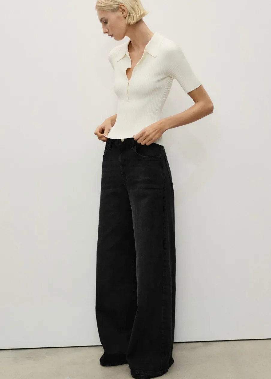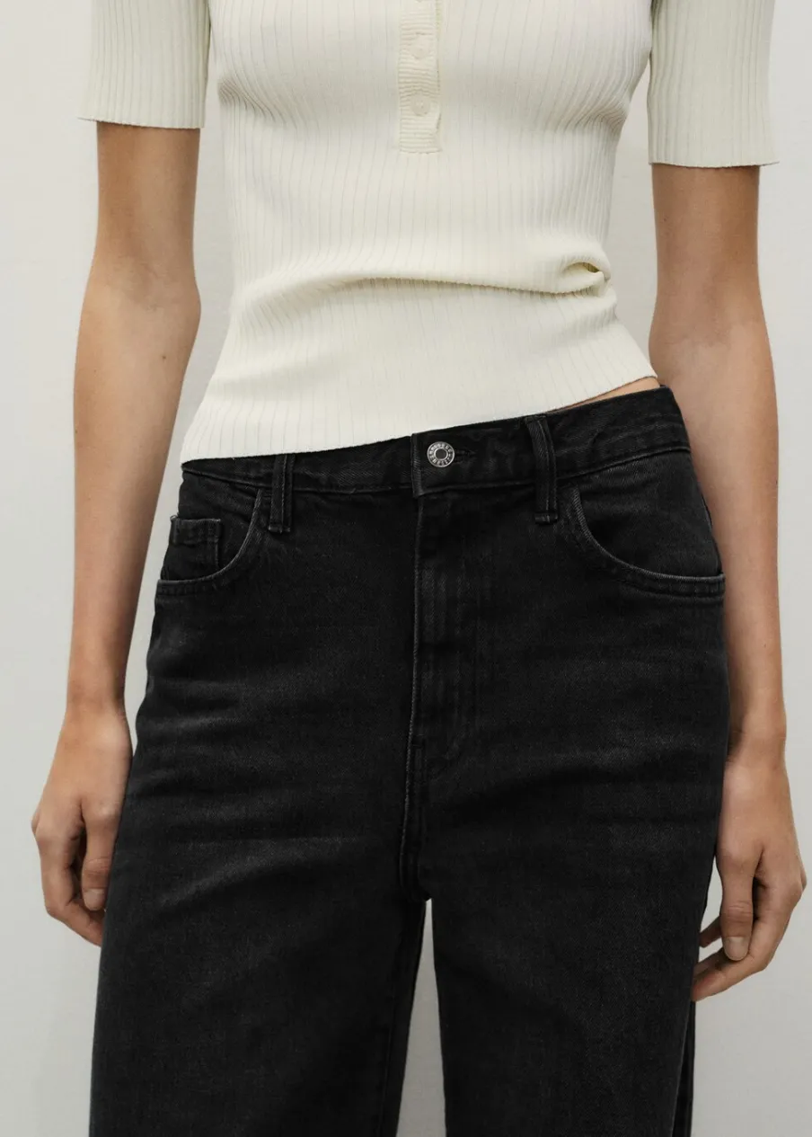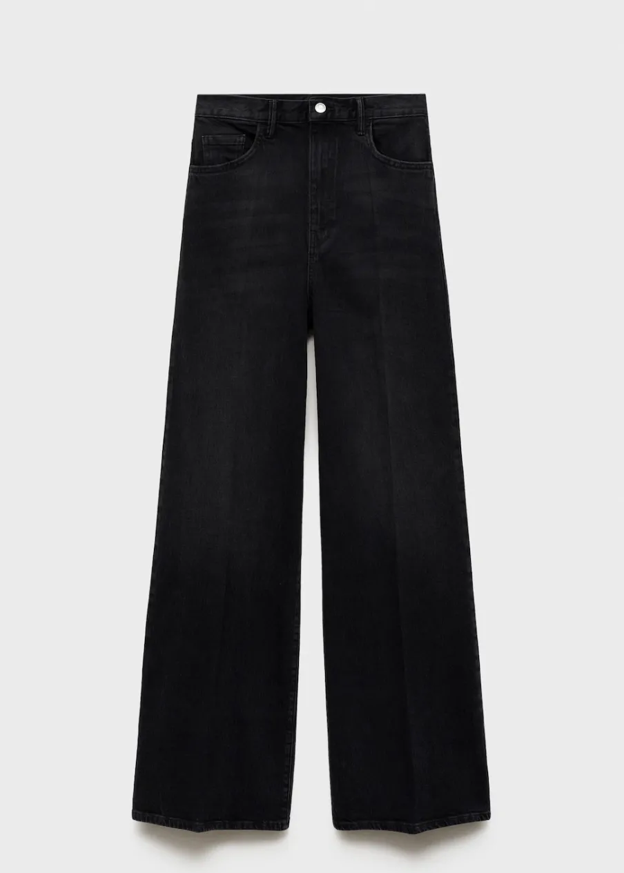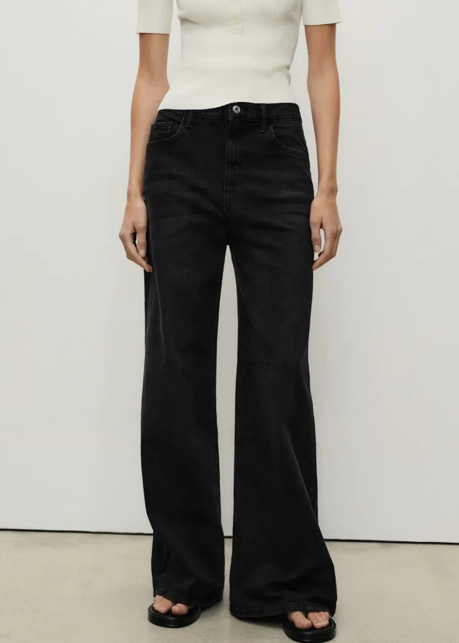 Tkanina bawełniana w dżinsowym stylu. Model długi. Fason wideleg. Podwyższony stan. Szlufki. Pięć kieszeni. Zapięcie na suwak i guzik. Modelka ma 178 cm wzrostu i nosi rozmiar S/36. Długość wewnętrzna 83 cm.