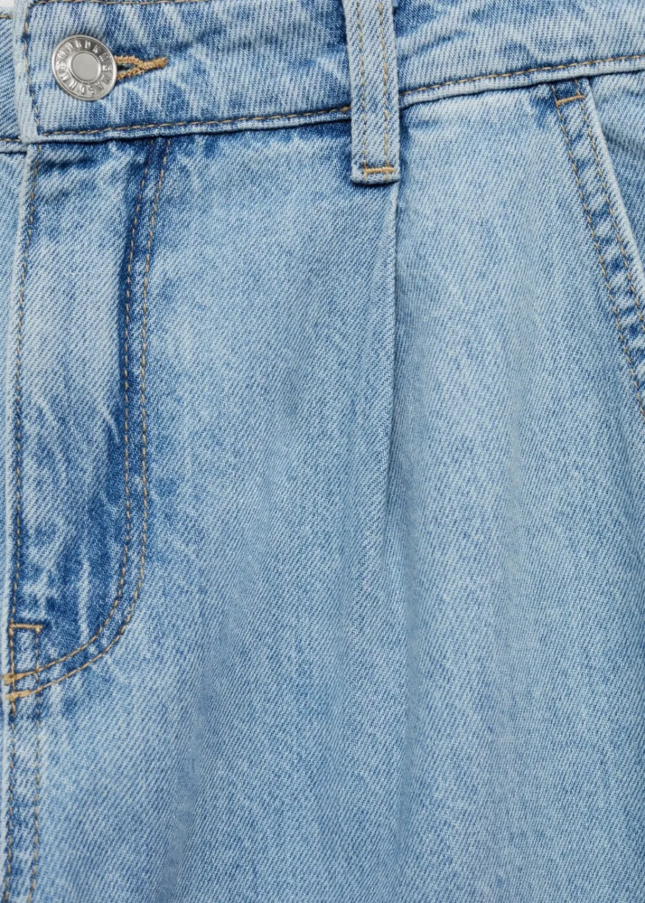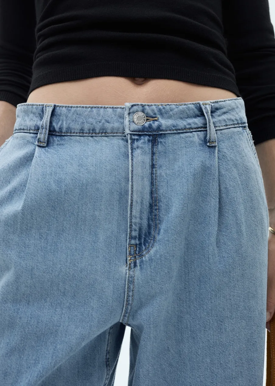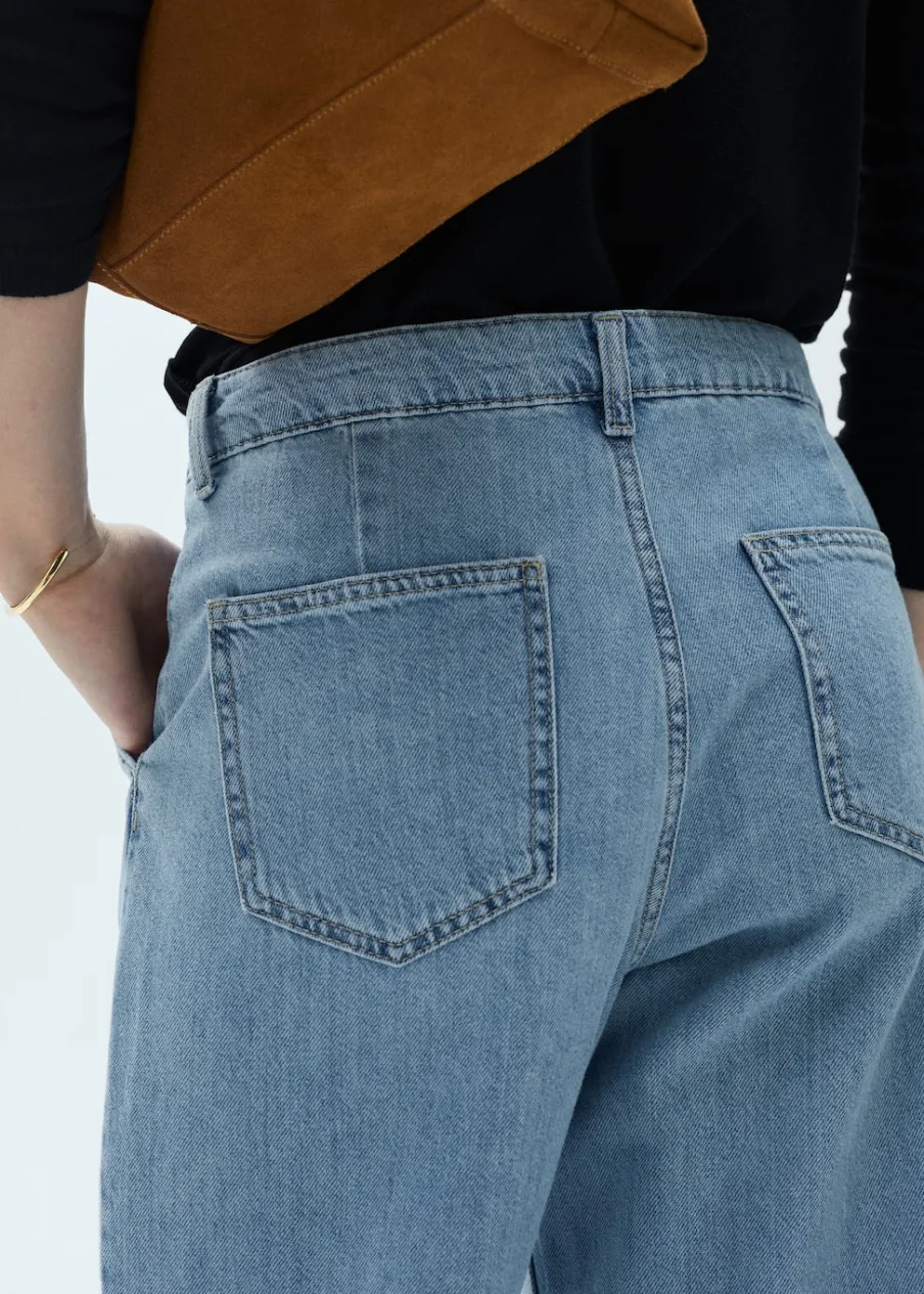 Tkanina bawełniana w dżinsowym stylu. Model prosty. Pełna długość. Średni stan. Szlufki. Dwie kieszenie nakładane z tyłu. Zapięcie na suwak i guzik. Detal z zakładkami. Długość wewnętrzna 80 cm.