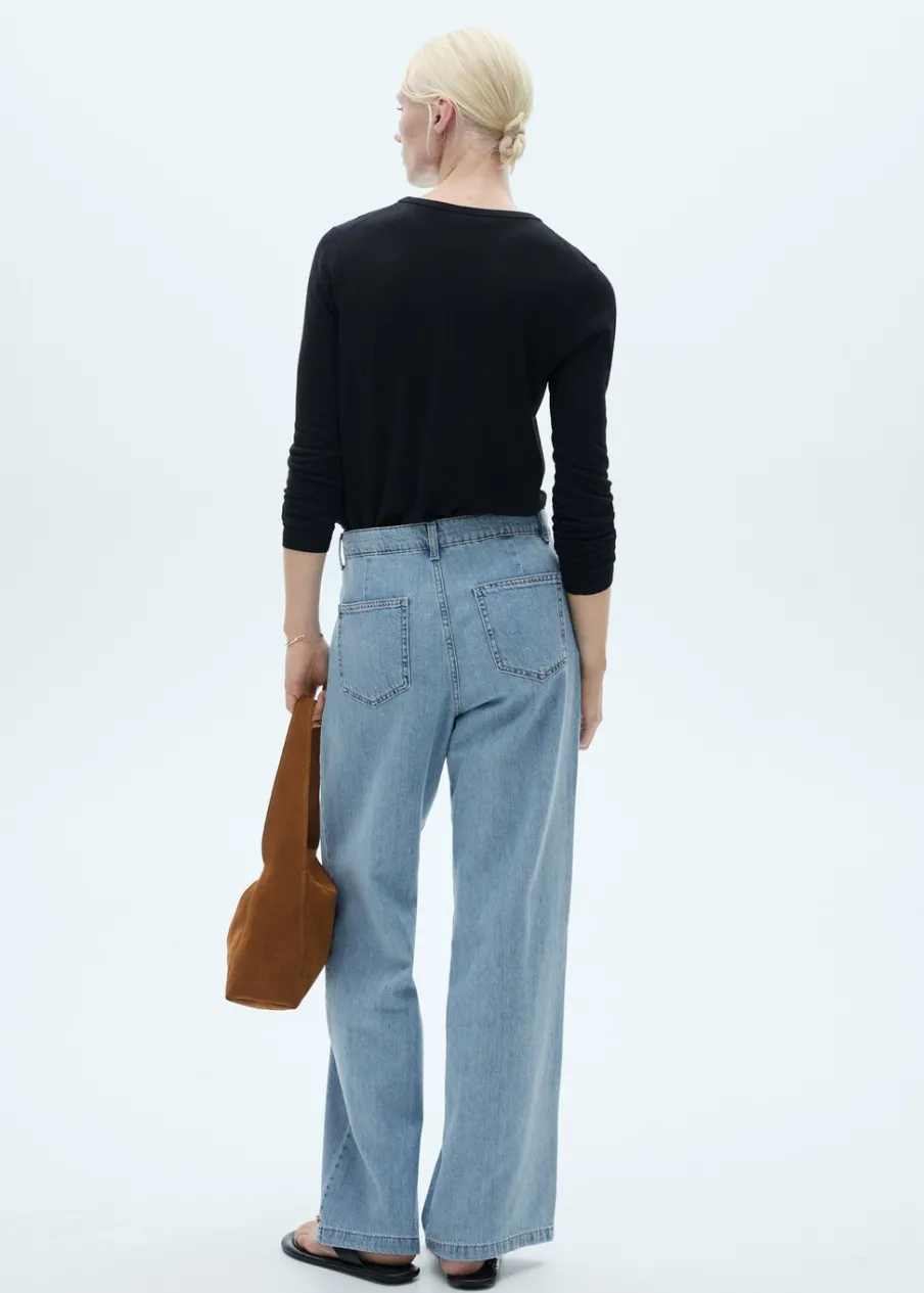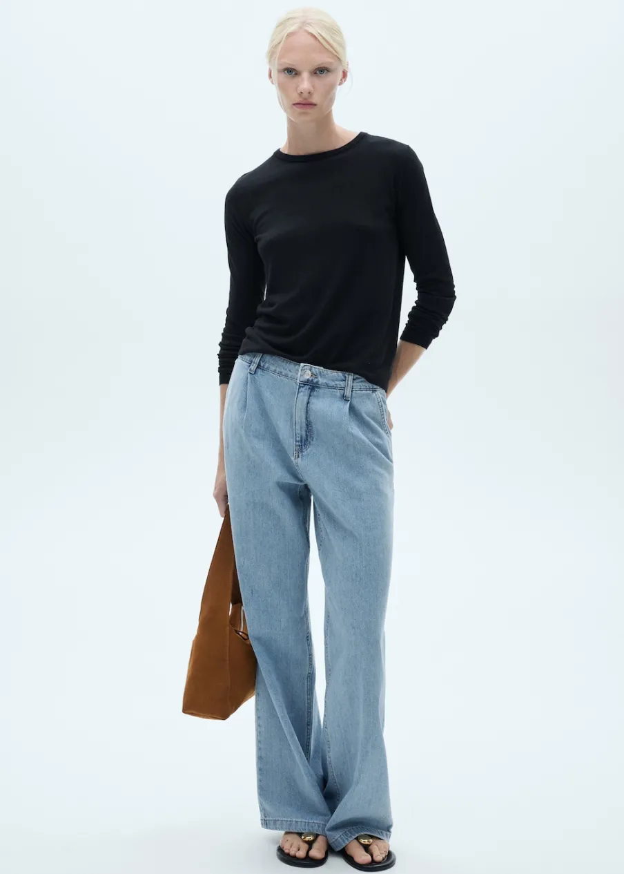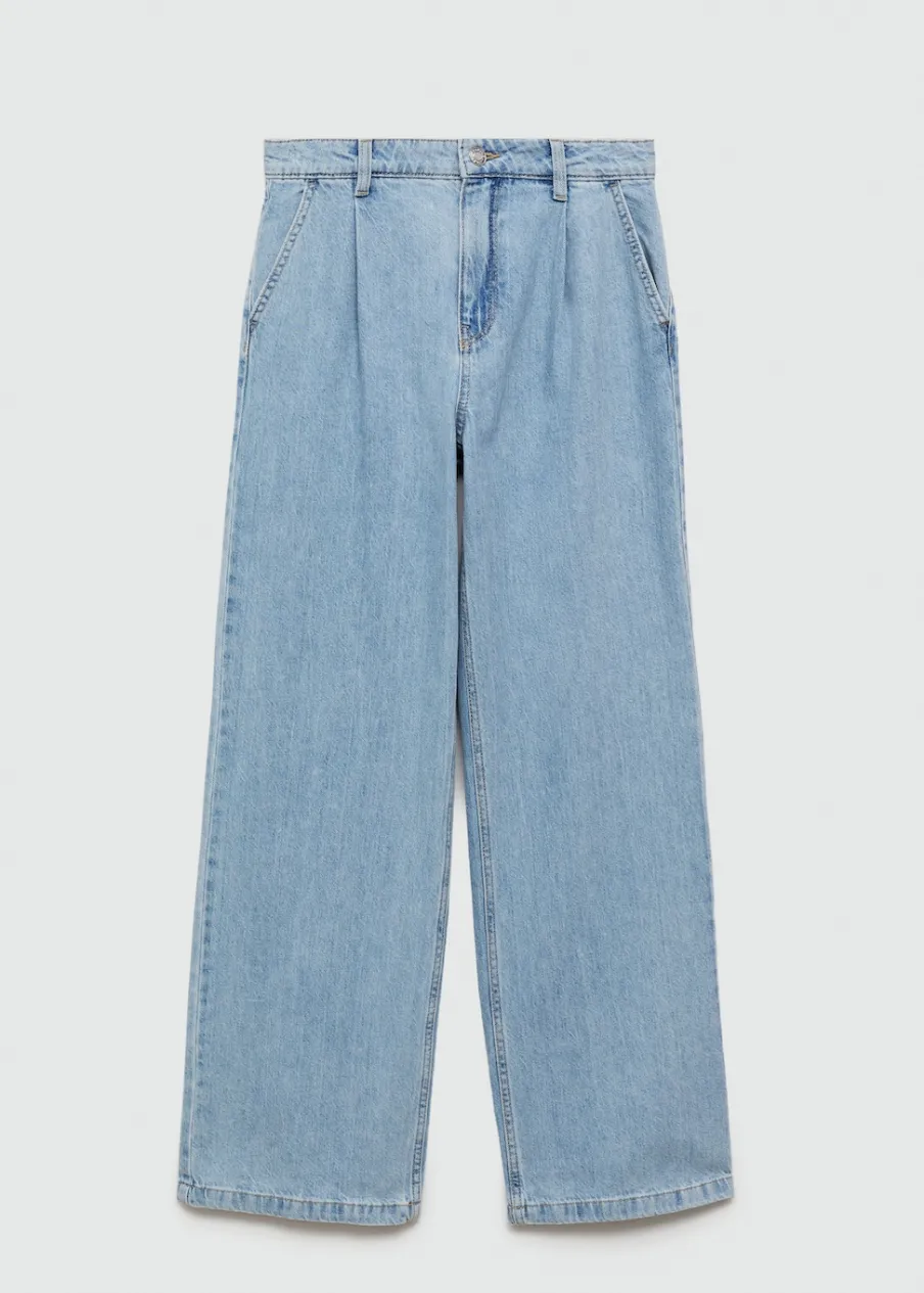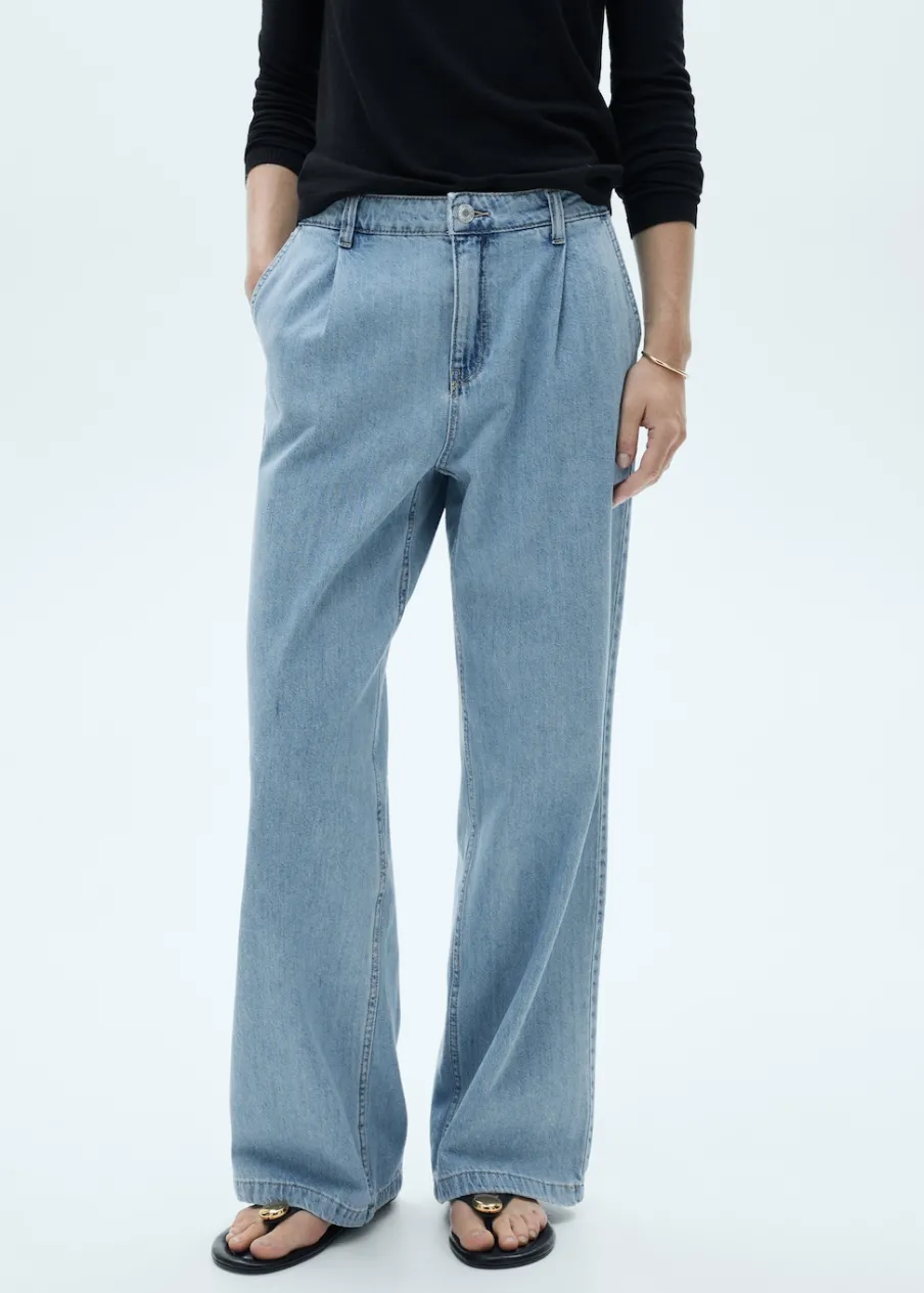 Tkanina bawełniana w dżinsowym stylu. Model prosty. Pełna długość. Średni stan. Szlufki. Dwie kieszenie nakładane z tyłu. Zapięcie na suwak i guzik. Detal z zakładkami. Długość wewnętrzna 80 cm.