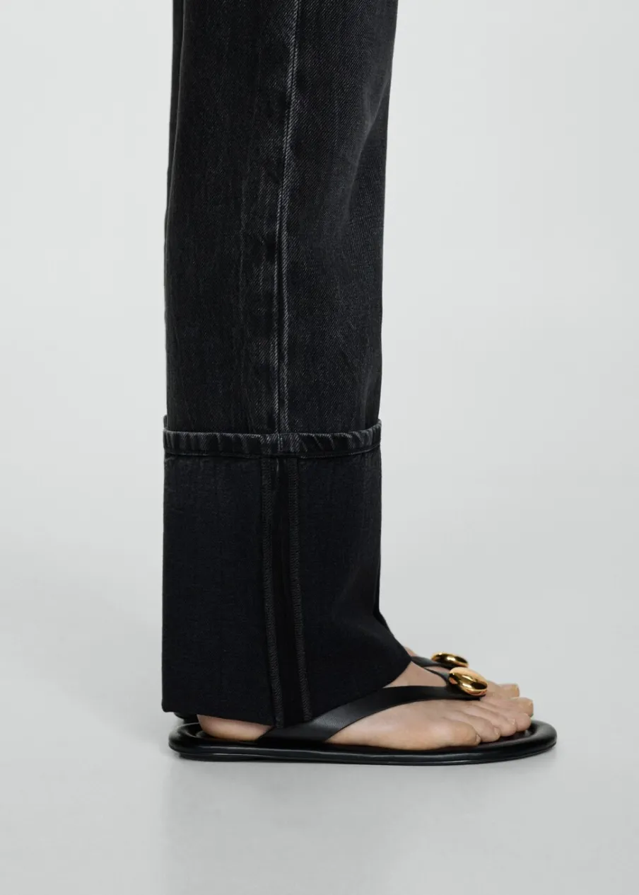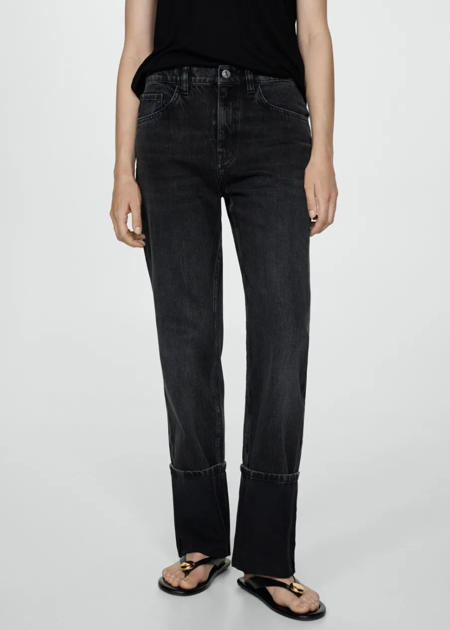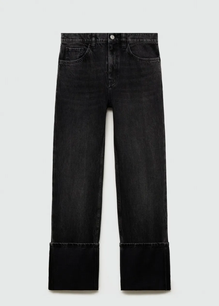 Tkanina bawełniana w dżinsowym stylu. Model prosty. Model długi. Średni stan. Szlufki. Pięć kieszeni. Wywinięte nogawki. Zapięcie na suwak i guzik. Długość wewnętrzna 78 cm.
