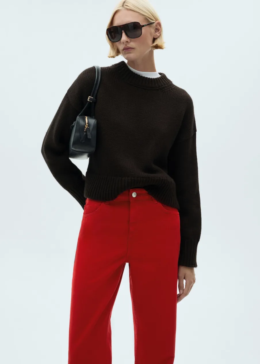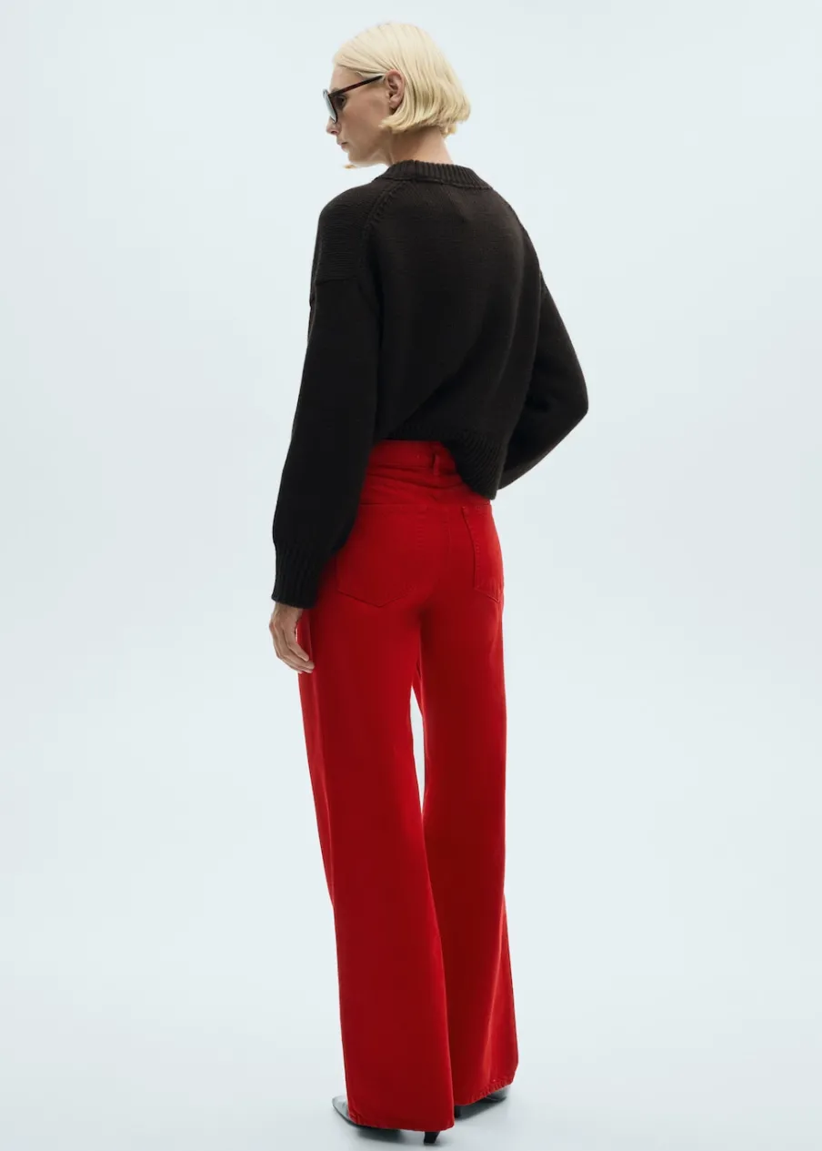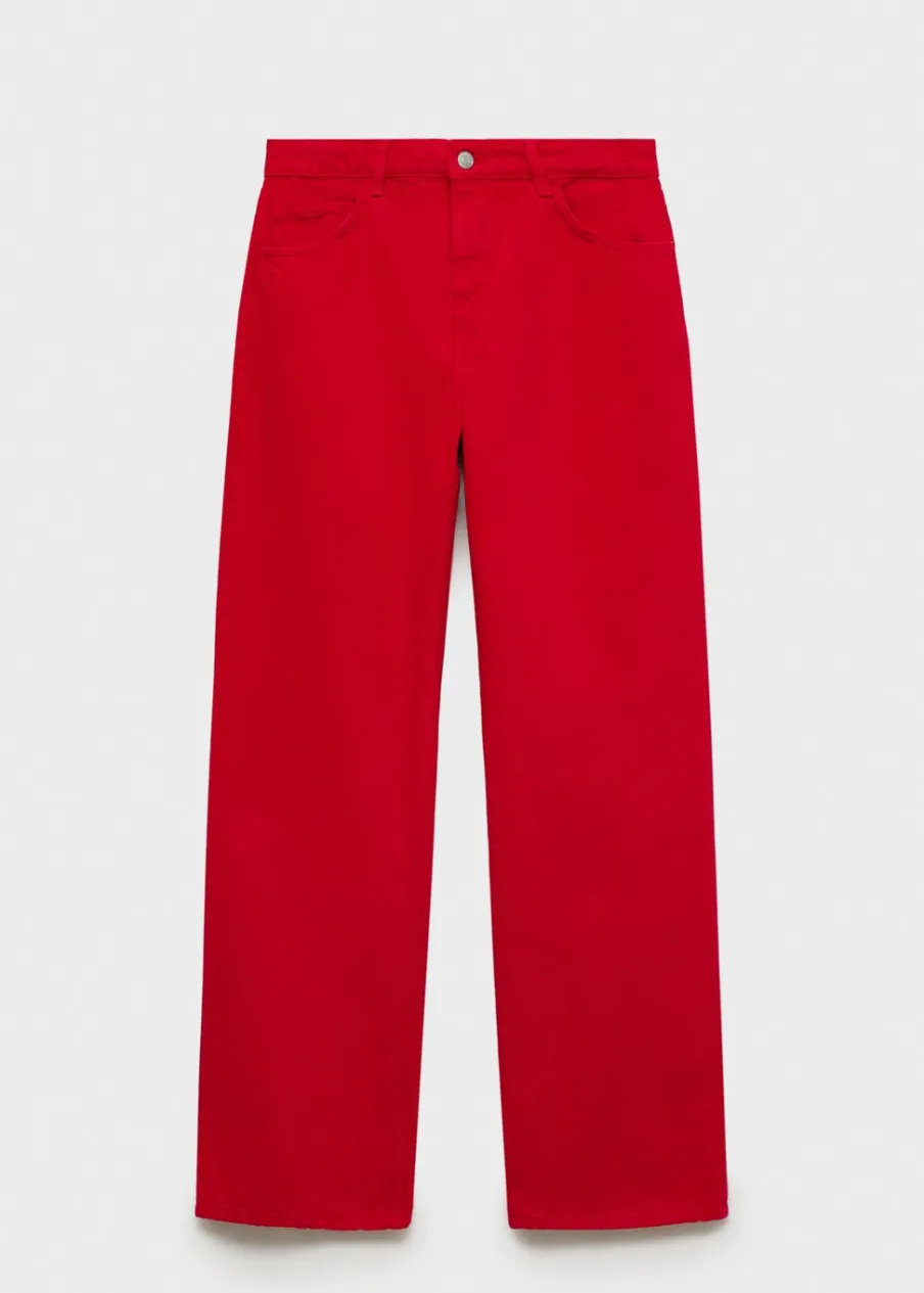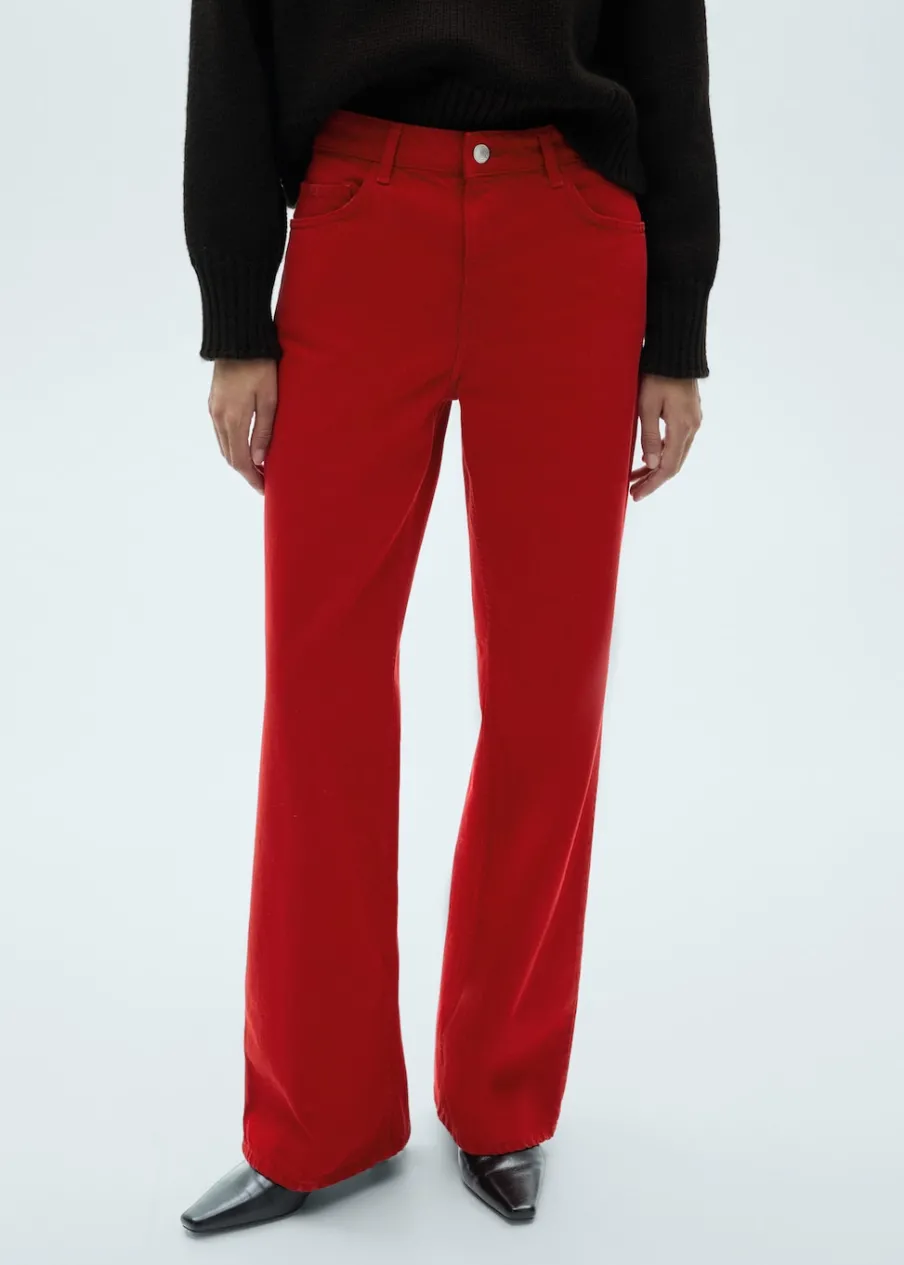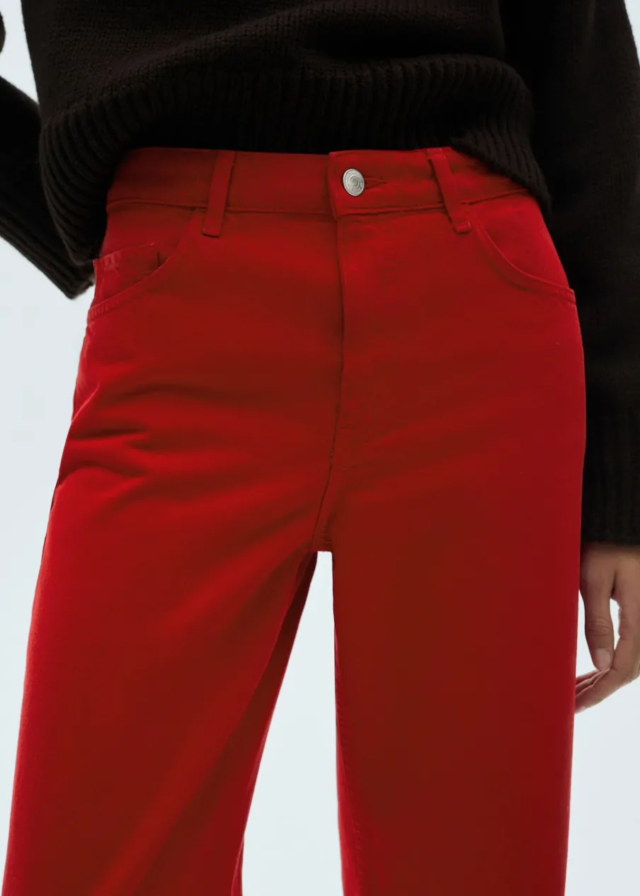 Tkanina bawełniana w dżinsowym stylu. Model długi. Model prosty. Podwyższony stan. Zapięcie na suwak i guzik. Szlufki. Pięć kieszeni. Modelka ma 179 cm wzrostu i nosi rozmiar S/36.
