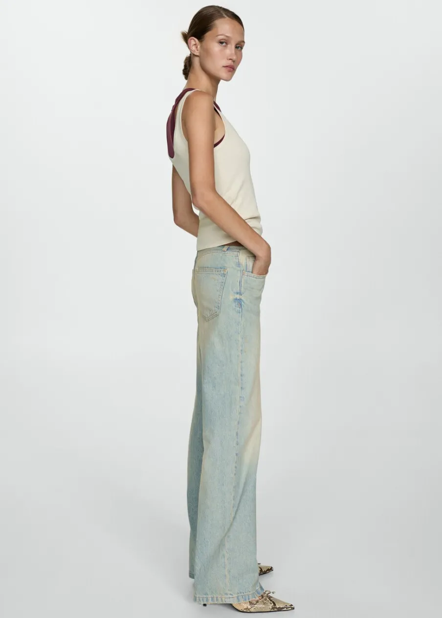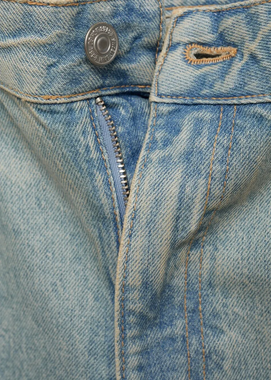 Tkanina bawełniana w dżinsowym stylu. Średni stan. Model długi. Model prosty. Pięć kieszeni. Szlufki. Zapięcie na suwak i guzik.
