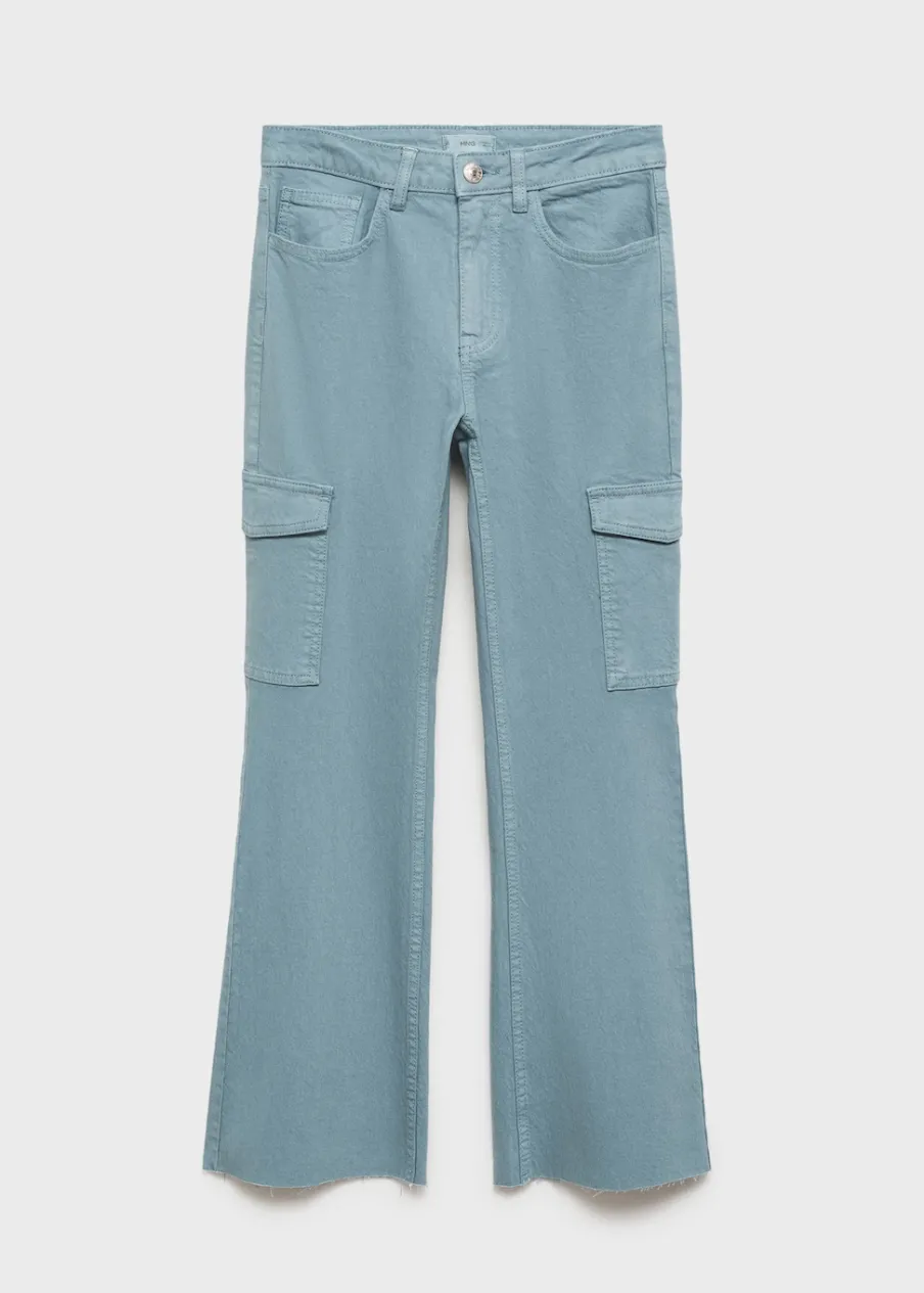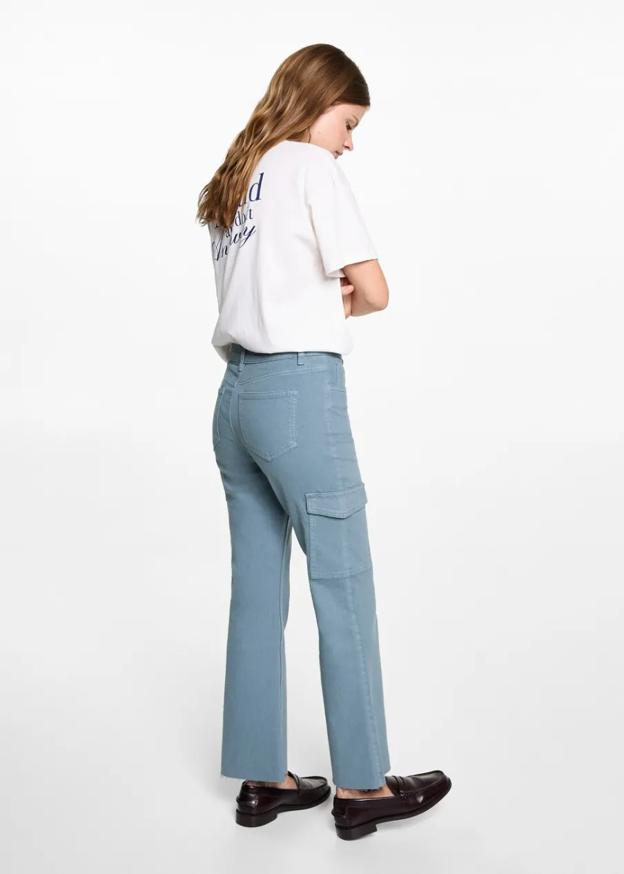 Tkanina bawełniana w dżinsowym stylu. Deseń crop. Krój regular. Niski stan. Krój: cargo. Dwie kieszenie cargo. Pięć kieszeni. Zapięcie na suwak i guzik. Modelka ma 172 cm wzrostu i nosi rozmiar M.