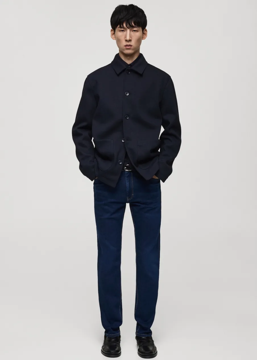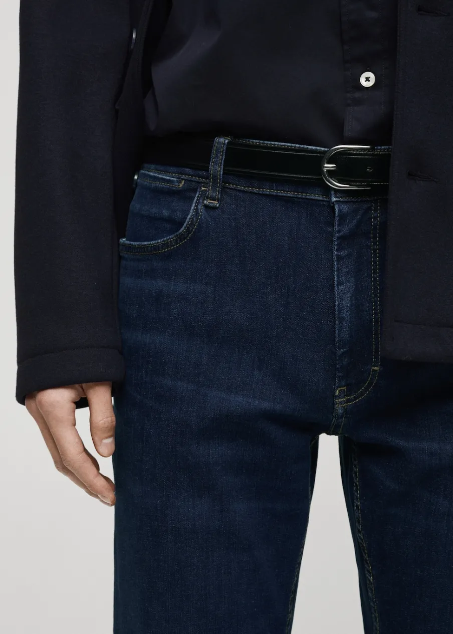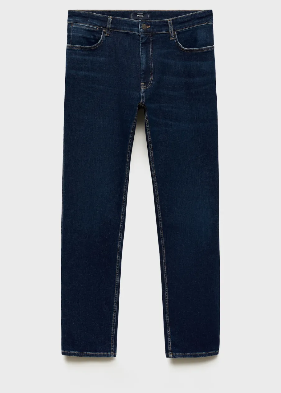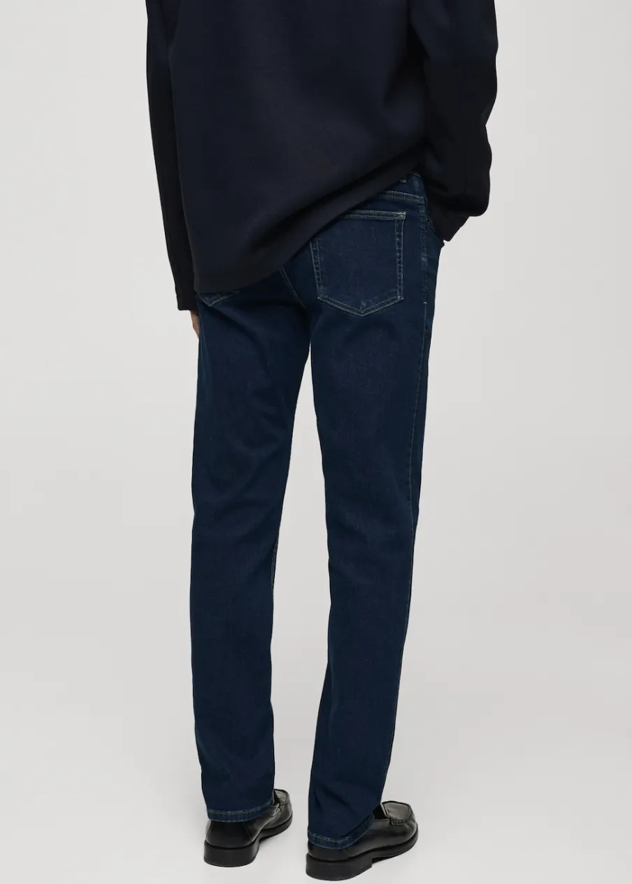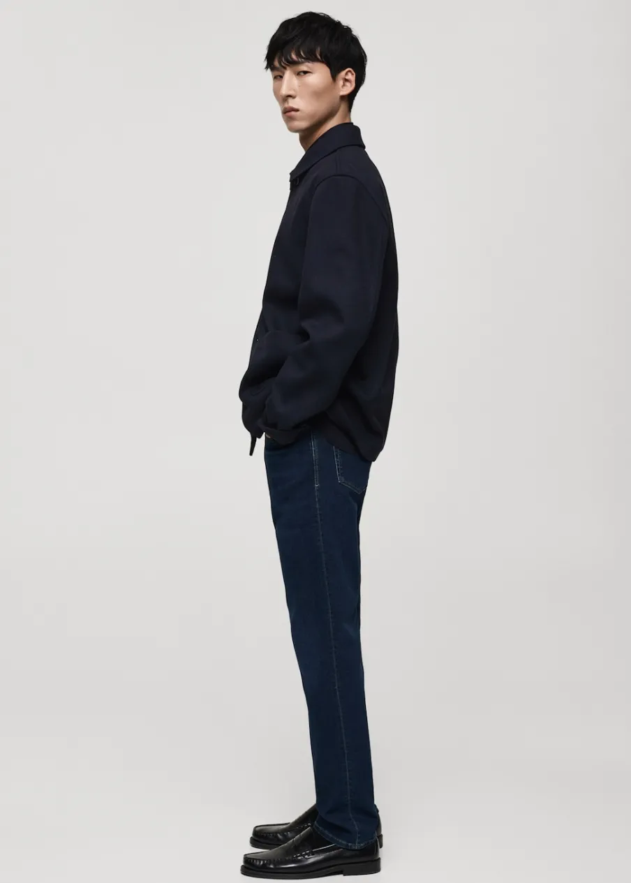 Slim-fit. Spranie na ciemno. Tkanina mieszana z bawełną z recyklingu. Średni stan. Szlufki na pasek. Zapięcie na suwak i guzik. Dwie kieszenie boczne. Kieszeń na bilon. Dwie kieszenie nakładane z tyłu. Model ma 185 cm wzrostu i nosi rozmiar 42.