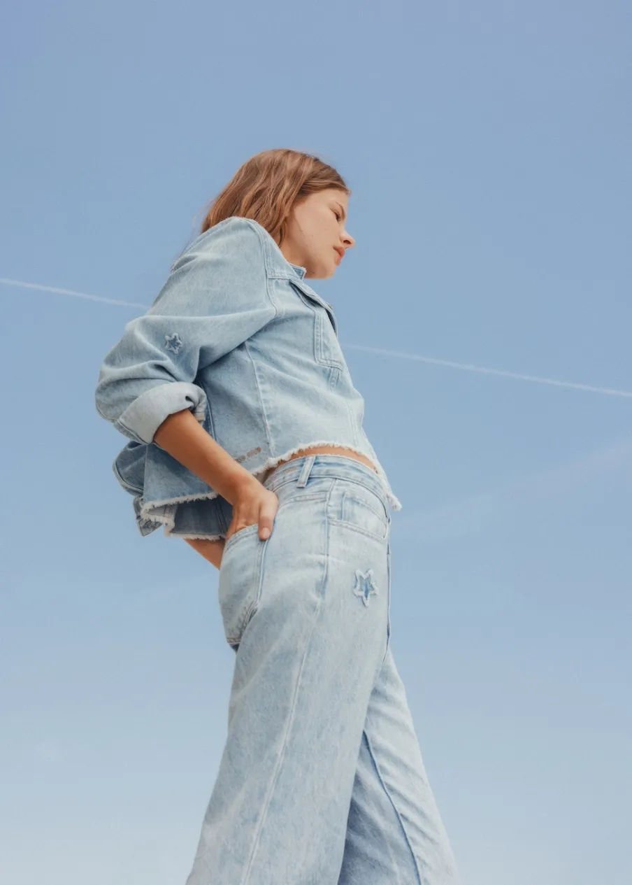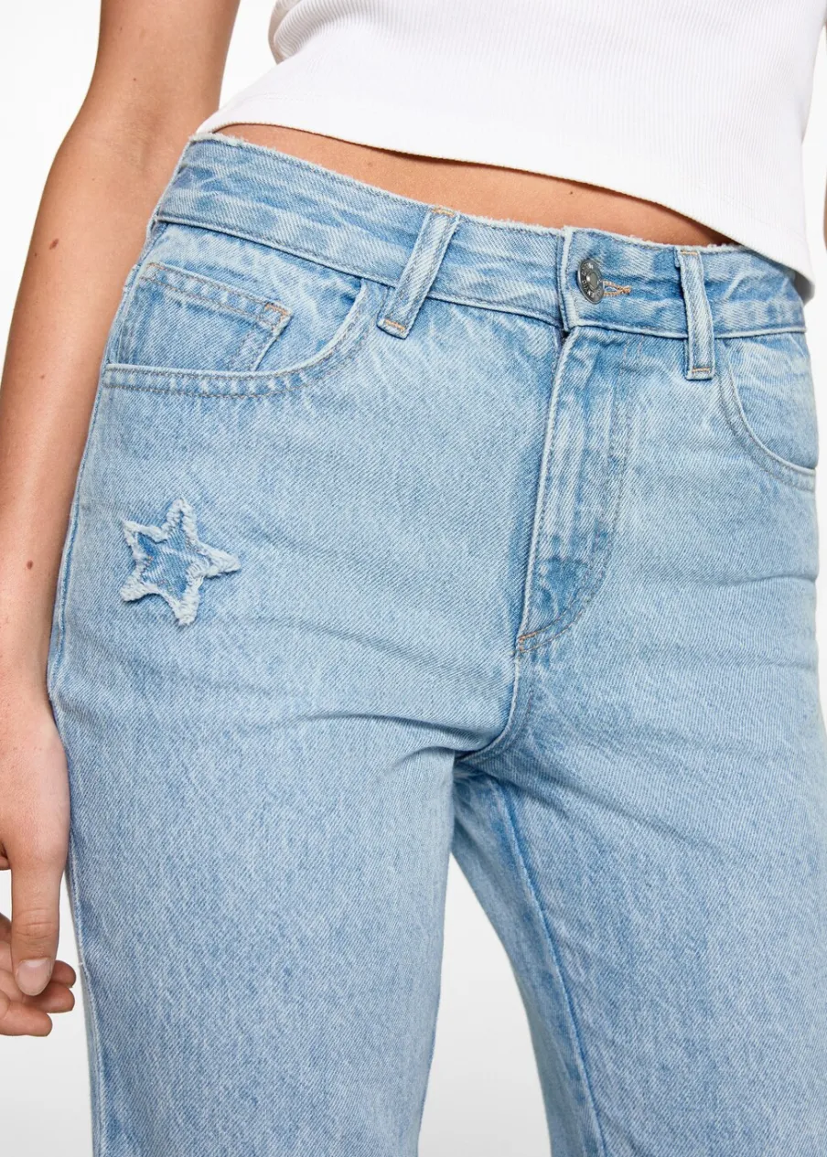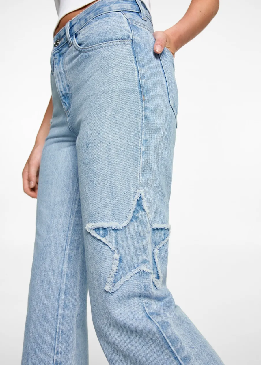 Tkanina bawełniana w dżinsowym stylu. Model prosty. Haftowane gwiazdki. Ozdobne gwiazdki. Model długi. Średni stan. Pięć kieszeni. Zapięcie na suwak i guzik.
