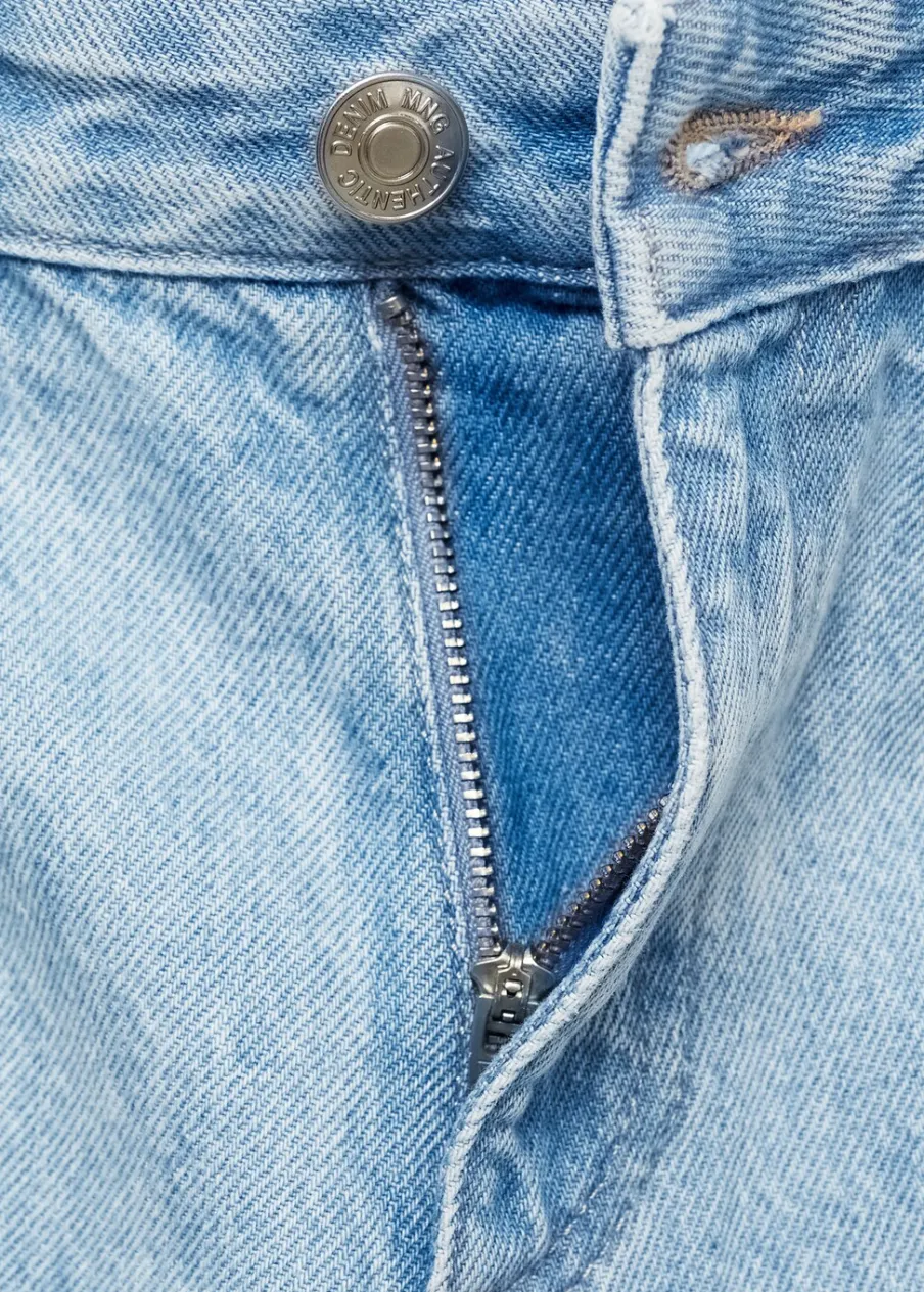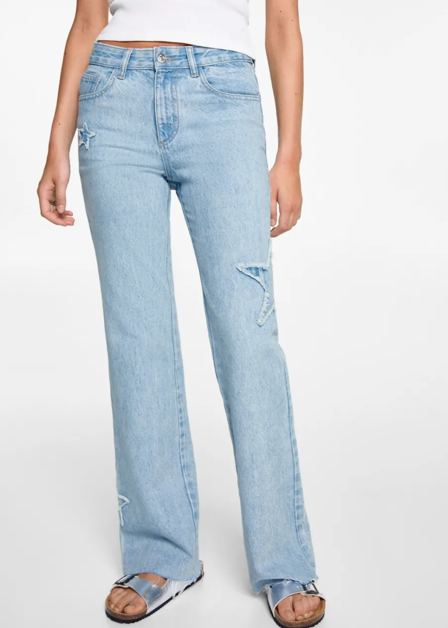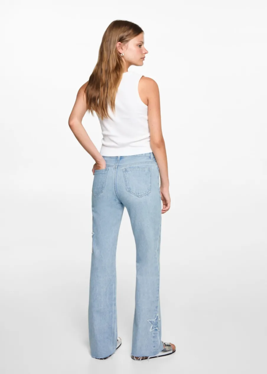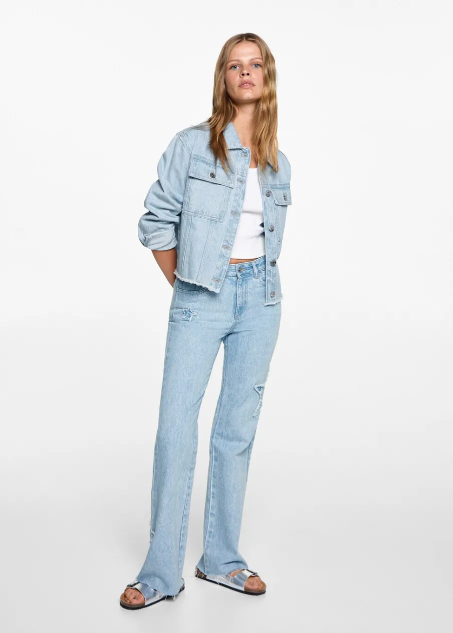 Tkanina bawełniana w dżinsowym stylu. Model prosty. Haftowane gwiazdki. Ozdobne gwiazdki. Model długi. Średni stan. Pięć kieszeni. Zapięcie na suwak i guzik.