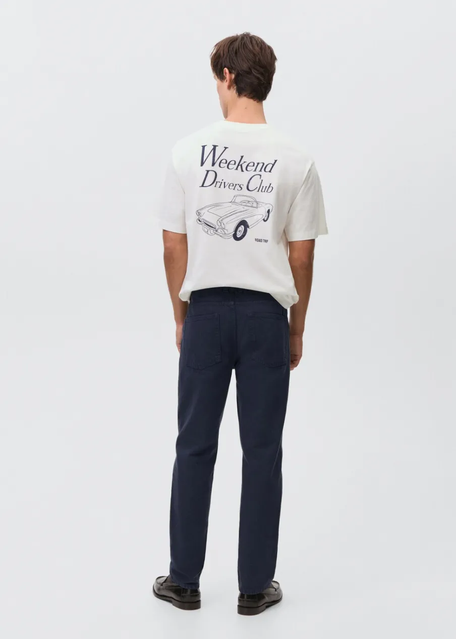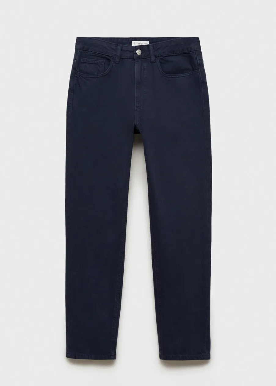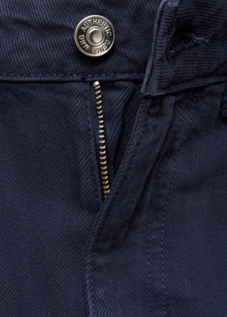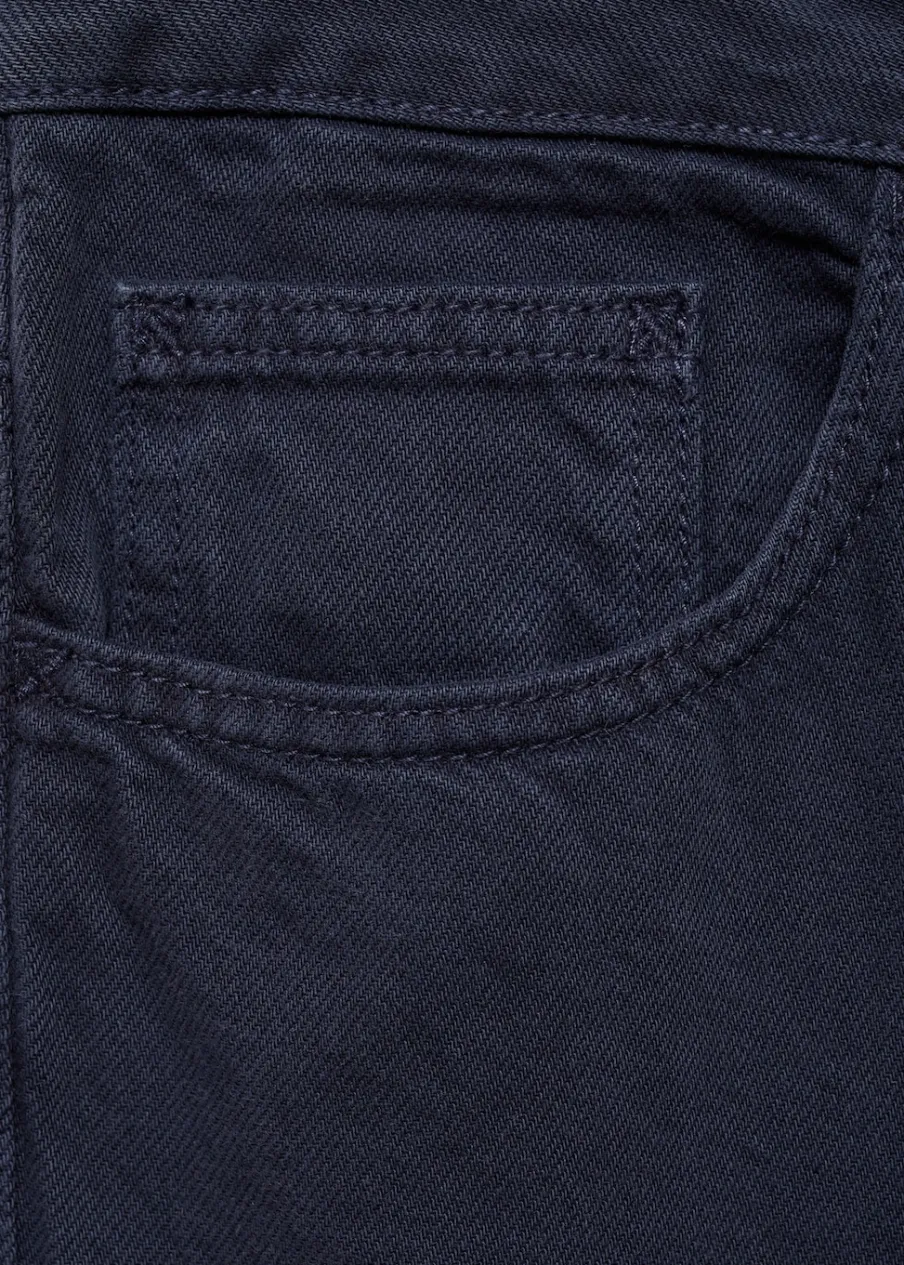 Slim-fit. Tkanina bawełniana w dżinsowym stylu. Średni stan. Szlufki na pasek. Pięć kieszeni. Zapięcie na suwak i guzik.