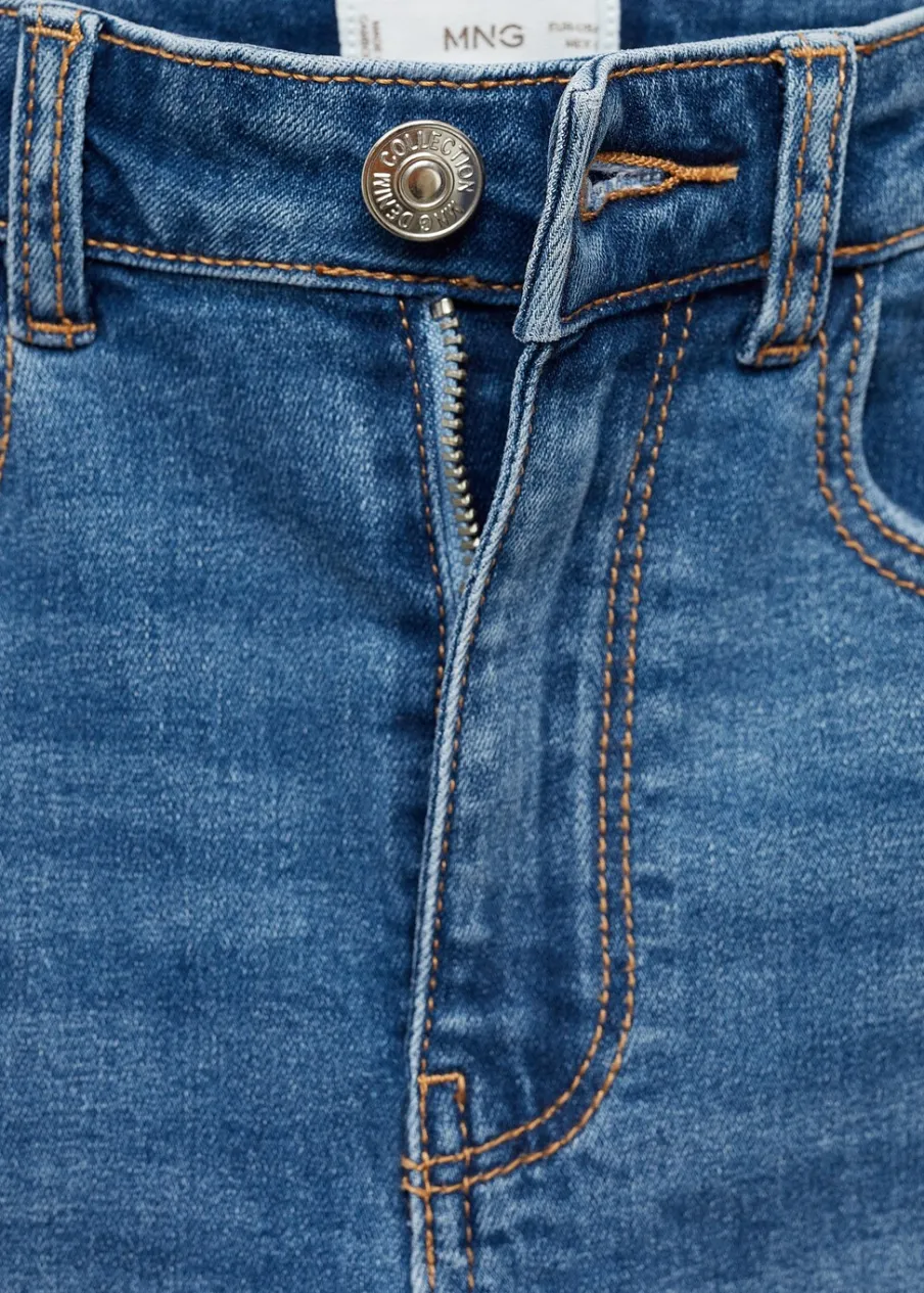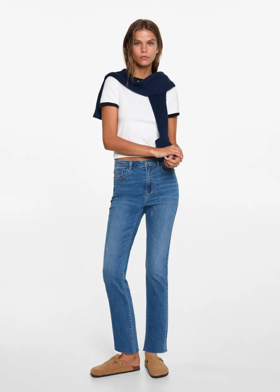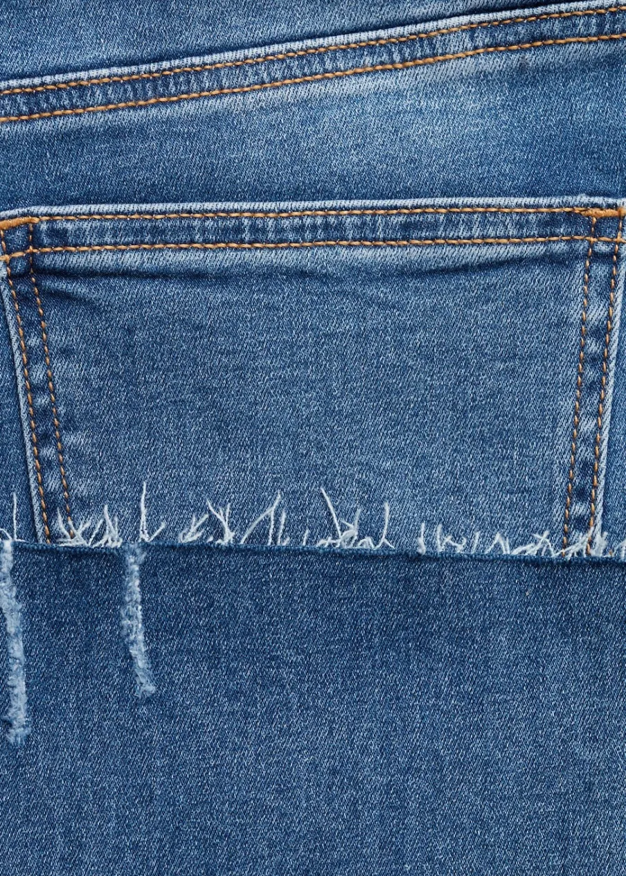 Tkanina bawełniana w dżinsowym stylu. Model prosty. Model długi. Slim-fit. Średni stan. Pięć kieszeni. Postrzępione nogawki. Zapięcie na suwak i guzik.