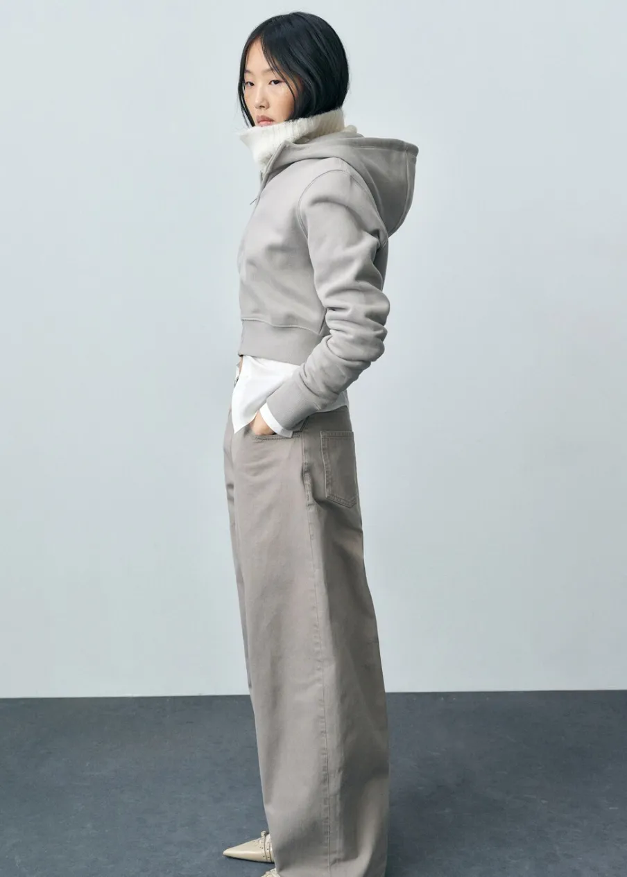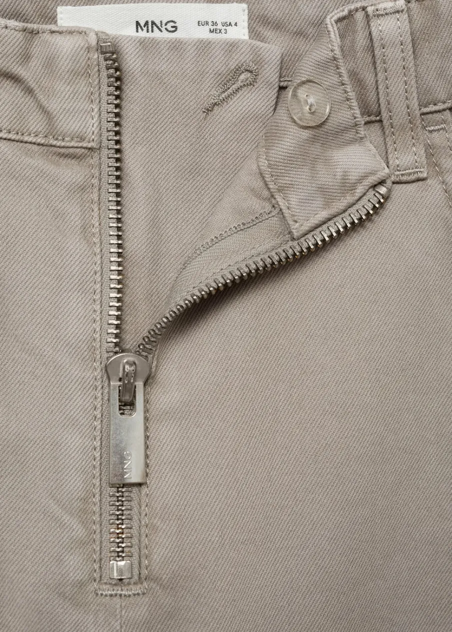 Tkanina bawełniana w dżinsowym stylu. Fason wideleg. Model długi. Średni stan. Szlufki. Pięć kieszeni. Zapięcie z przodu na suwak.