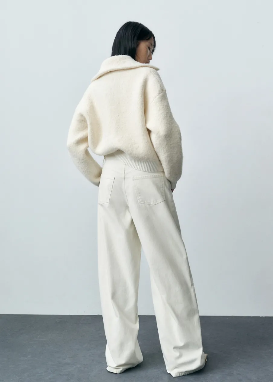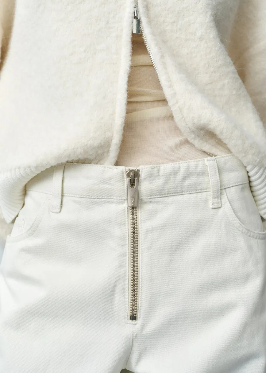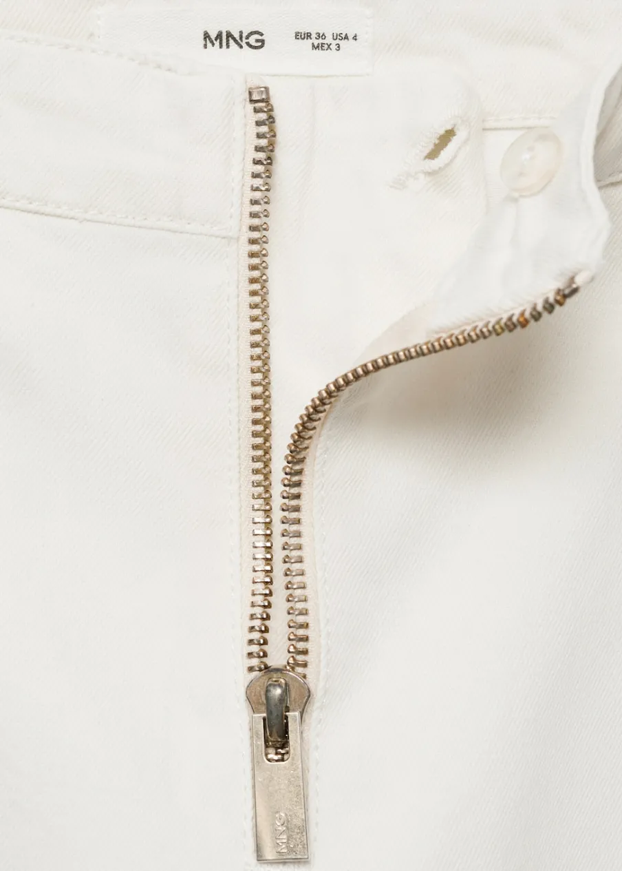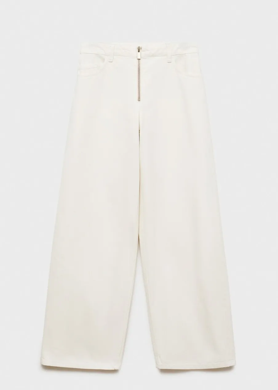 Tkanina bawełniana w dżinsowym stylu. Fason wideleg. Model długi. Średni stan. Szlufki. Pięć kieszeni. Zapięcie z przodu na suwak.