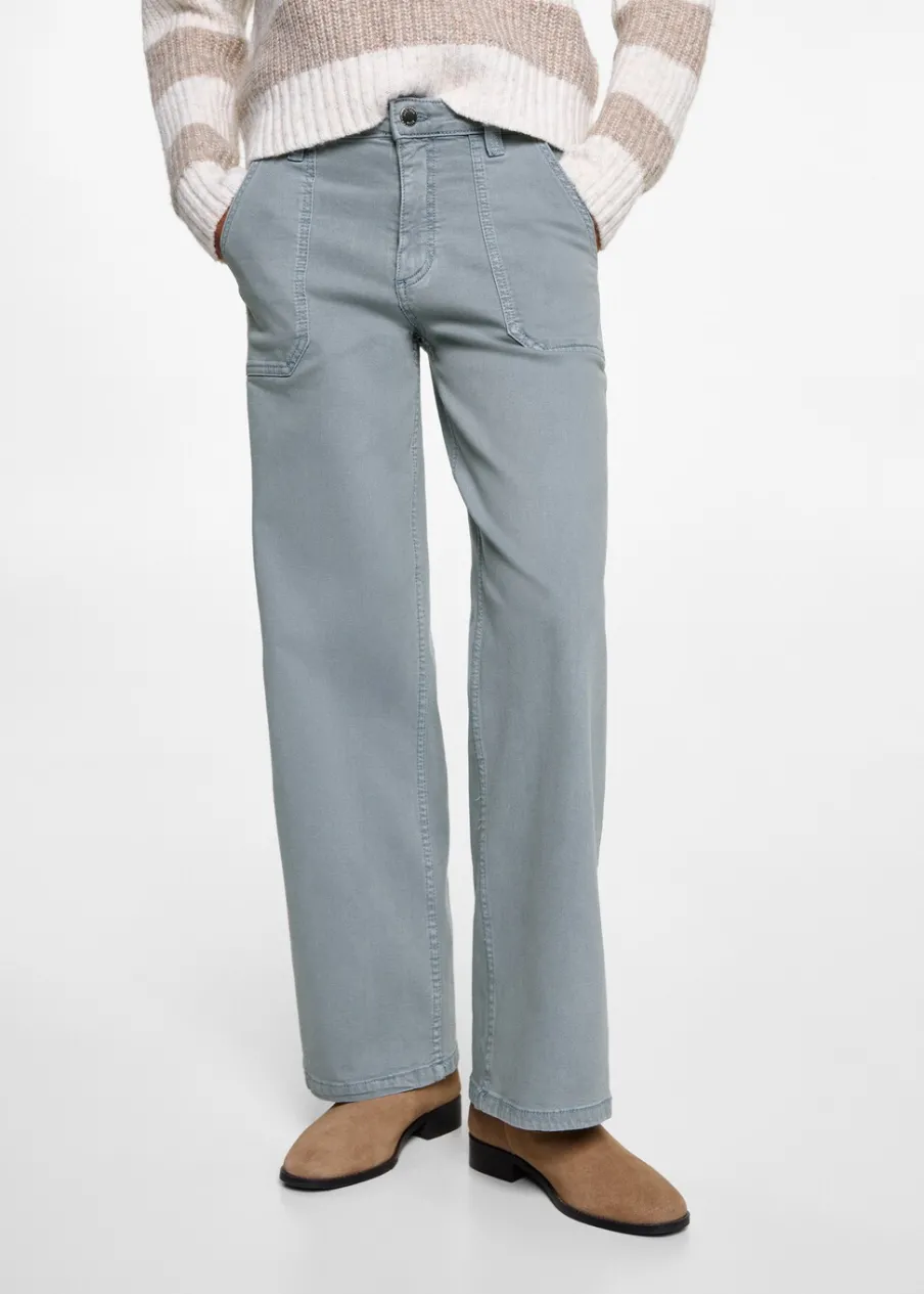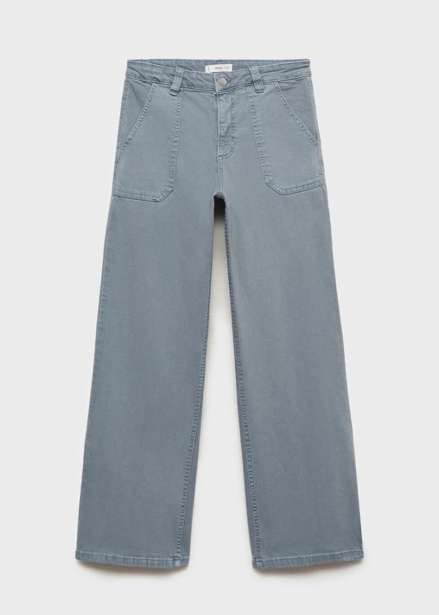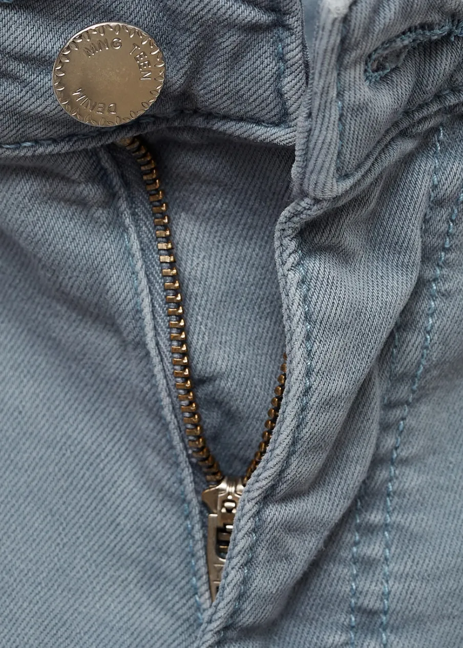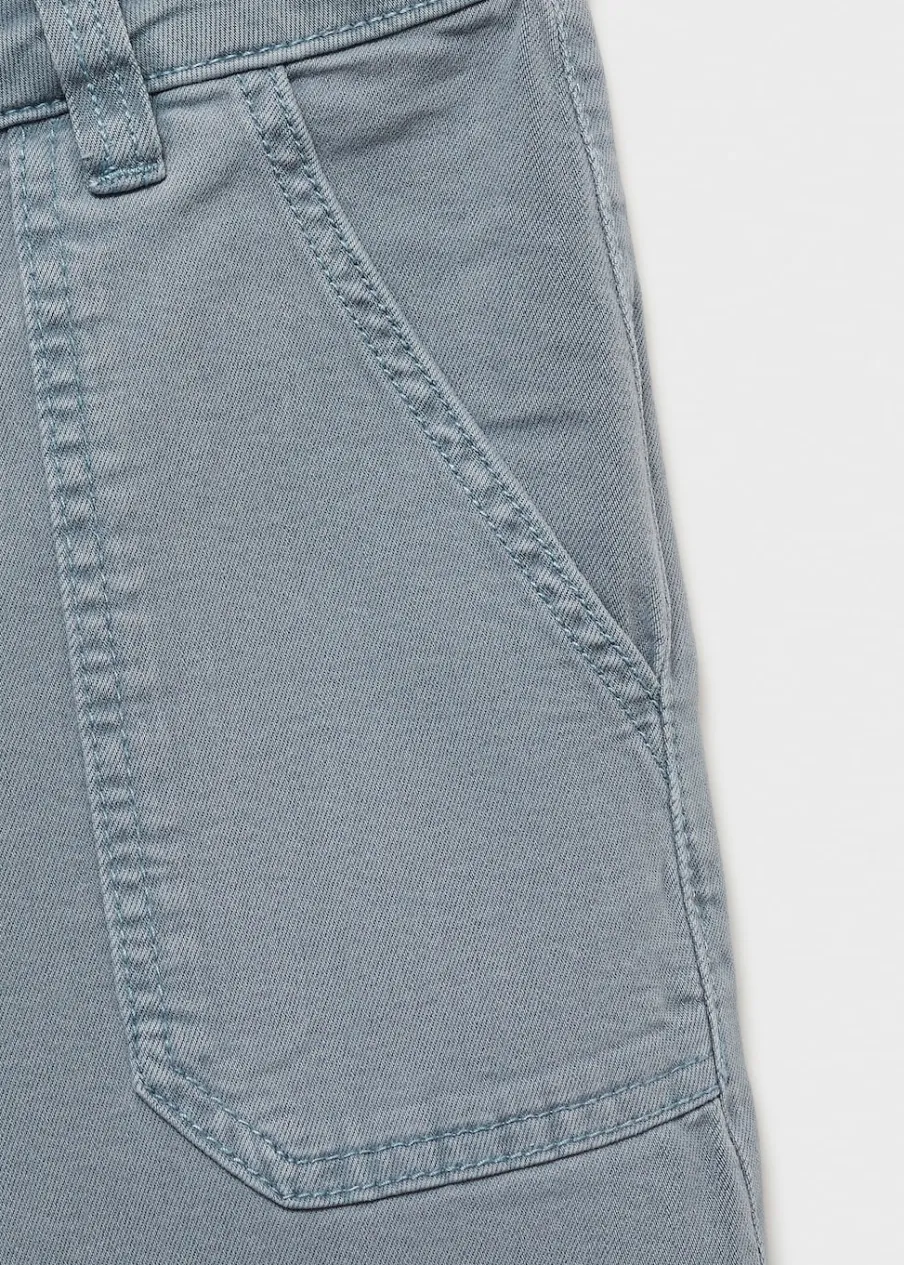 Tkanina bawełniana w dżinsowym stylu. Fason culotte. Model długi. Średni stan. Dwie kieszenie. Zapięcie na suwak i guzik.