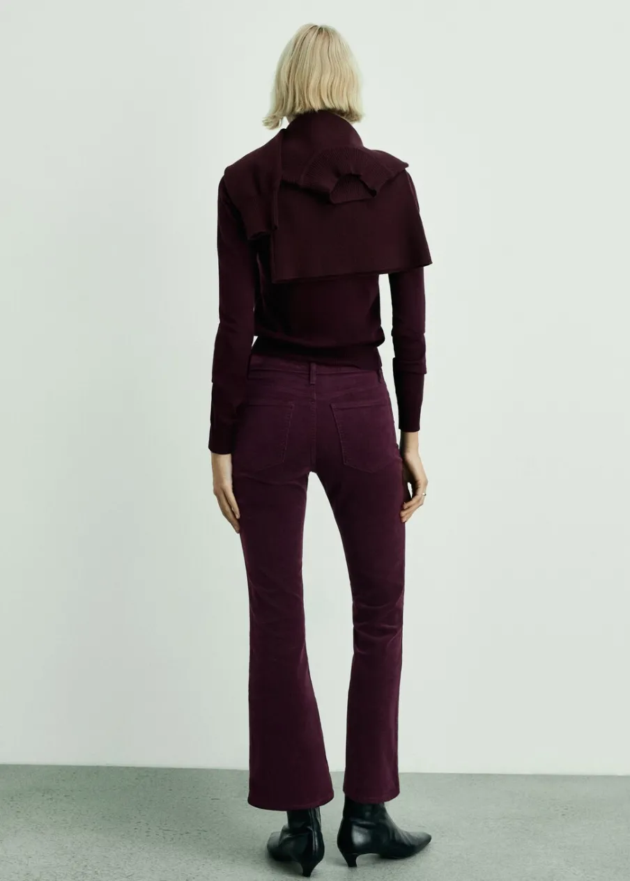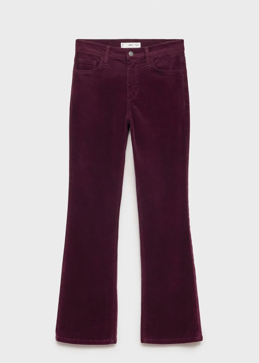 Sztruksowa tkanina. Elastyczna tkanina. Rozszerzany model. Styl flare. Podwyższony stan. Szlufki. Pięć kieszeni. Zapięcie na suwak i guzik. Długość wewnętrzna 65 cm. Modelka ma 179 cm wzrostu i nosi rozmiar S/36.