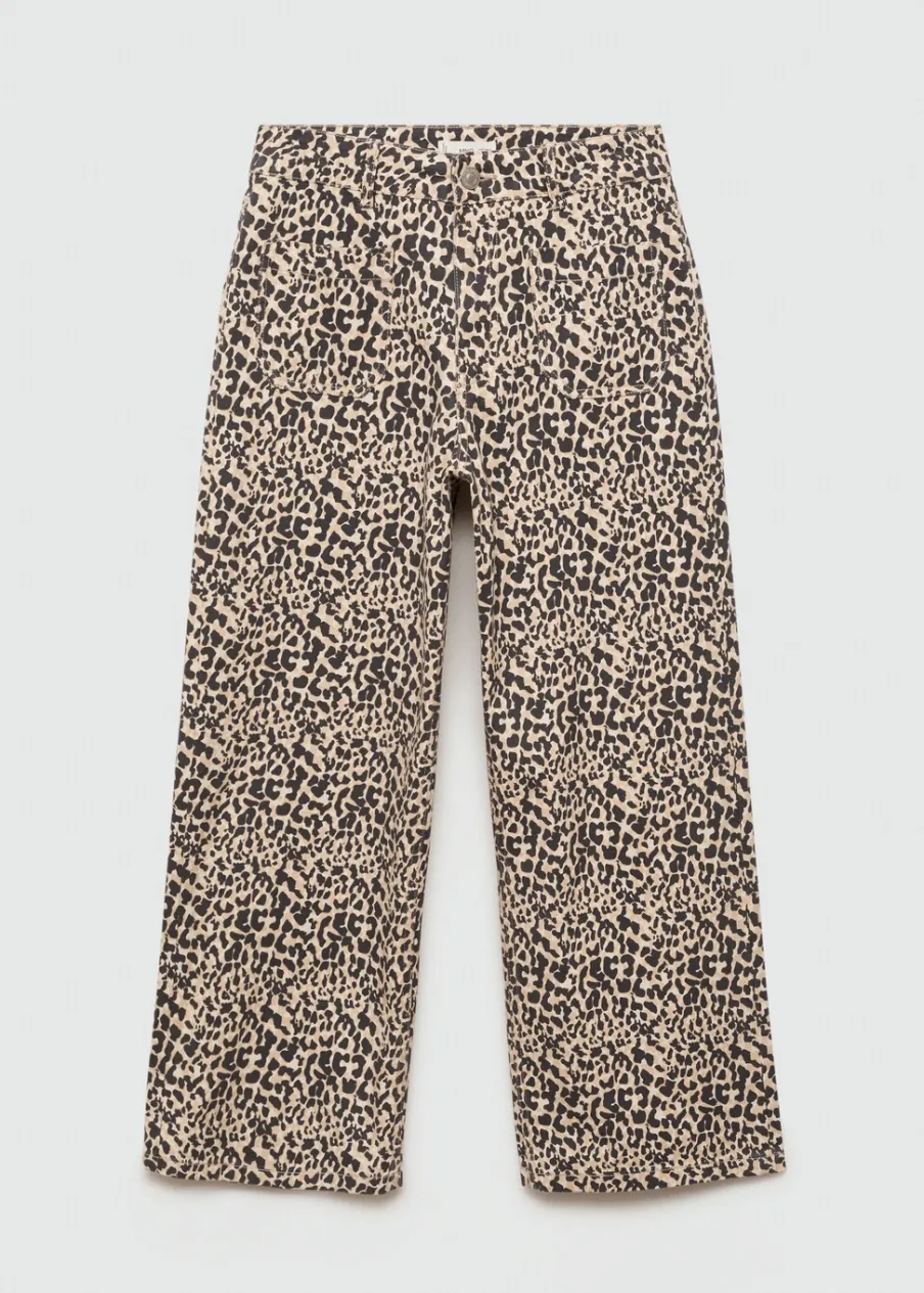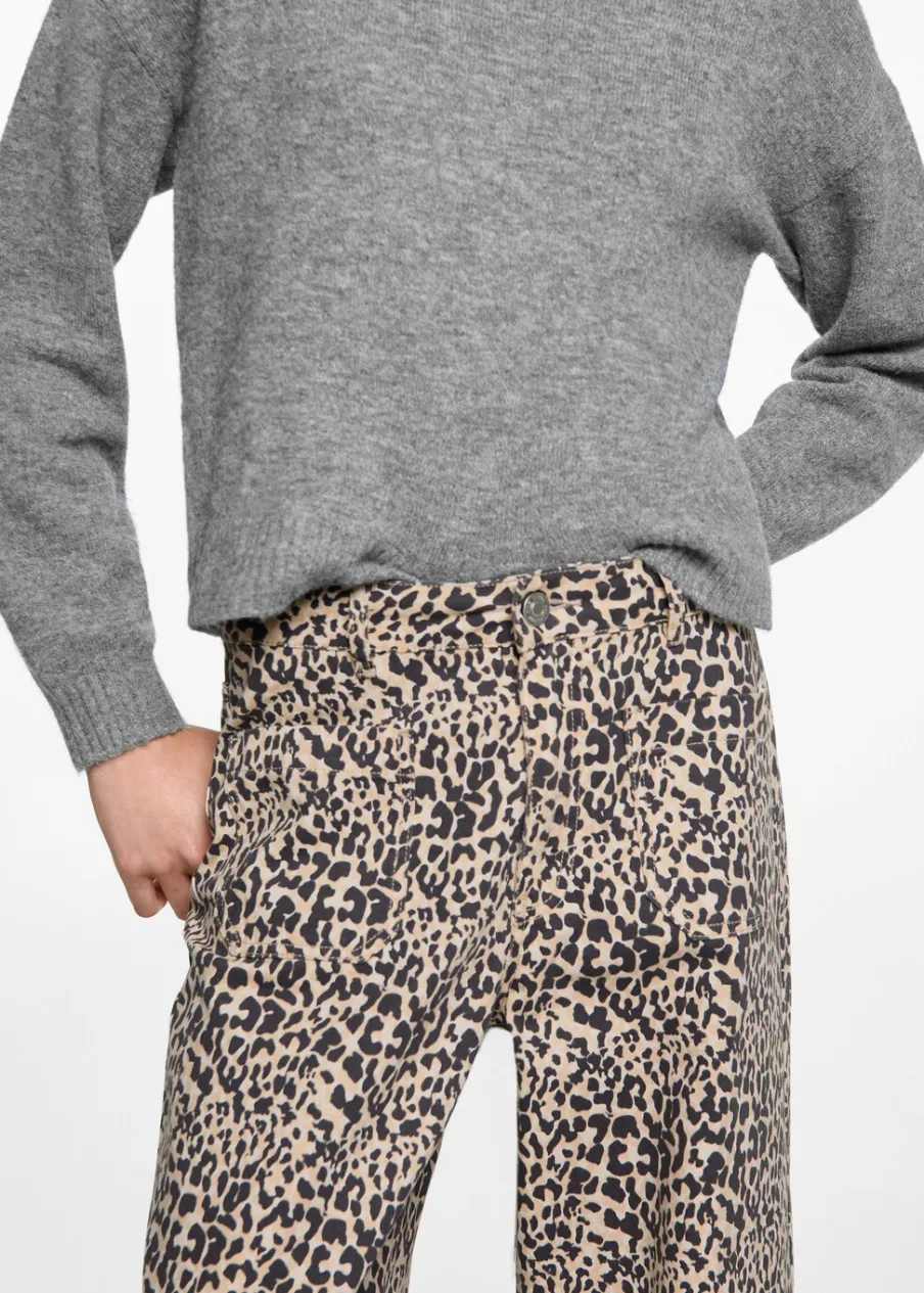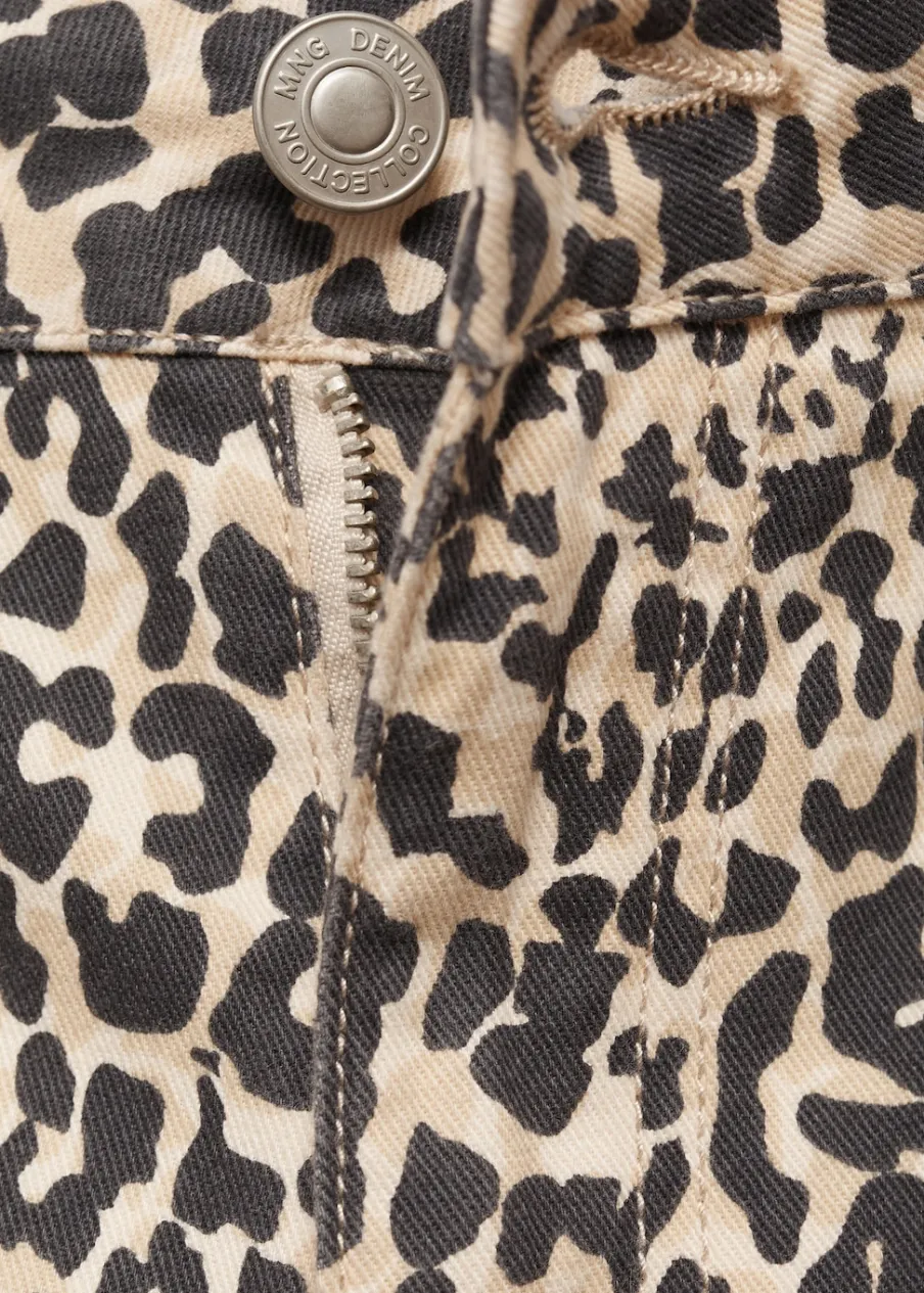 Średni stan. Wzór w lamparcie cętki. Dwie kieszenie nakładane z przodu. Szlufki. Zapięcie na suwak i guzik. Modelka ma 172 cm wzrostu i nosi rozmiar M. Tkanina bawełniana w dżinsowym stylu. Model prosty.