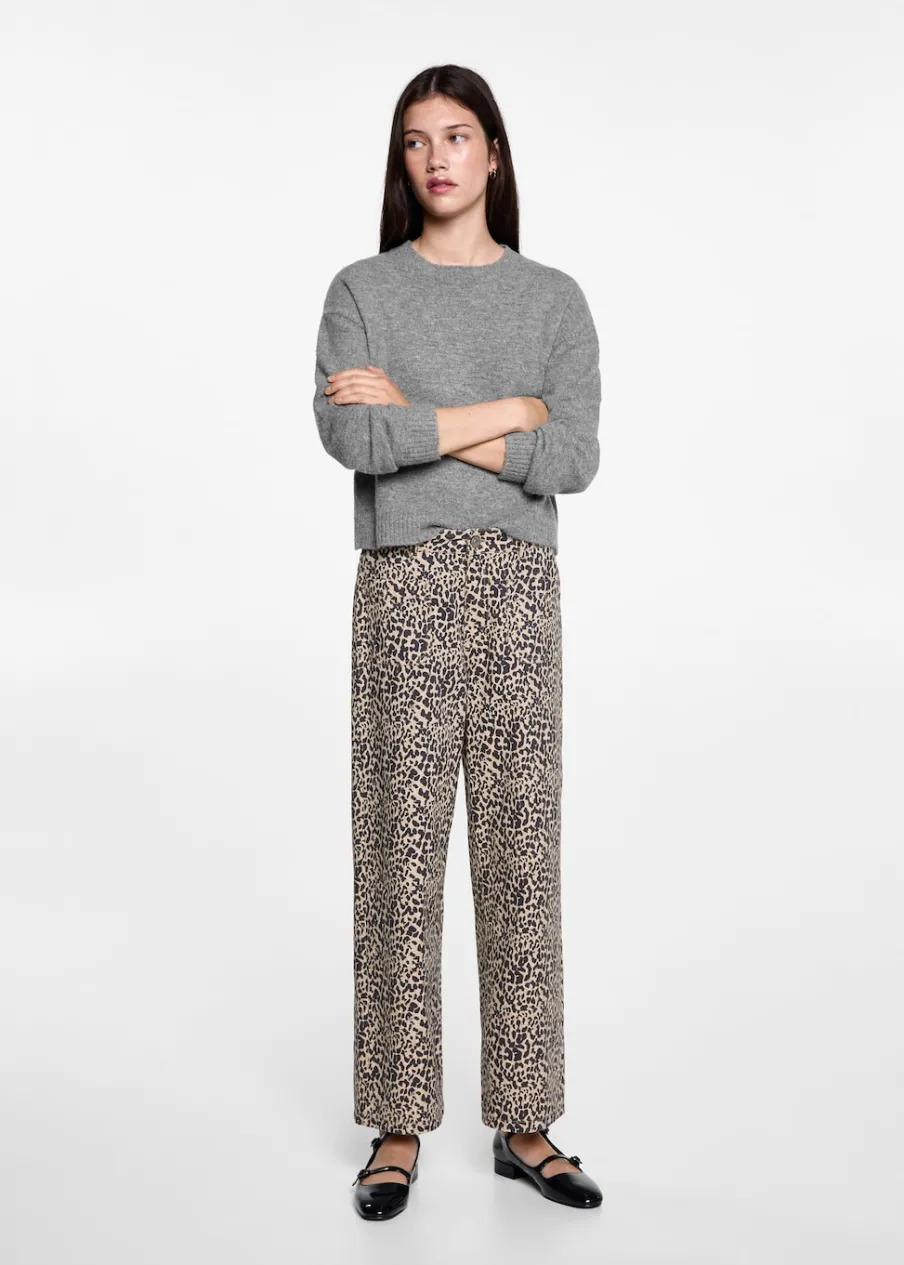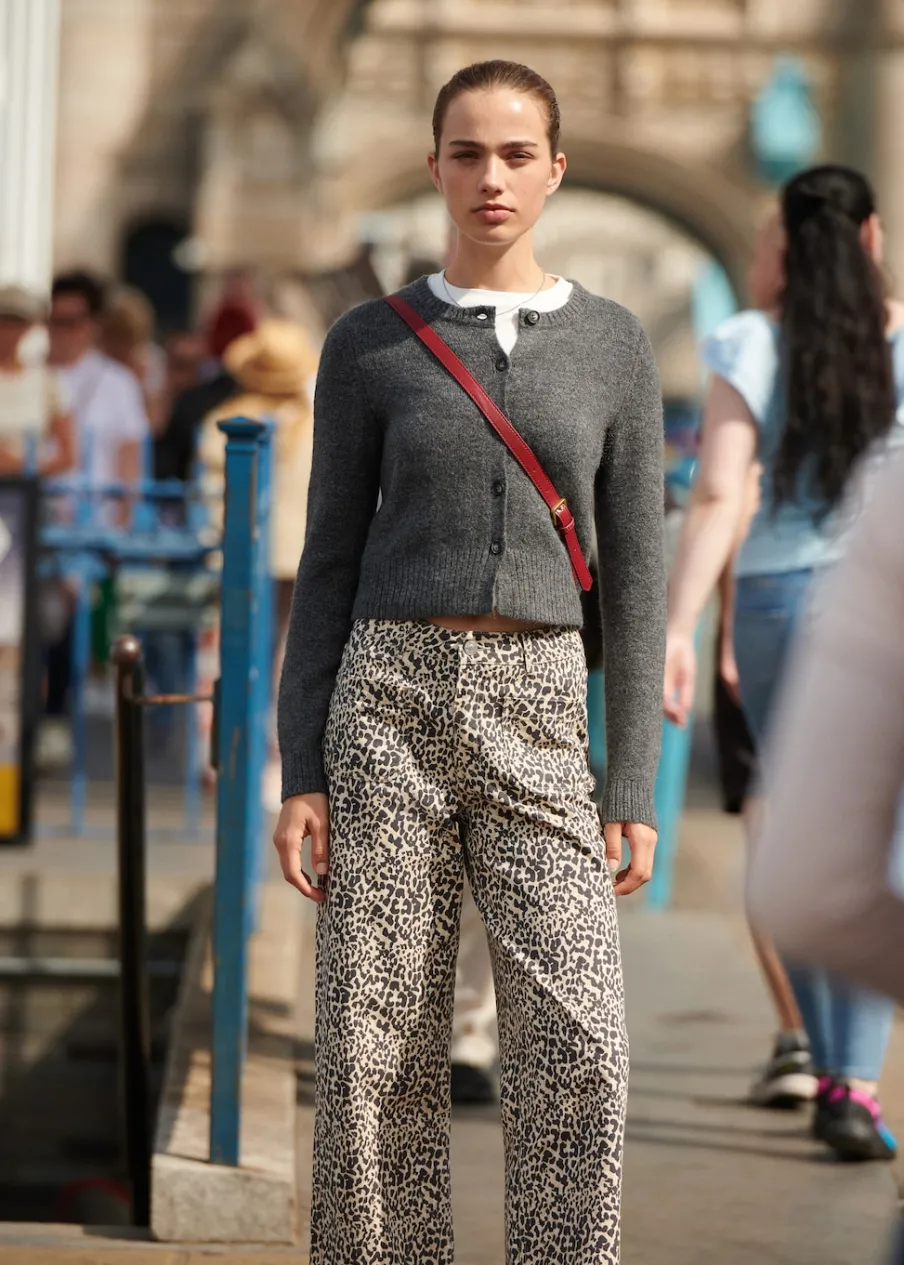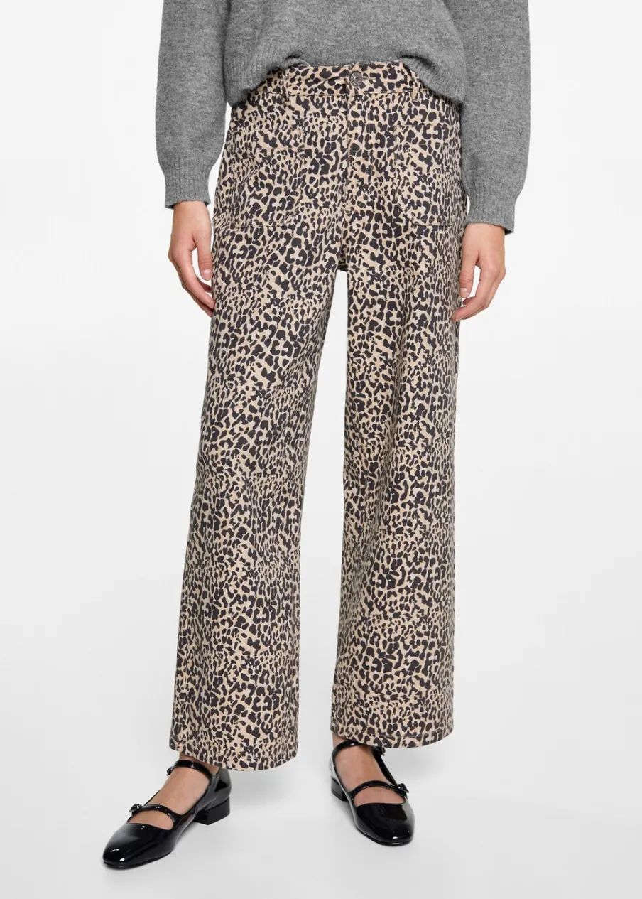 Średni stan. Wzór w lamparcie cętki. Dwie kieszenie nakładane z przodu. Szlufki. Zapięcie na suwak i guzik. Modelka ma 172 cm wzrostu i nosi rozmiar M. Tkanina bawełniana w dżinsowym stylu. Model prosty.