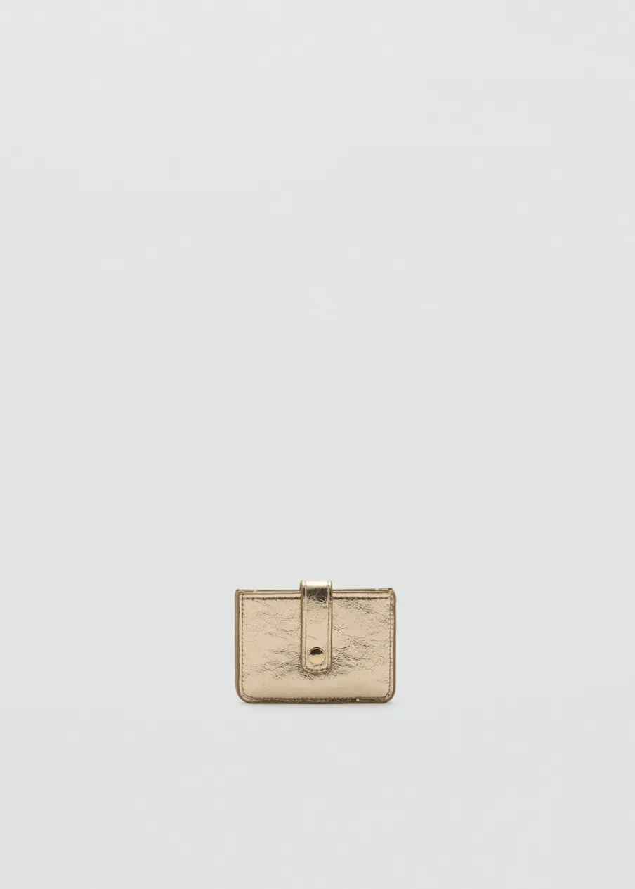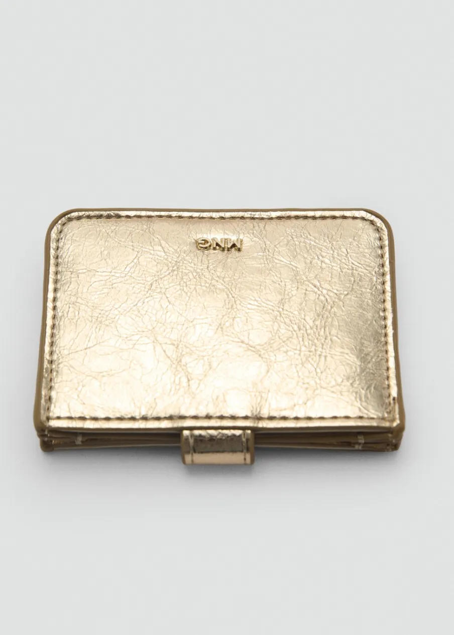 Metaliczny efekt. Mała wielkość. Kilka przegródek na karty. Zapięcie na guzik. Tłoczone logo. Ozdobne szwy.