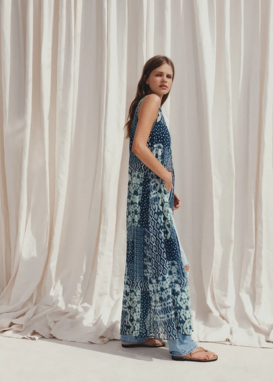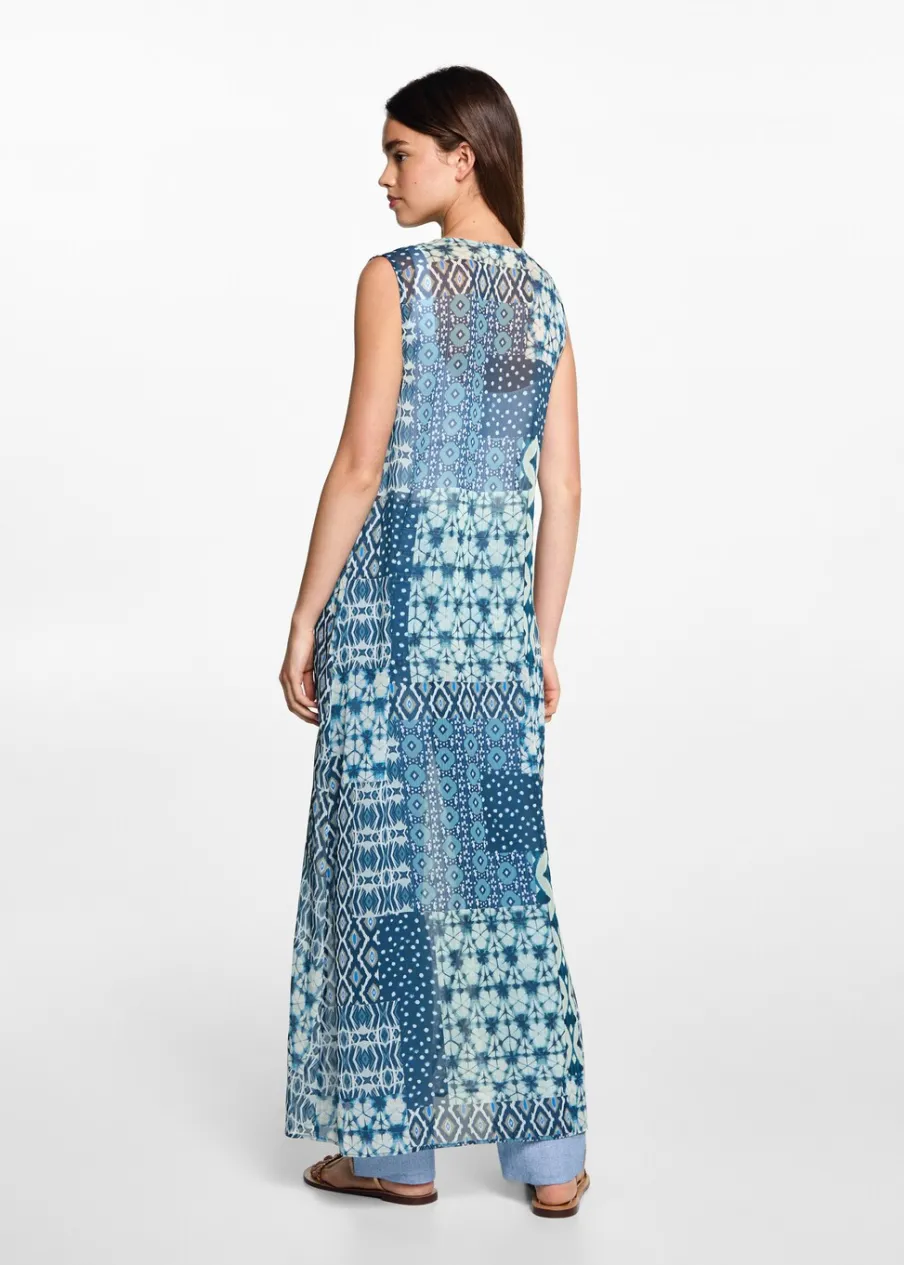 Lejąca tkanina. Model prosty. Model długi. Dekolt V. Zapięcie z przodu. Bez rękawów. Nadruk. Zapięcie na guziki z przodu.