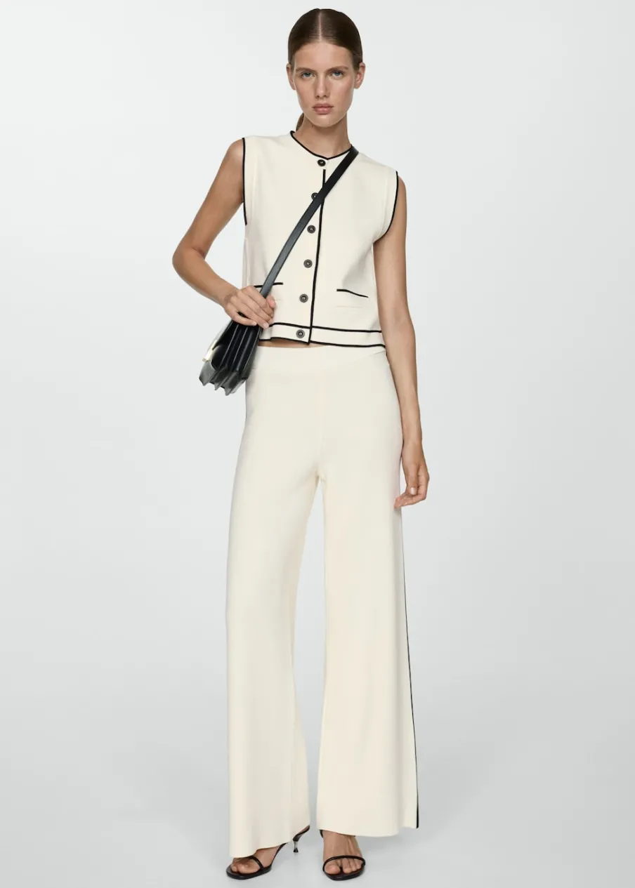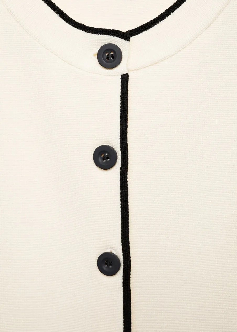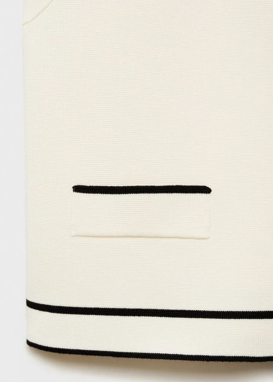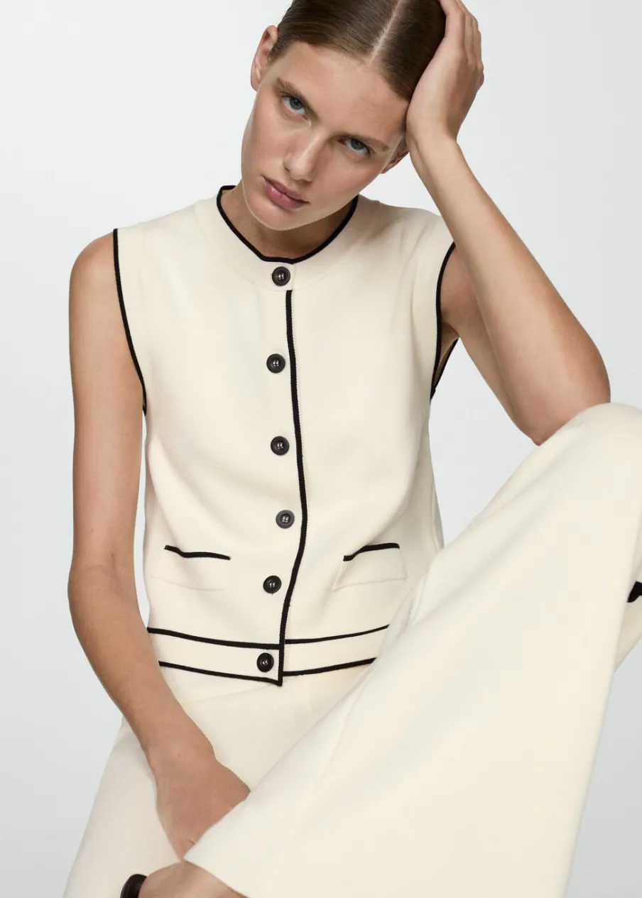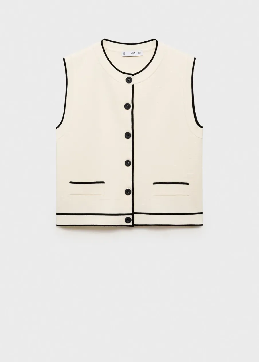Tkanina z cienkiej dzianiny. Model prosty. Okrągły dekolt. Bez rękawów. Dwie kieszenie z przodu. Kontrastowe lamówki. Modelka ma 180 cm wzrostu i nosi rozmiar S. Zapięcie z przodu. Model standardowy. Bez podszewki. Zapięcie na guziki z przodu.