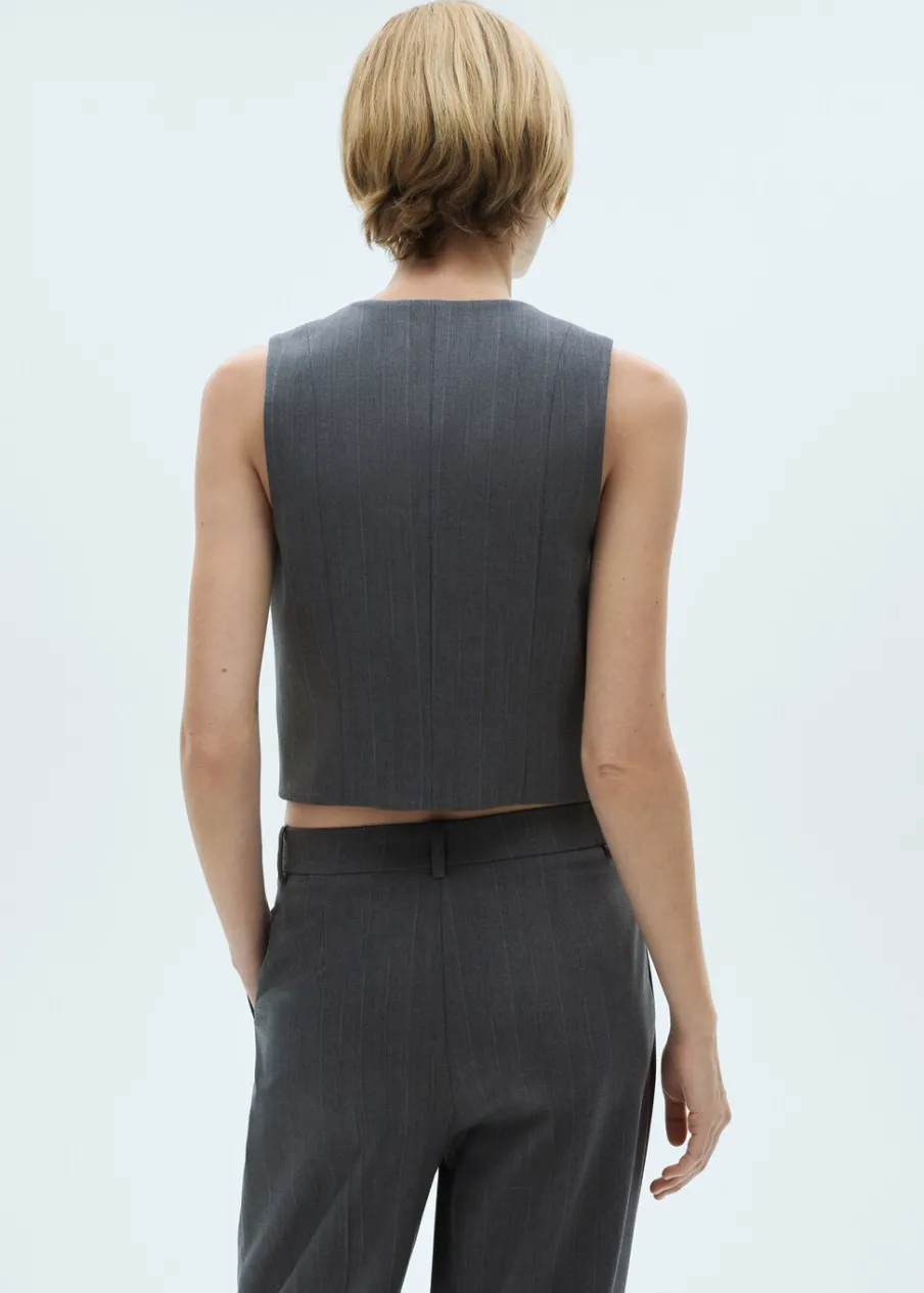 Wzór w prążki. Fason garniturowy. Model prosty. Dekolt V. Bez rękawów. Zapięcie z przodu na guziki. Wewnętrzna podszewka. Total look. Dostępne w Plus Size. Modelka ma 181 cm wzrostu i nosi rozmiar S/36.