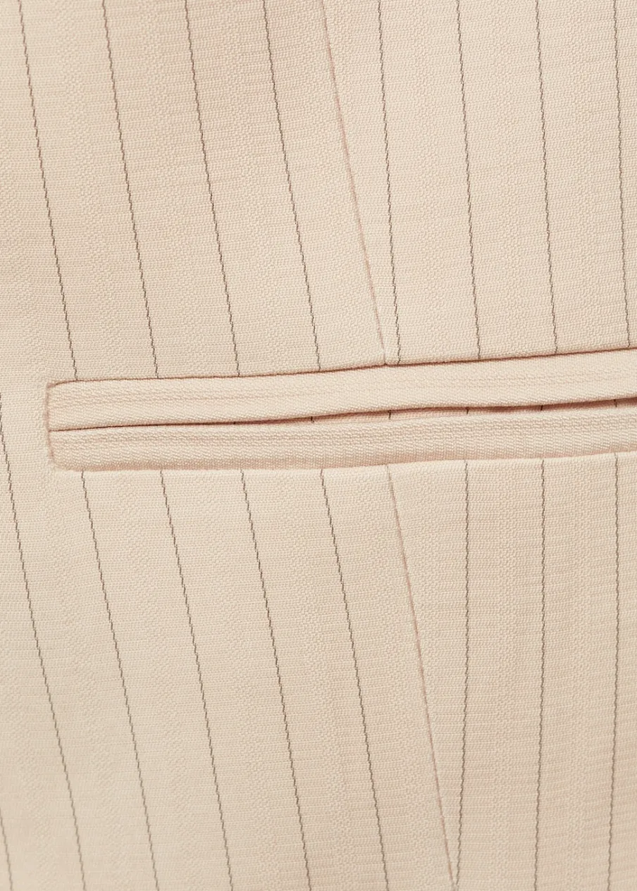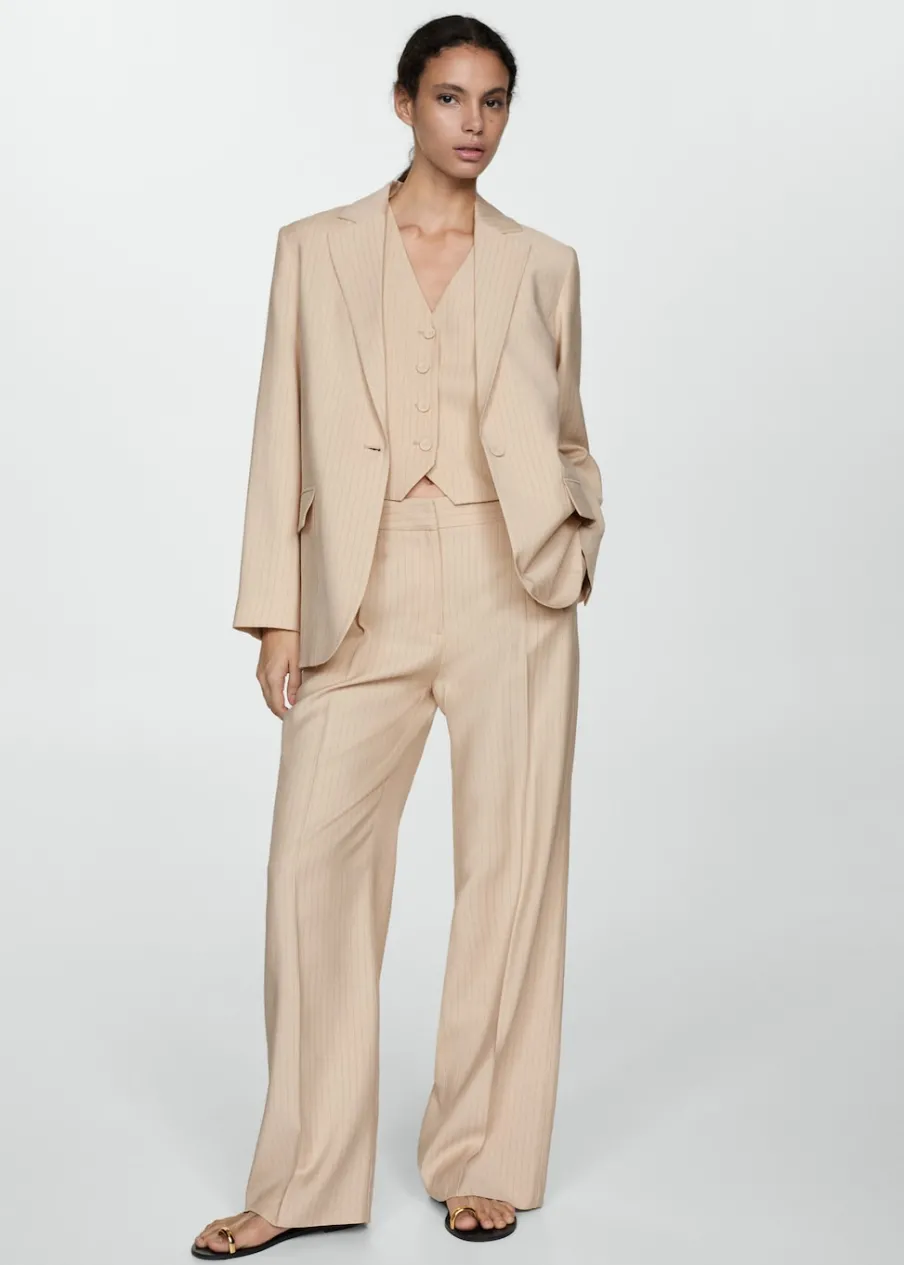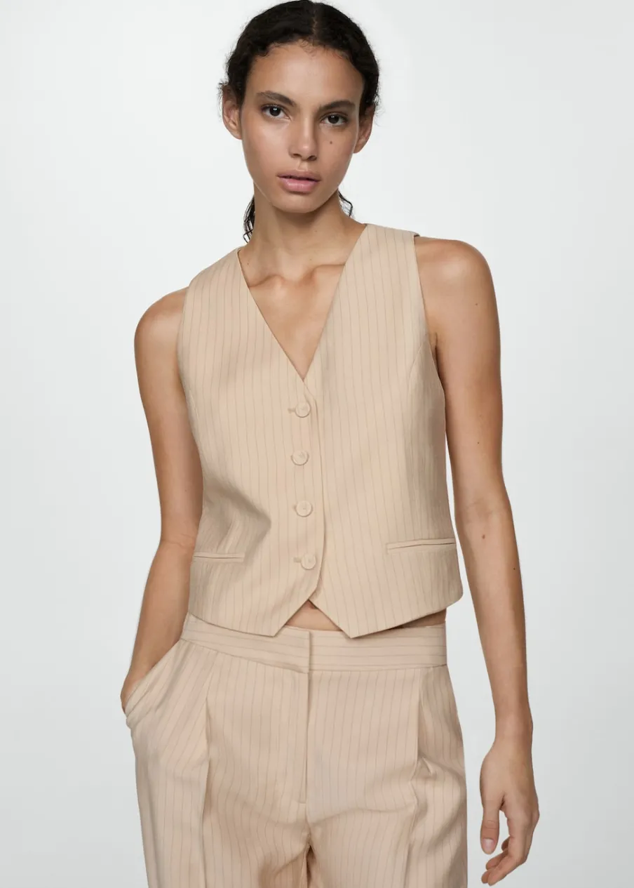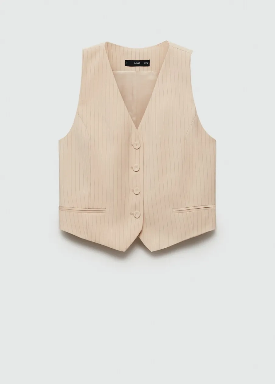 Fason garniturowy. Model prosty. Dwie kieszenie z wypustkami z przodu. Dekolt V. Bez rękawów. Total look. Wewnętrzna podszewka. Wzór w paski. Zapięcie na guziki z przodu.