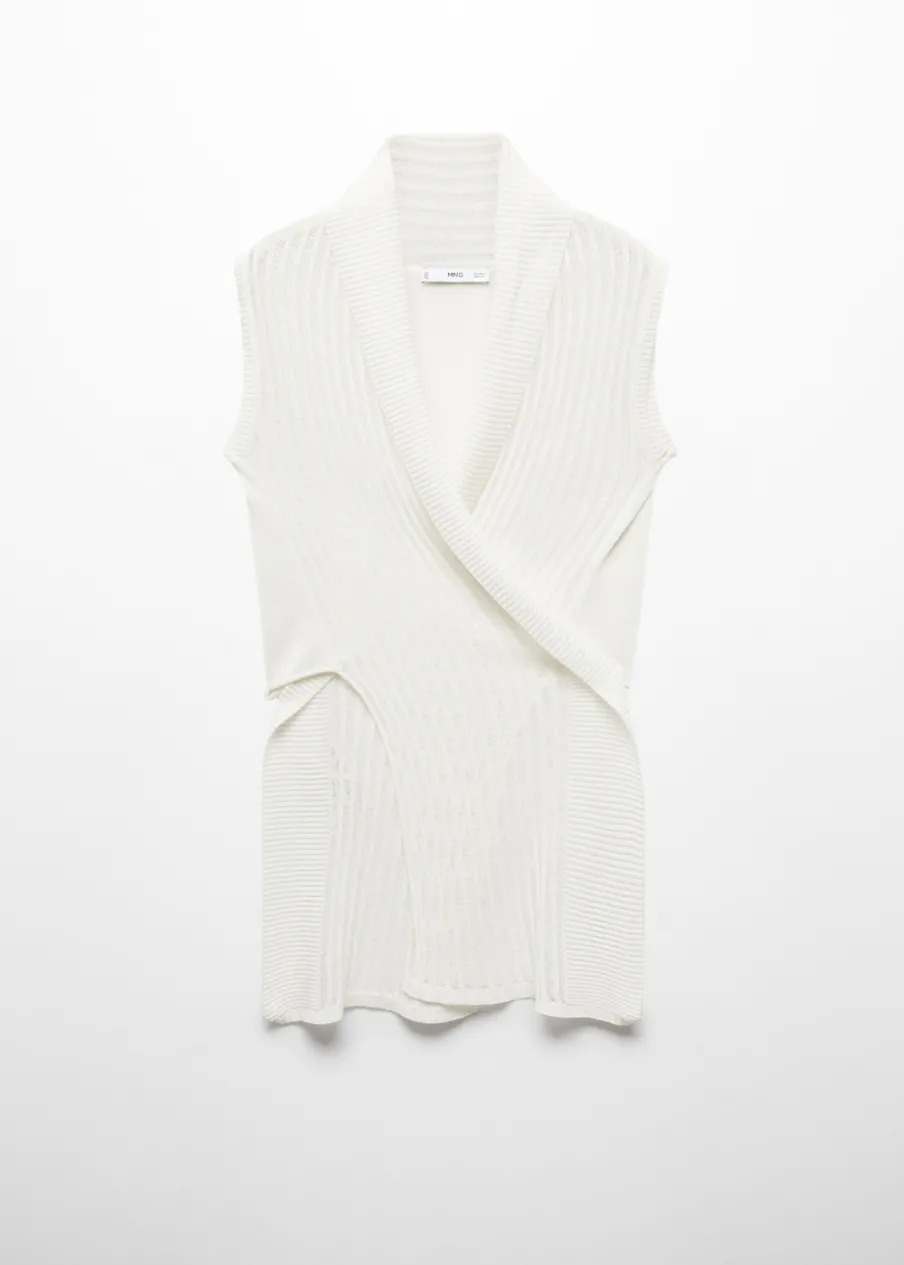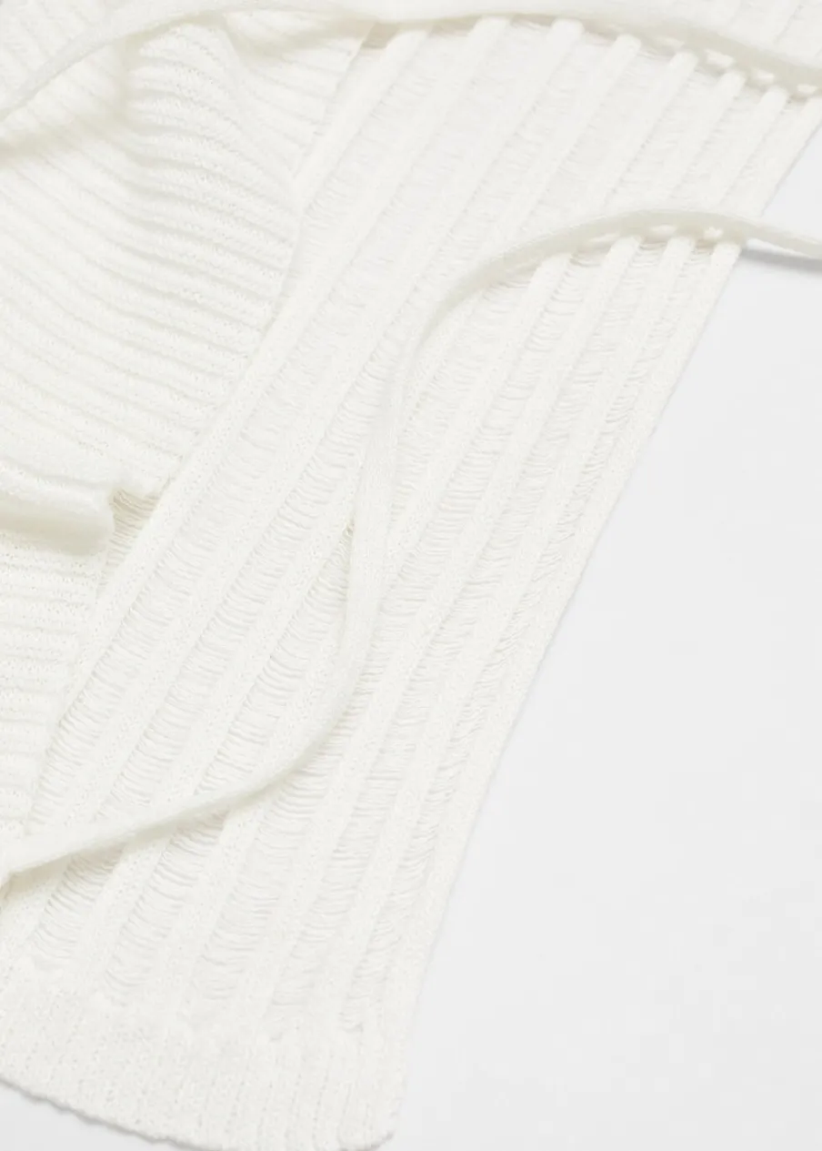 Tkanina z cienkiej dzianiny. Model prosty. Model zakładany. Dekolt V. Bez rękawów. Wiązanie z tyłu. Dzianina z ażurowym motywem.