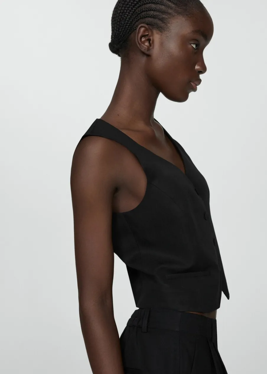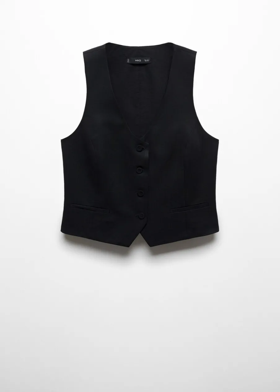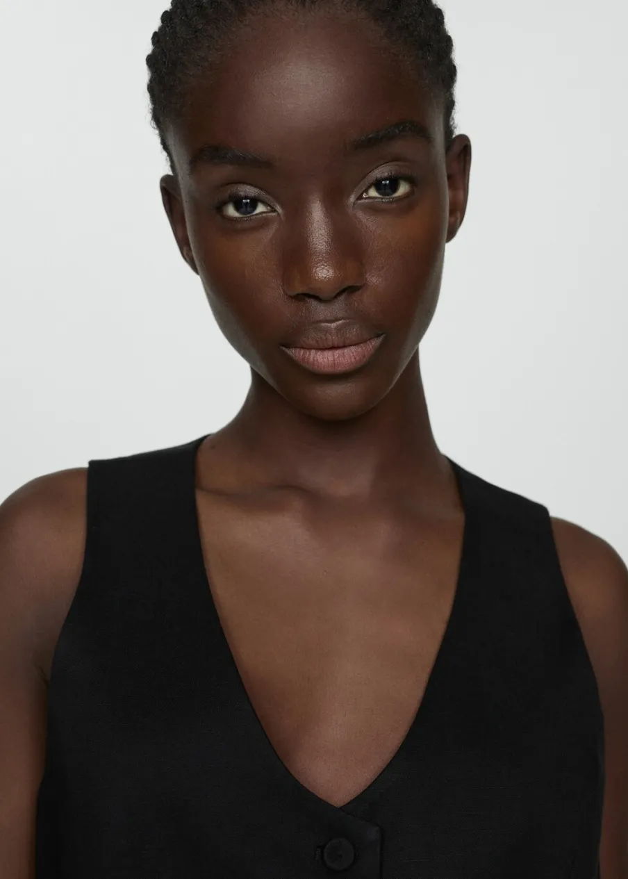 Tkanina mieszanka bawełny i lnu. Model prosty. Dekolt V. Bez rękawów. Szerokie ramiączka. Dwie wpuszczane kieszenie boczne. Wewnętrzna podszewka. Total look. Zapięcie na guziki z przodu.