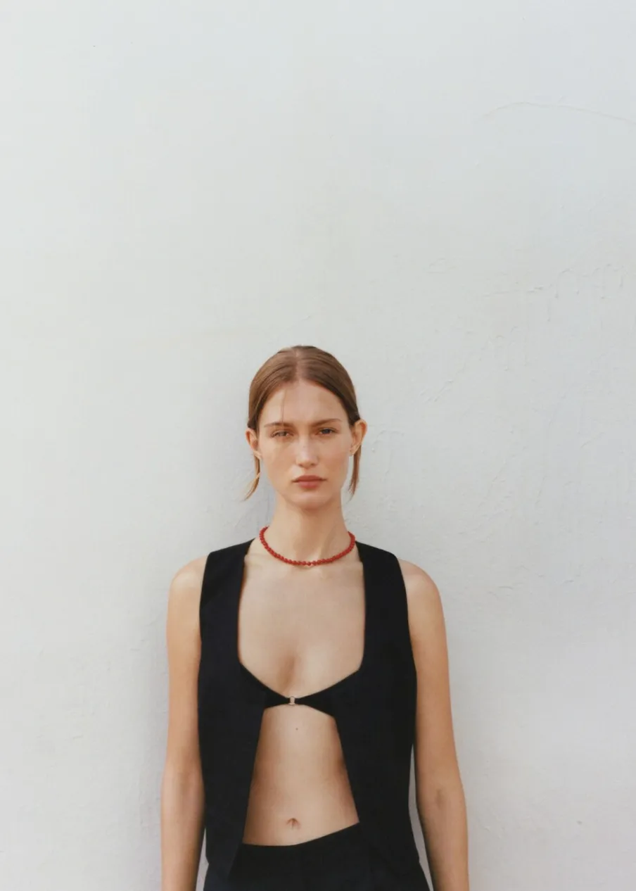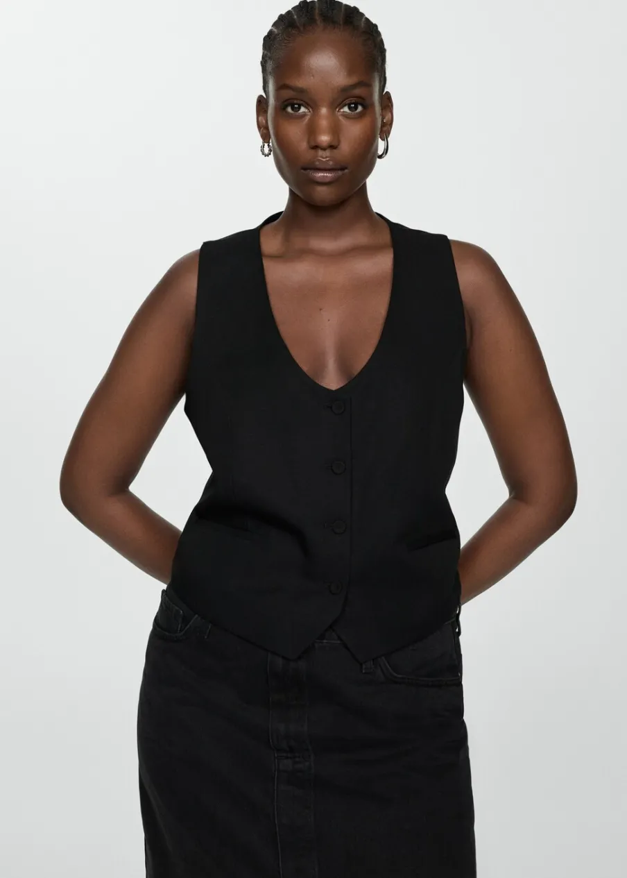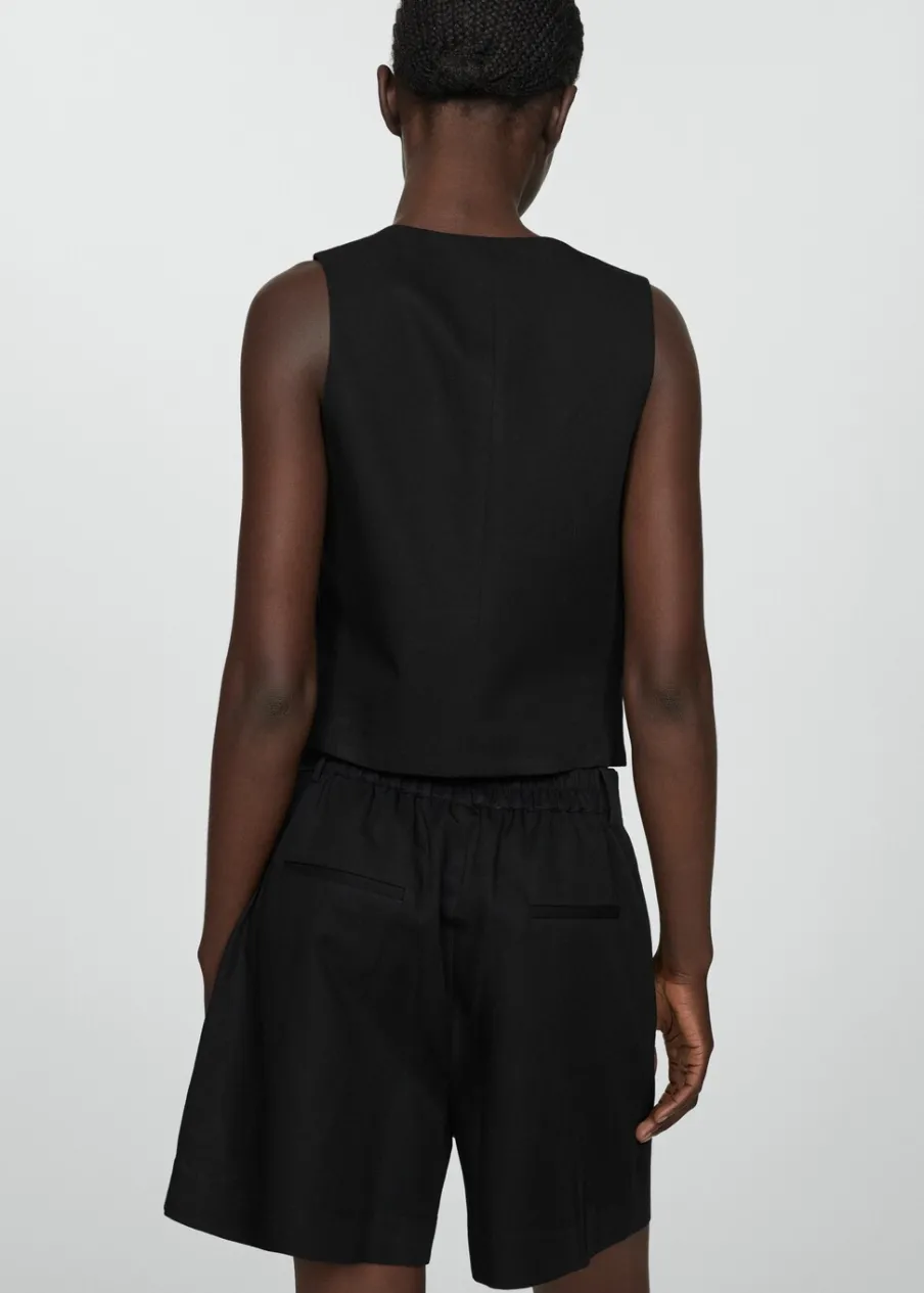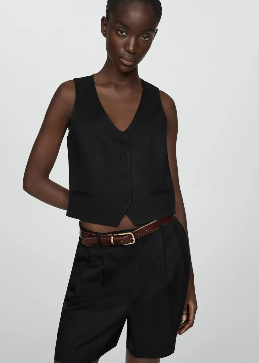Tkanina mieszanka bawełny i lnu. Model prosty. Dekolt V. Bez rękawów. Szerokie ramiączka. Dwie wpuszczane kieszenie boczne. Wewnętrzna podszewka. Total look. Zapięcie na guziki z przodu.