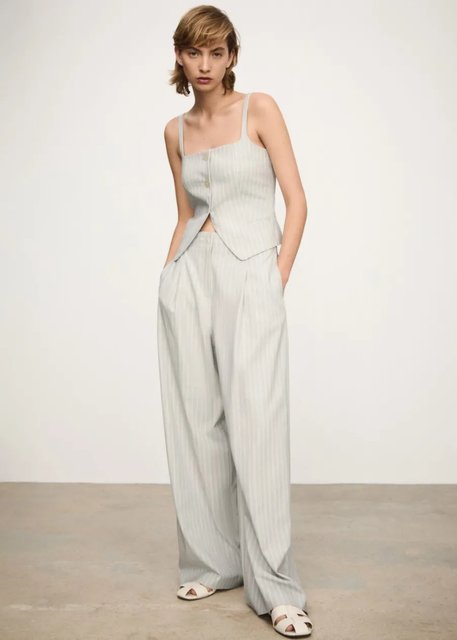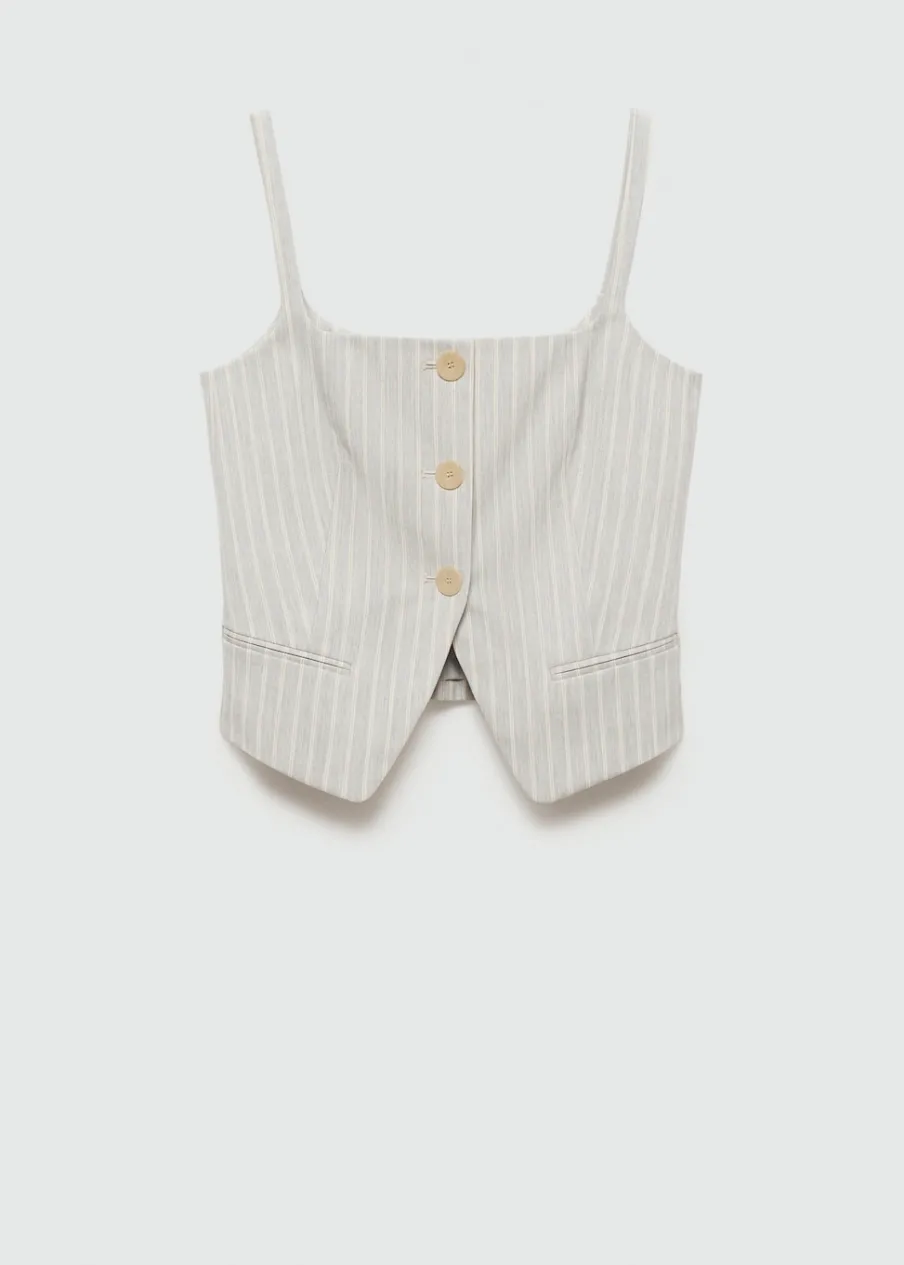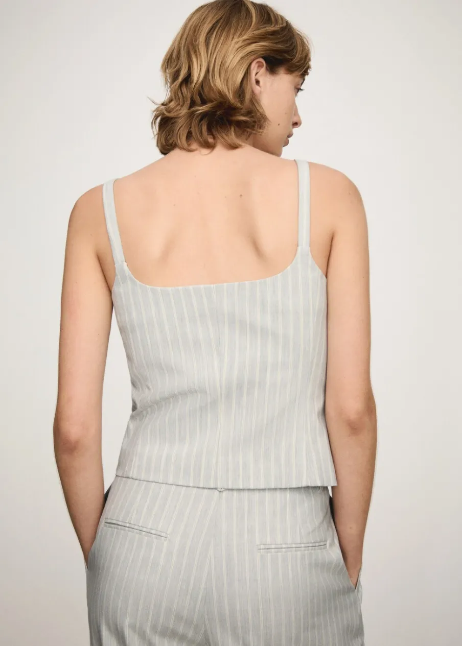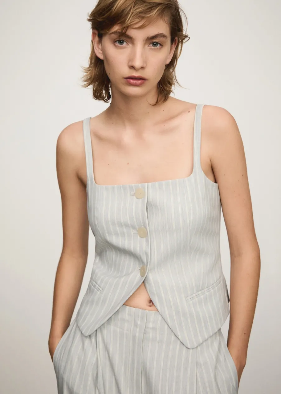 Lejąca tkanina. Model prosty. Wzór w pasy. Kwadratowy dekolt. Bez rękawów. Cienkie ramiączka. Dwie kieszenie z wypustkami z przodu. Wewnętrzna podszewka. Total look. Zapięcie na guziki z przodu.