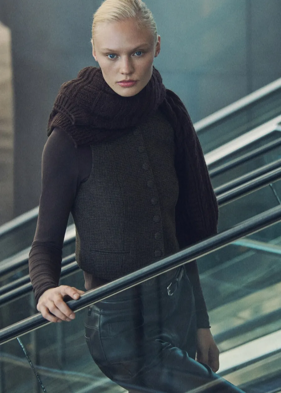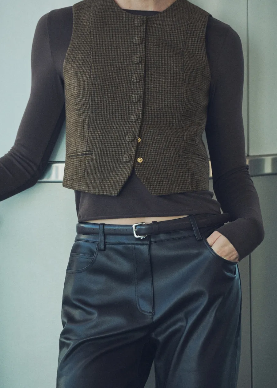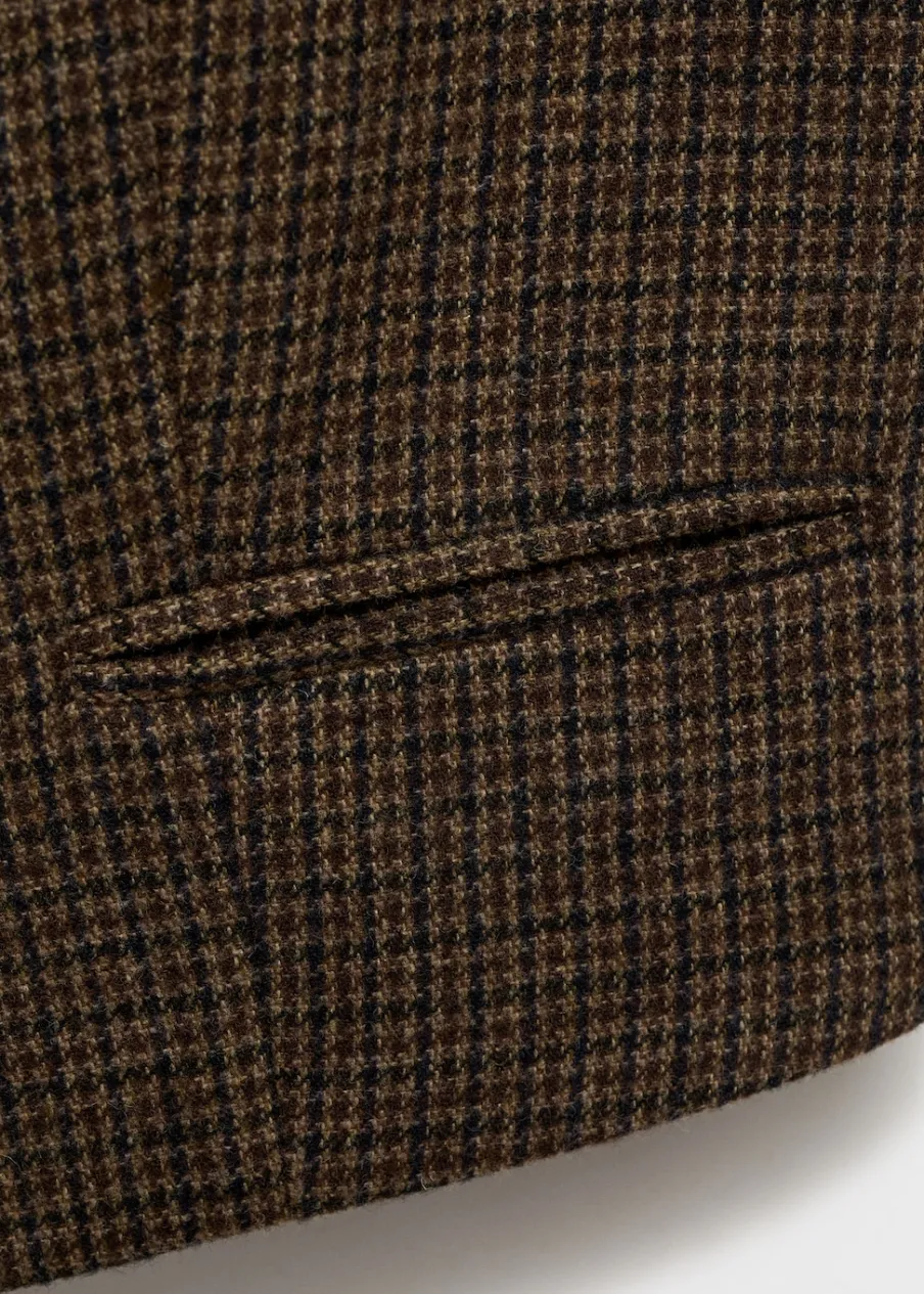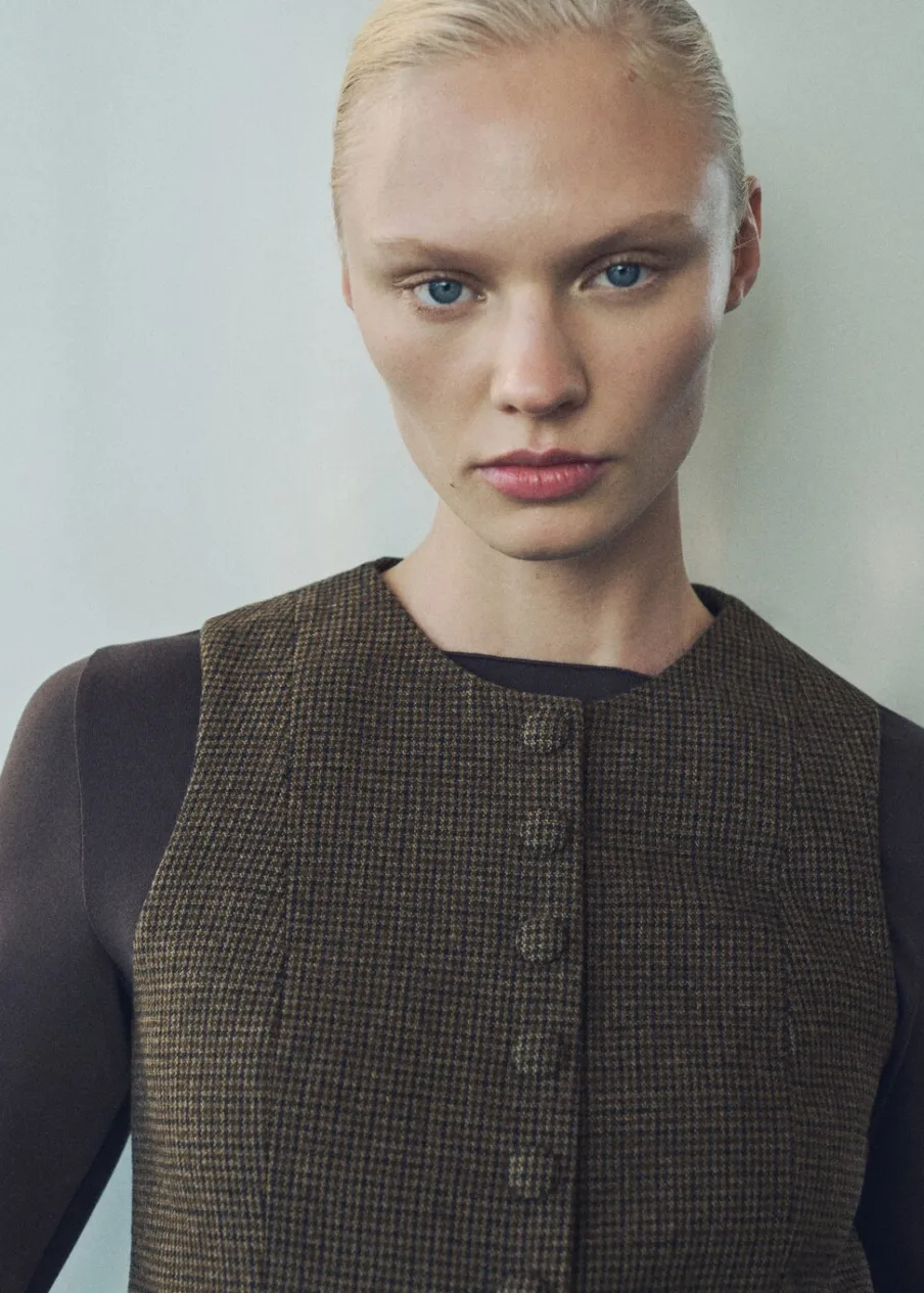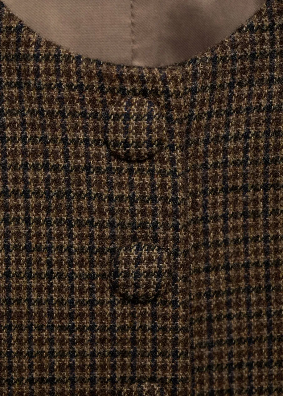 Tkanina mieszanka wełny. Model prosty. Wzór w drobną kurzą stopkę. Okrągły dekolt. Bez rękawów. Dwie wpuszczene kieszenie z przodu. Zapięcie z przodu na guziki. Wewnętrzna podszewka. Total look.