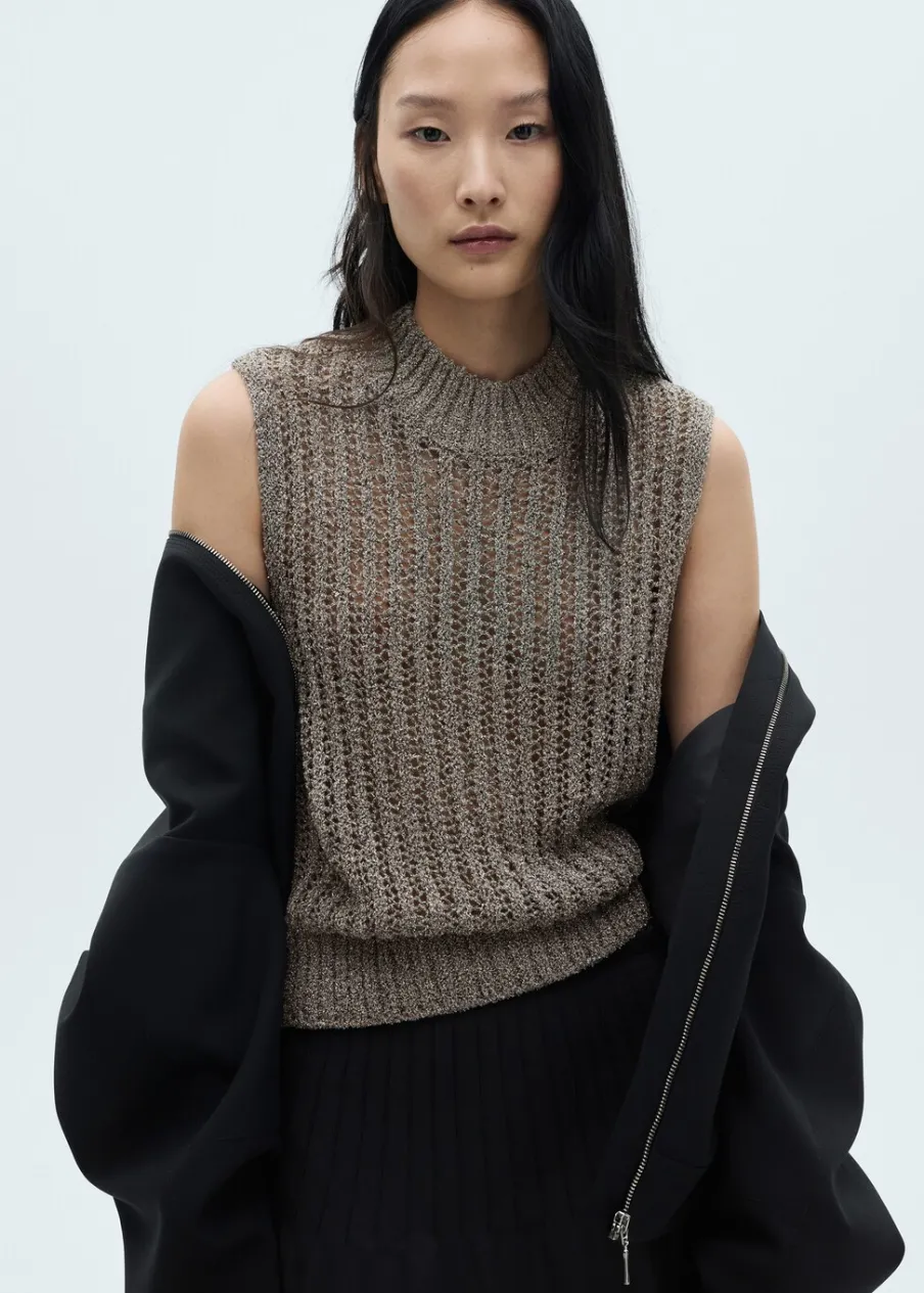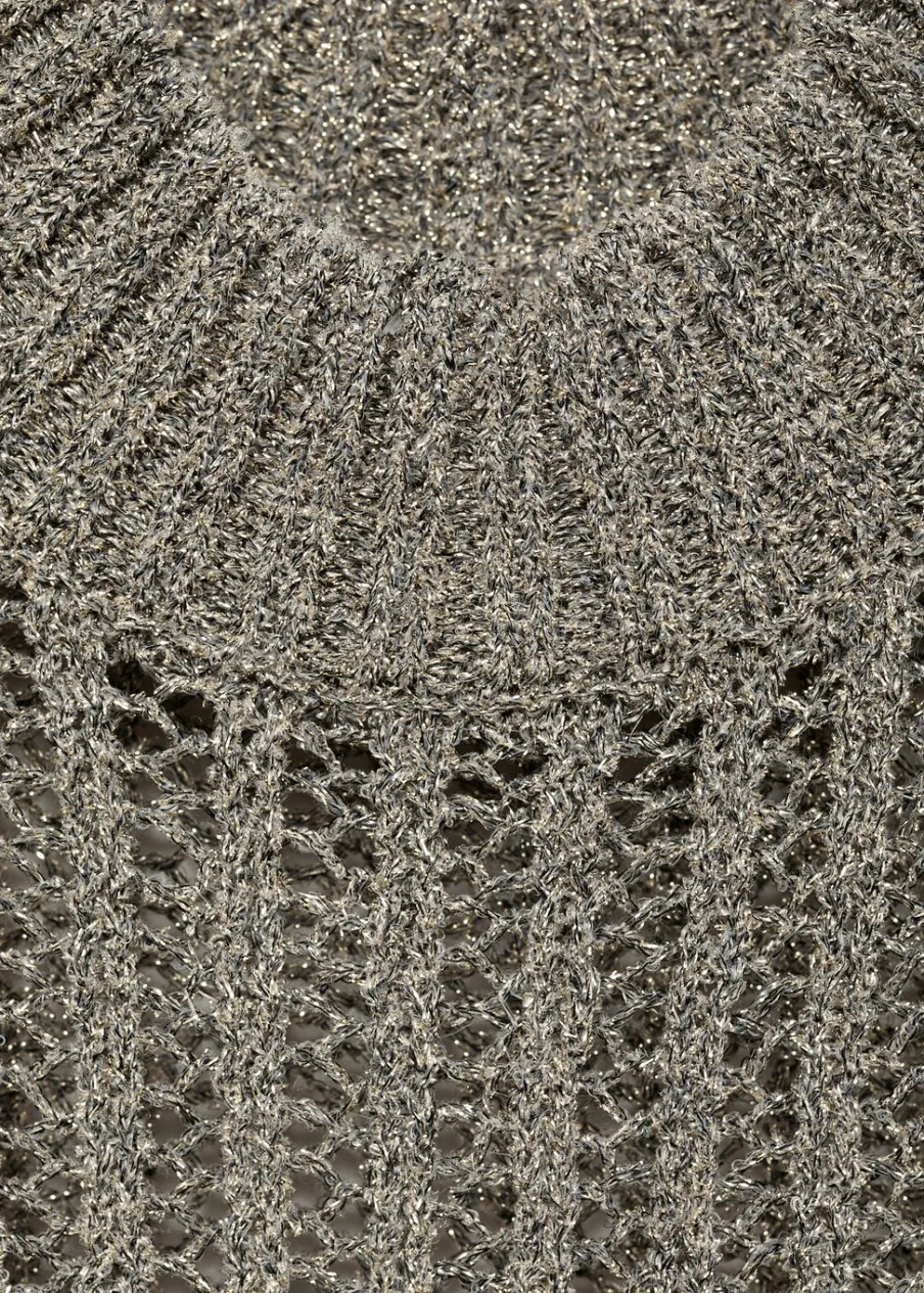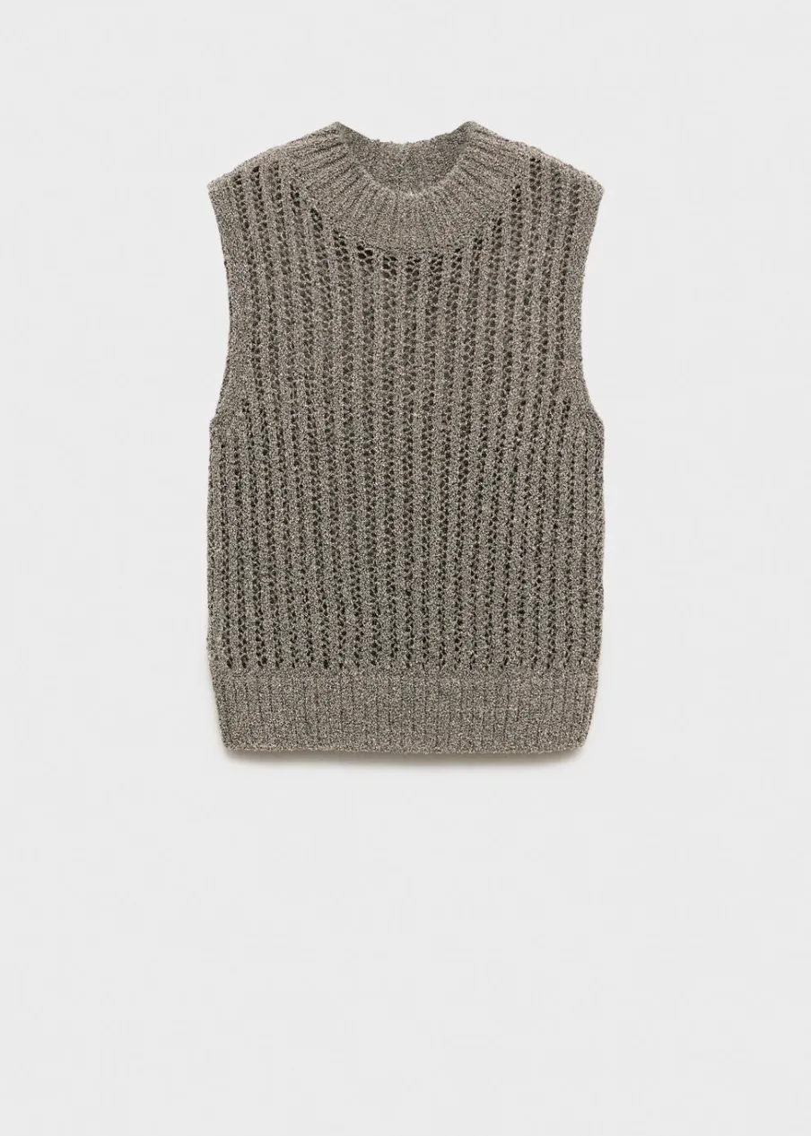 Tkanina z grubej dzianiny. Ażurowa dzianina. Tkanina lureks. Model prosty. Półgolf. Bez rękawów. Modelka ma 175 cm wzrostu i nosi rozmiar S/36.