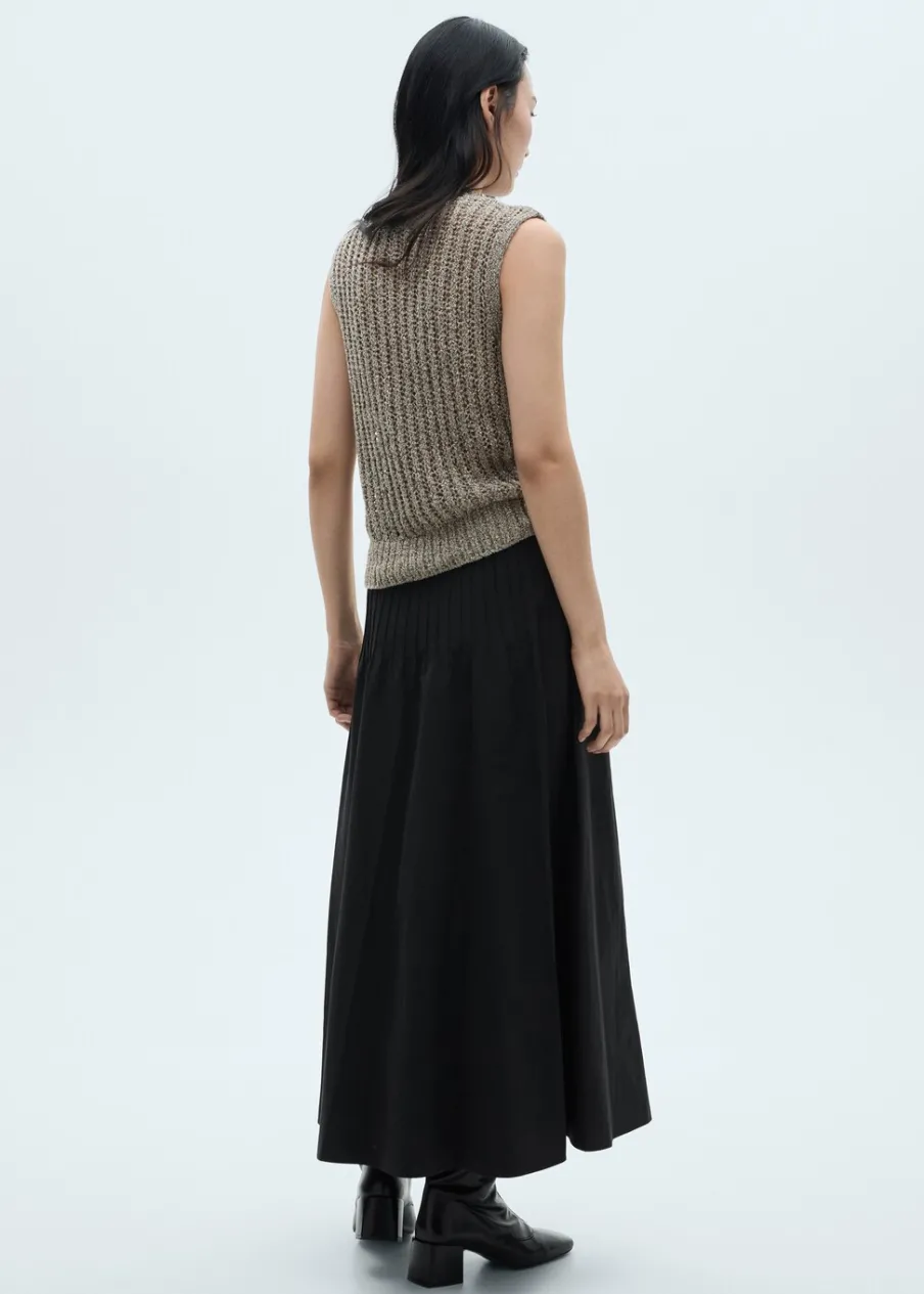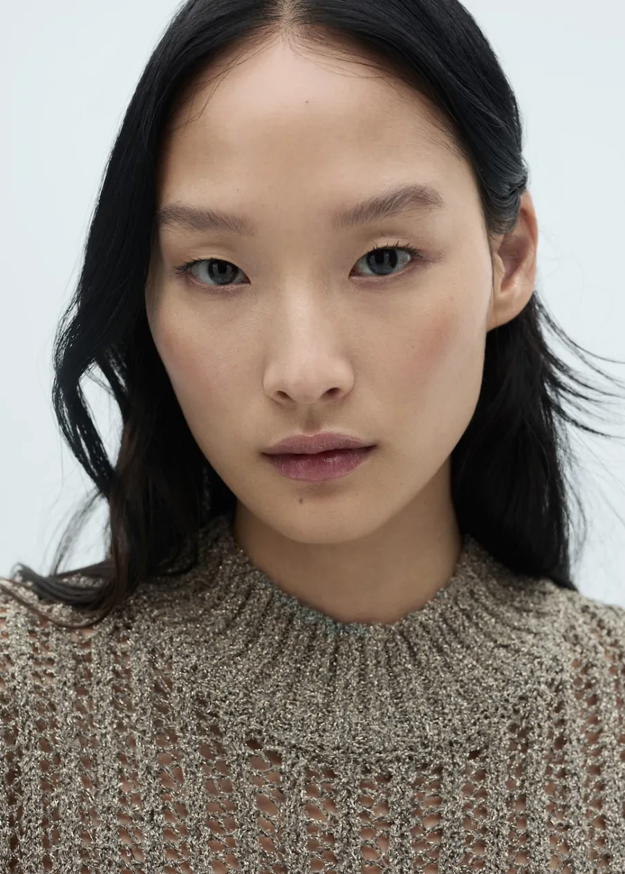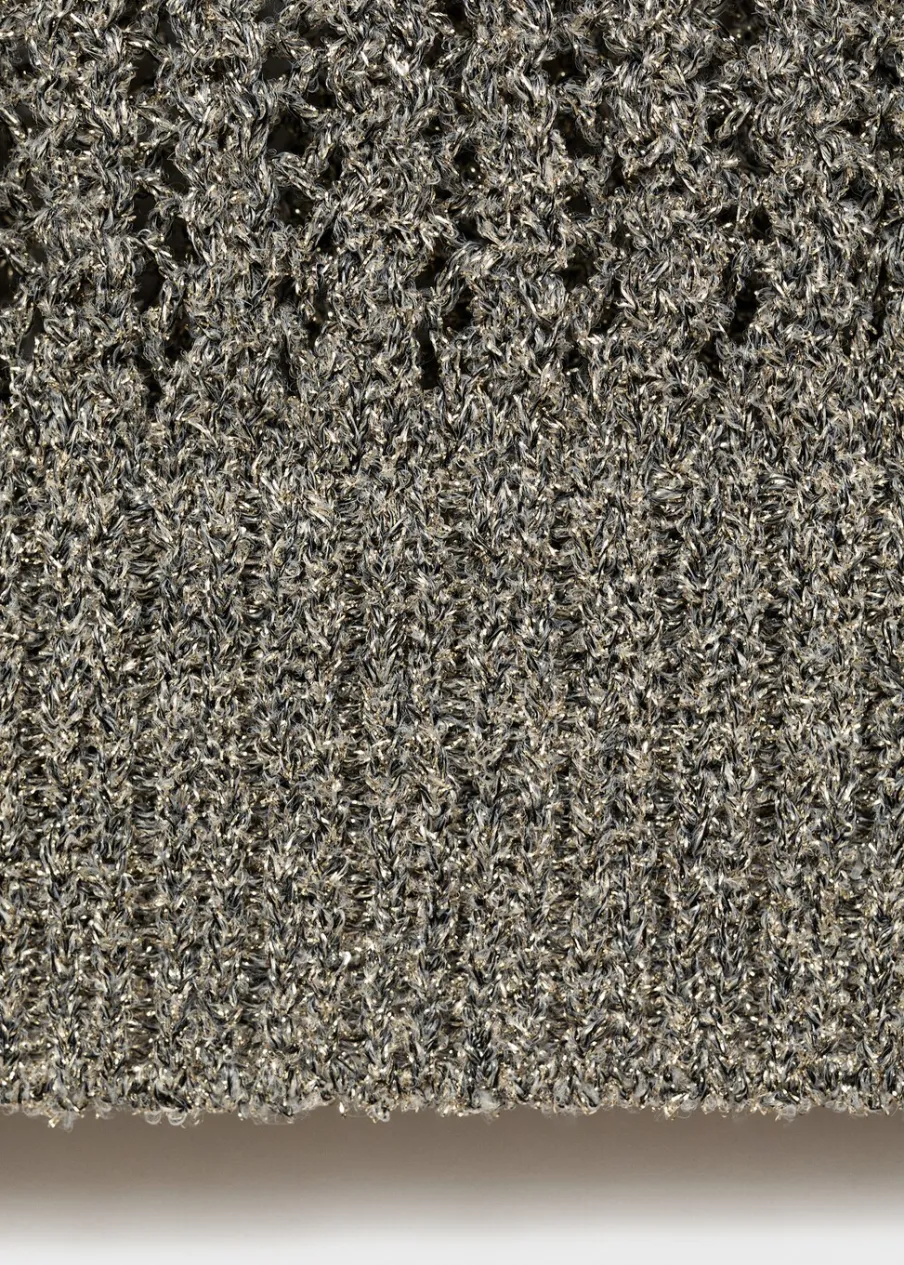 Tkanina z grubej dzianiny. Ażurowa dzianina. Tkanina lureks. Model prosty. Półgolf. Bez rękawów. Modelka ma 175 cm wzrostu i nosi rozmiar S/36.