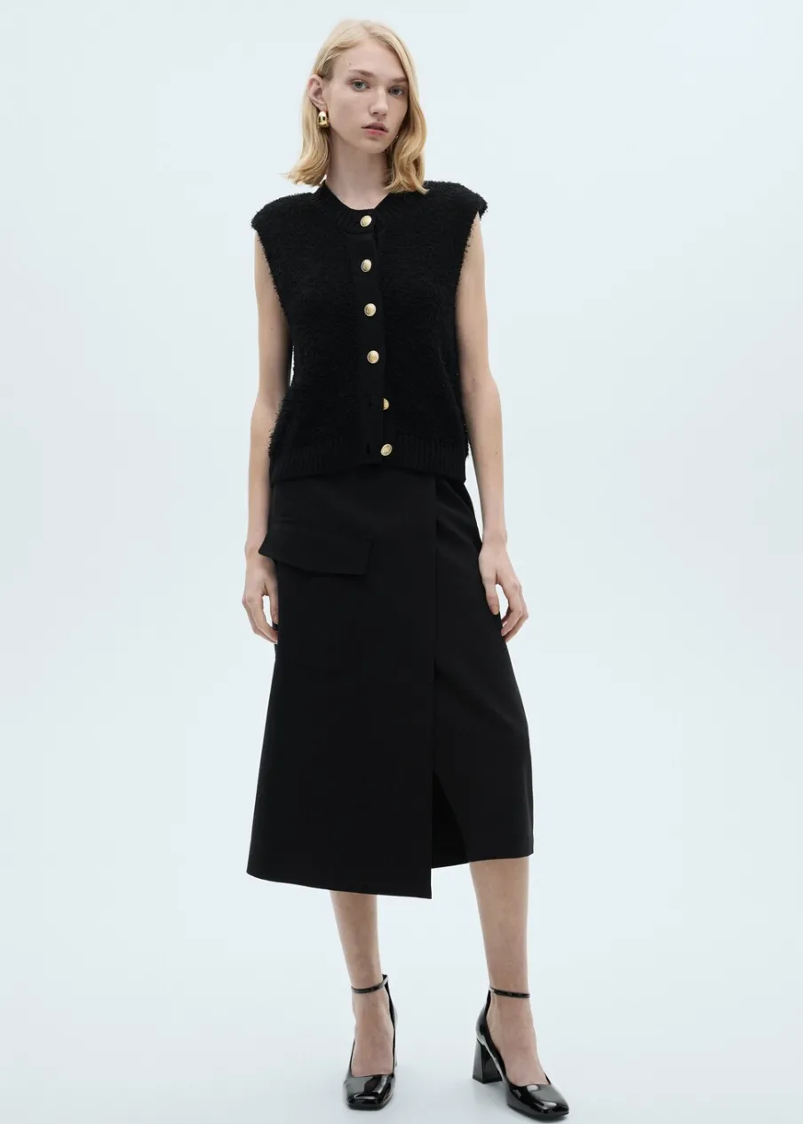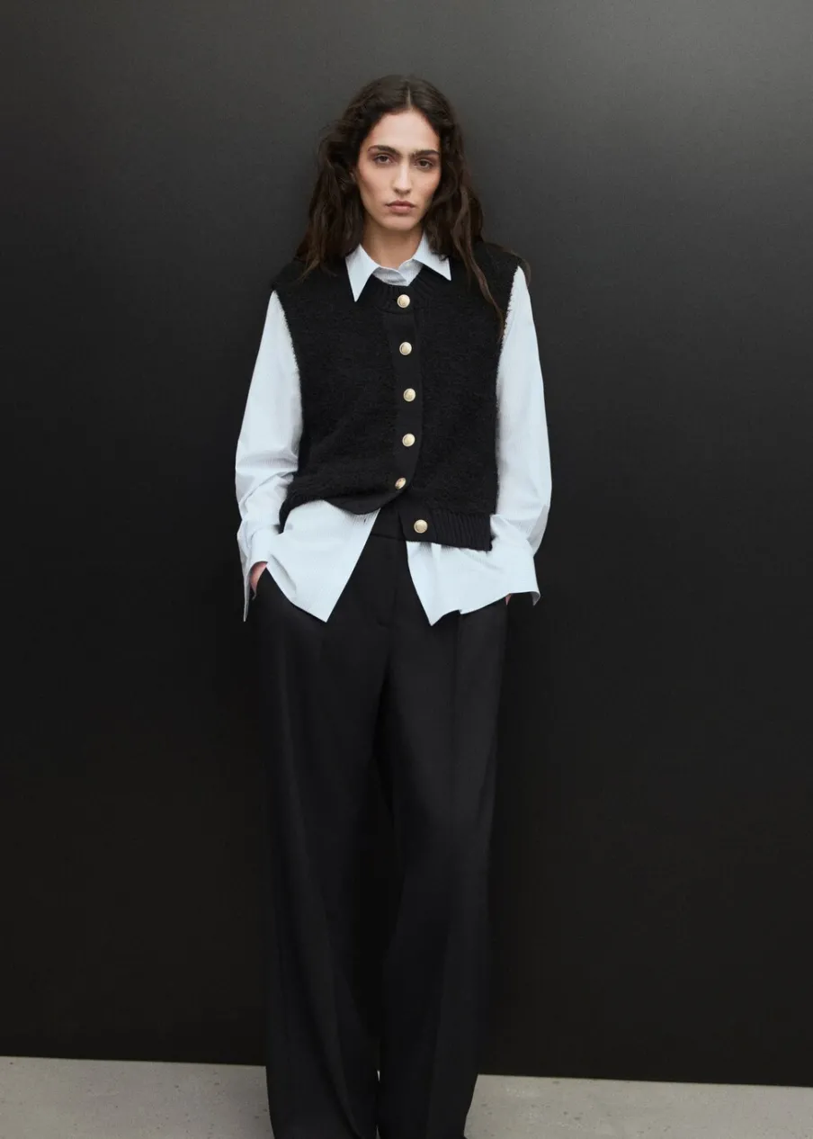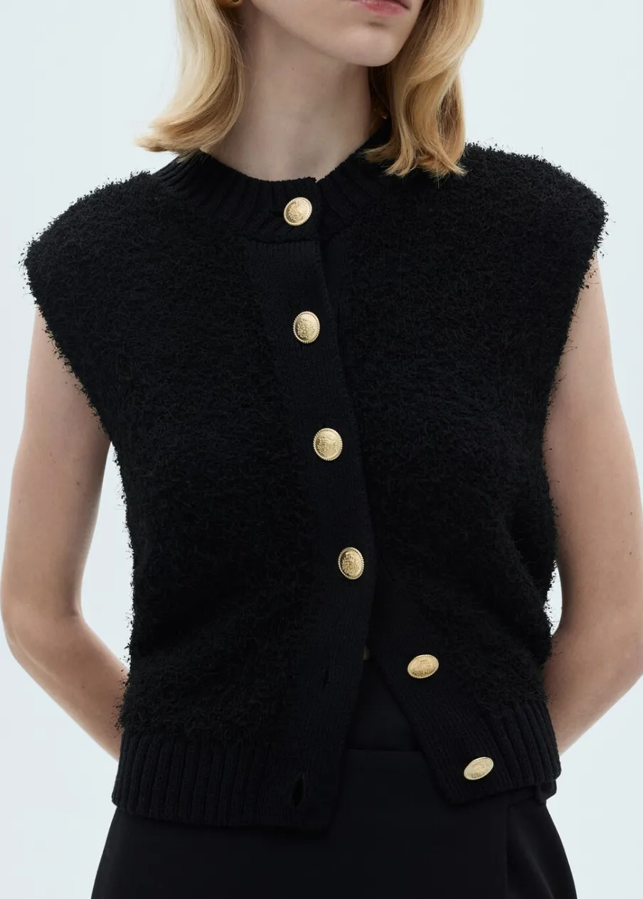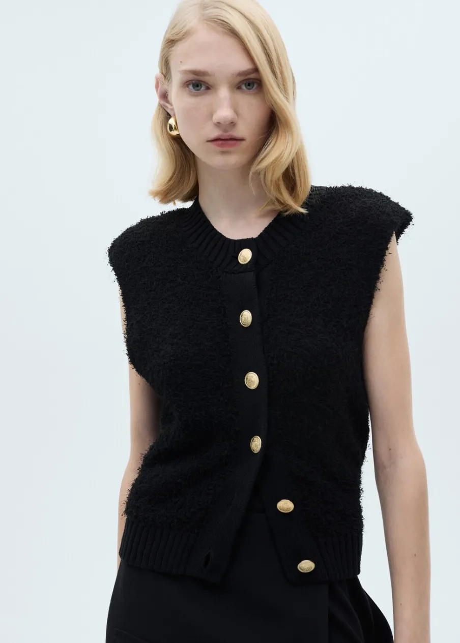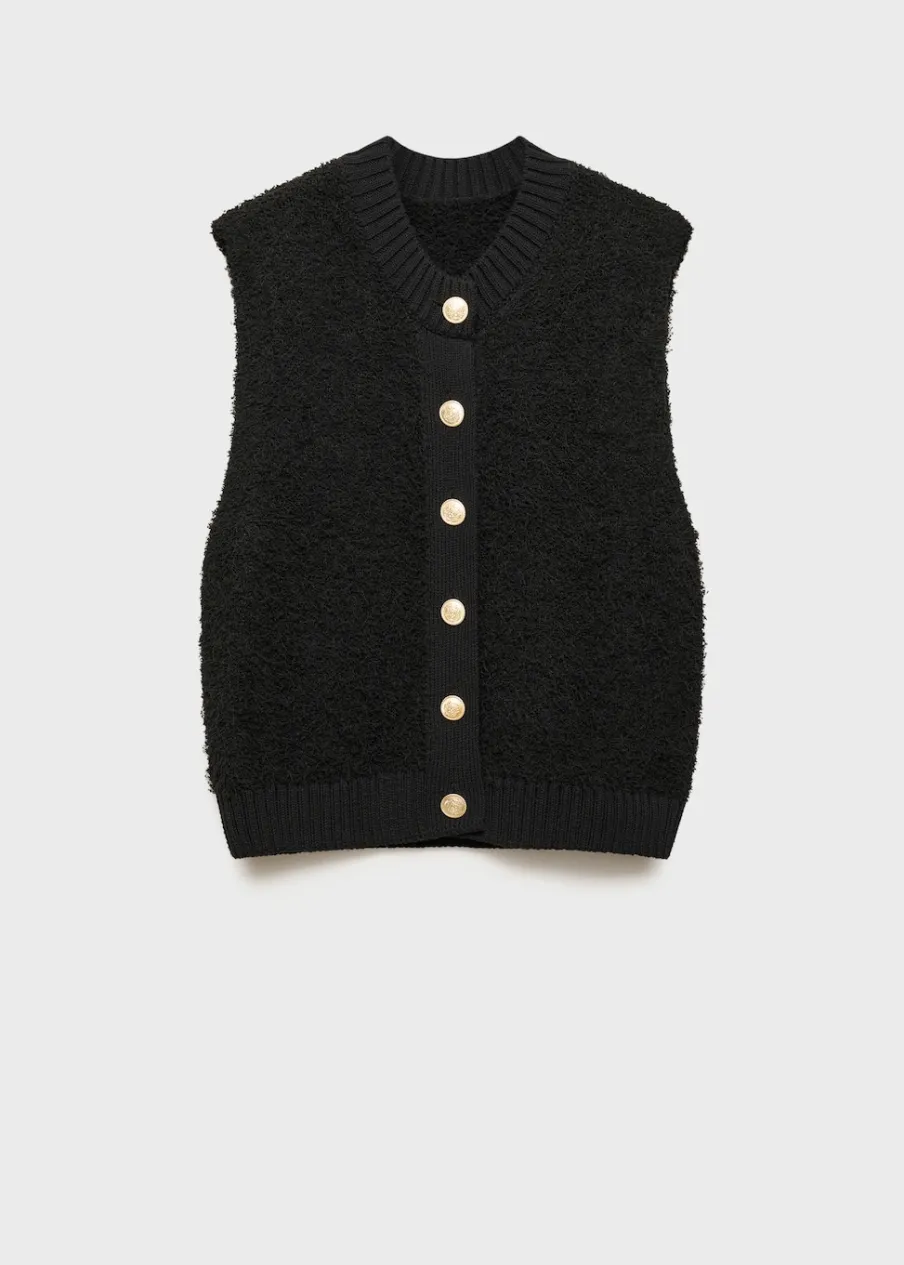 Model standardowy. Dzianina średniej grubości. Model prosty. Okrągły dekolt. Dzianinowa tkanina. Ściągaczowe wykończenia. Bez rękawów. Zapięcie na guziki z przodu.