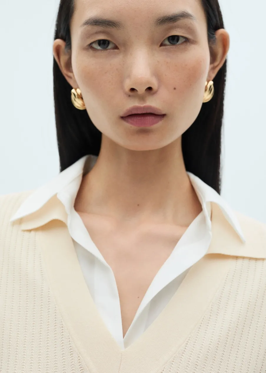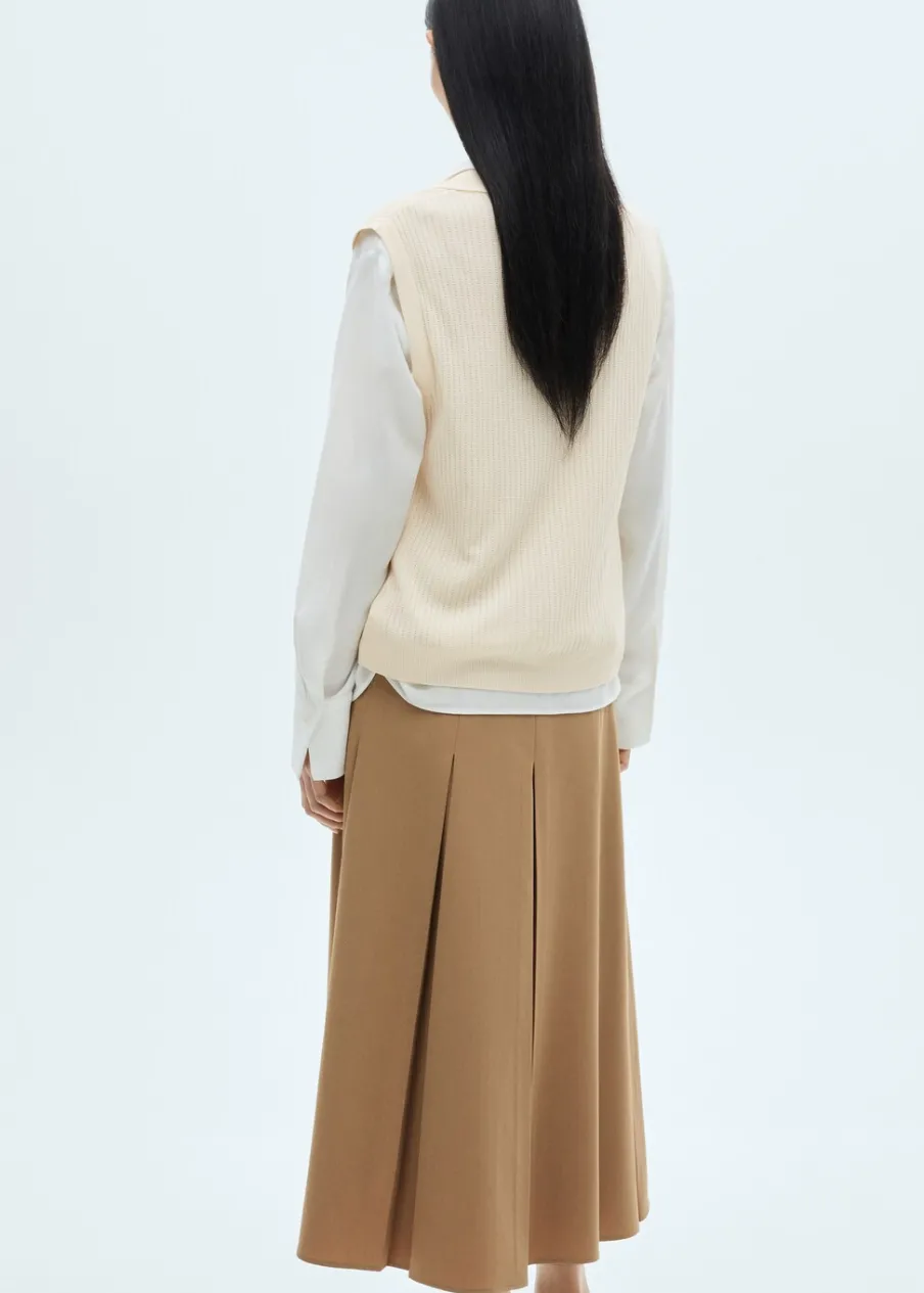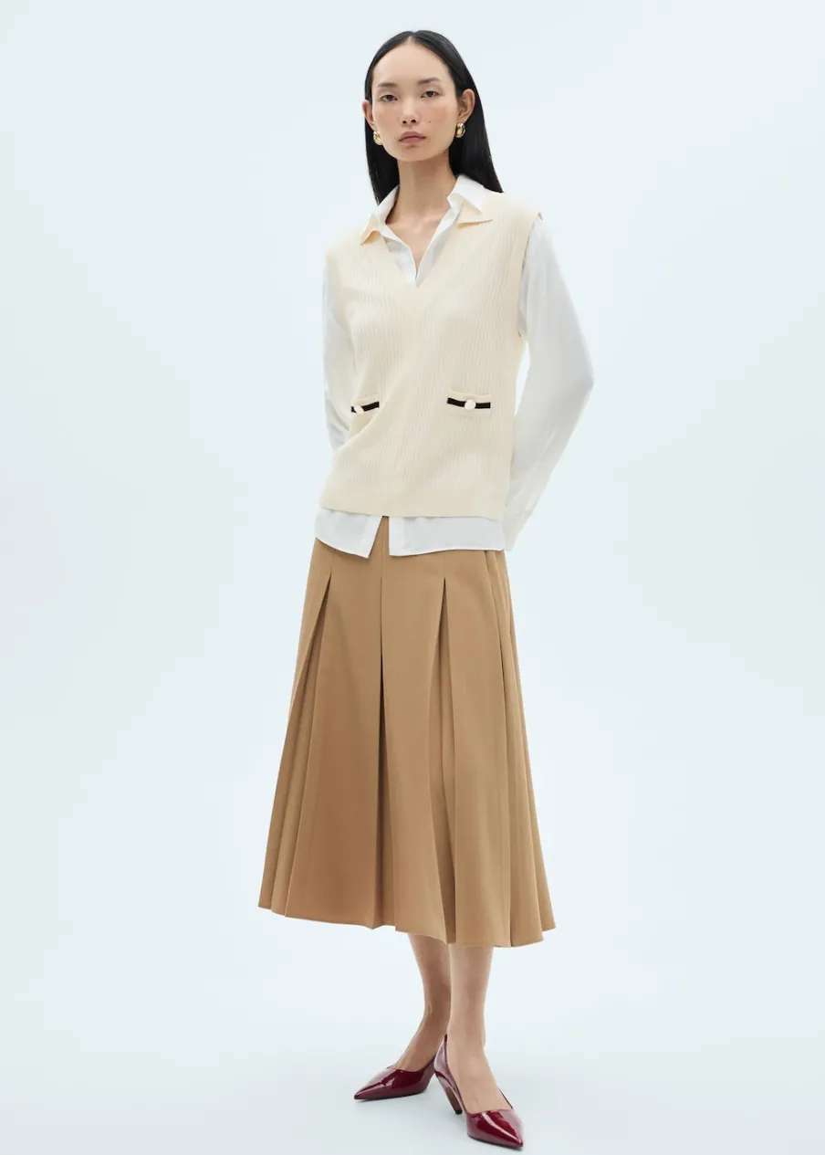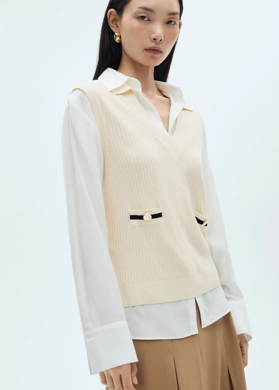 Tkanina z cienkiej dzianiny. Model standardowy. Model prosty. Dekolt V. Bez rękawów. Dwie kieszenie z wypustkami z przodu. Kontrastowe kieszenie. Bez zapięcia. Bez podszewki.