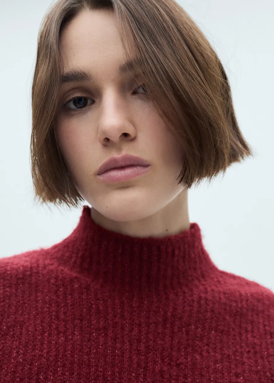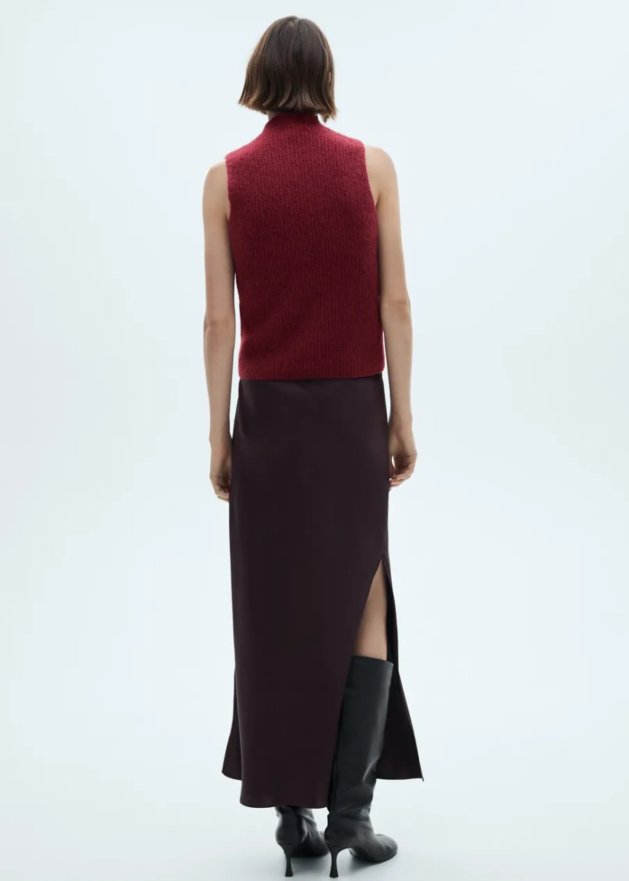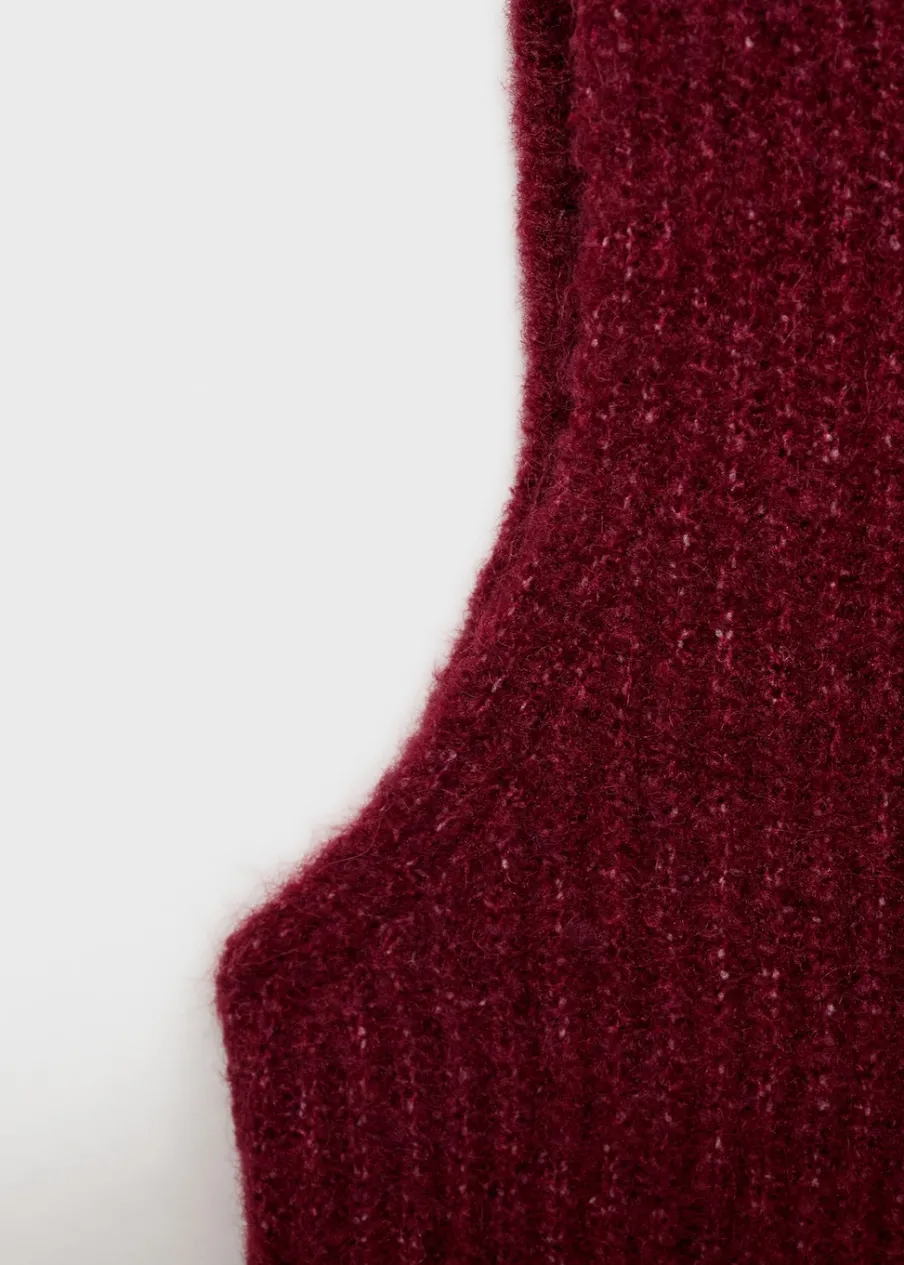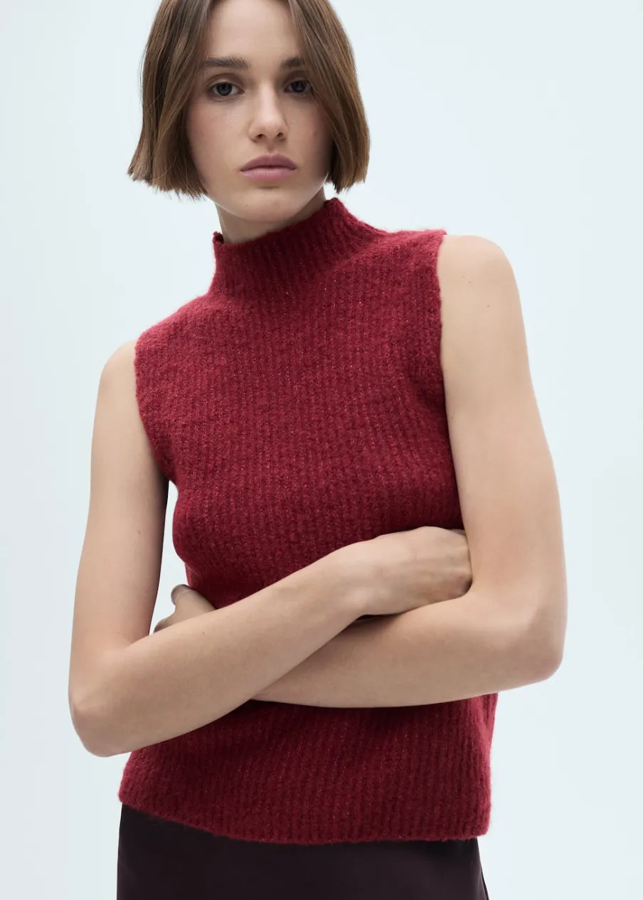 Dzianinowa tkanina. Tkanina mieszanka wełny. Model prosty. Półgolf. Bez rękawów. Bez zapięcia. Modelka ma 178 cm wzrostu i nosi rozmiar S/36.