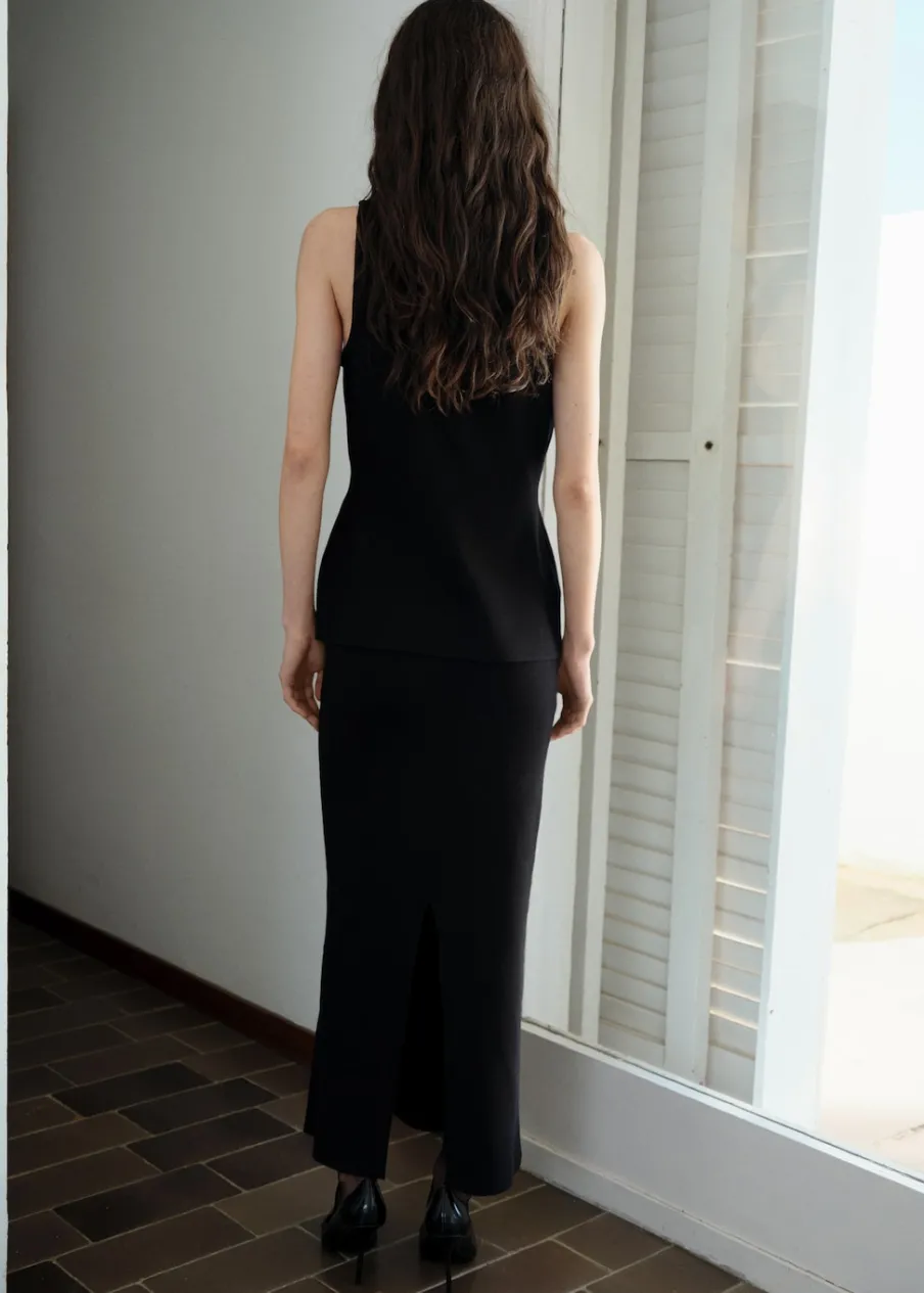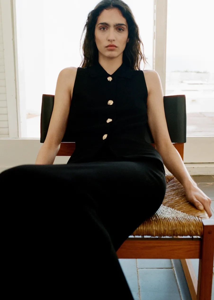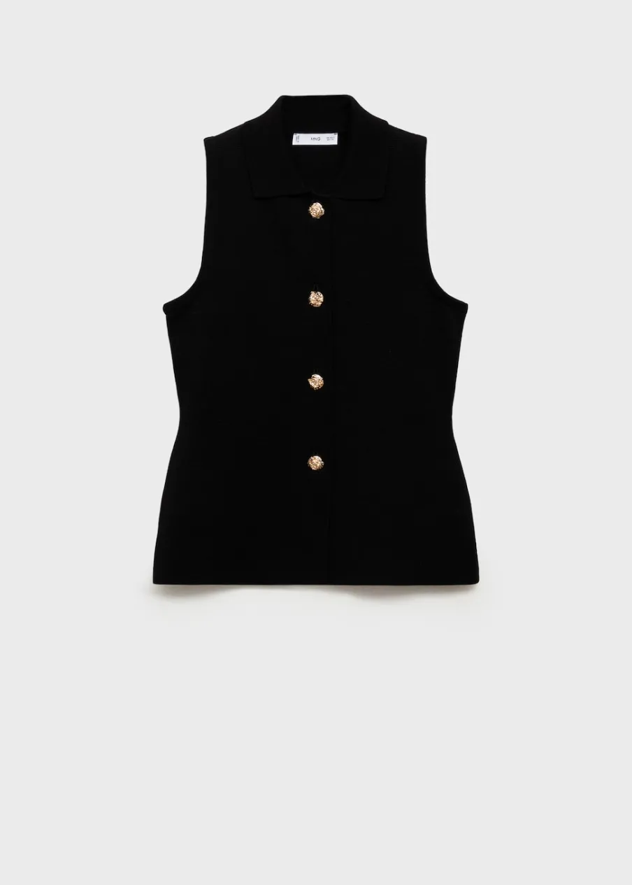 Dzianina. Model wcięty. Model długi. Koszulowy kołnierz. Bez rękawów. Zapięcie na guziki u dołu. Biżuteryjne guziki. Total look.
