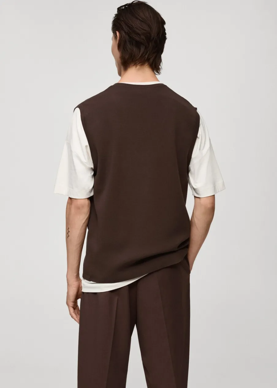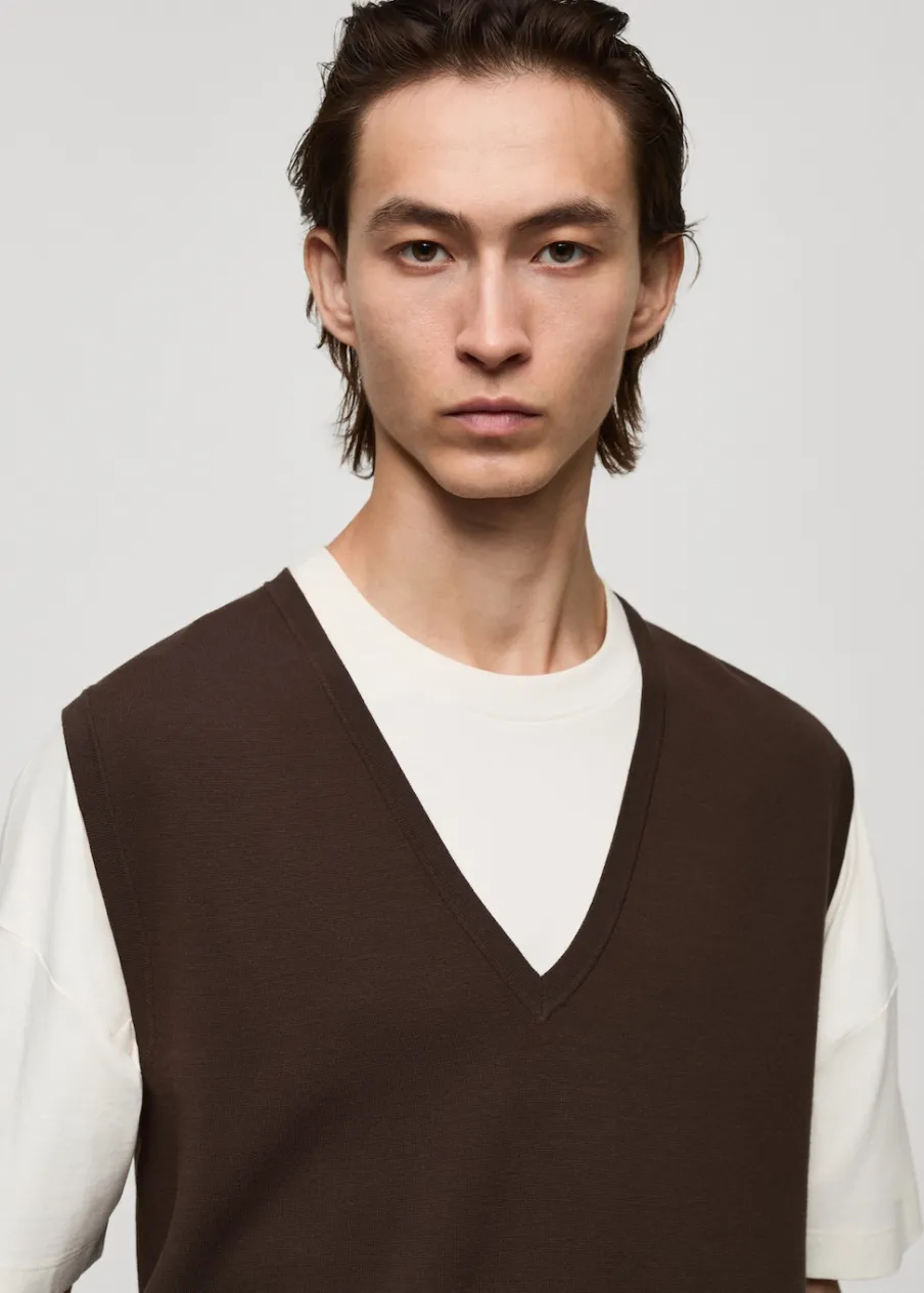 OpisTkanina z cienkiej dzianiny. Dekolt V. Bez rękawów. Prosty dół. Model ma 185 cm wzrostu i nosi rozmiar M.